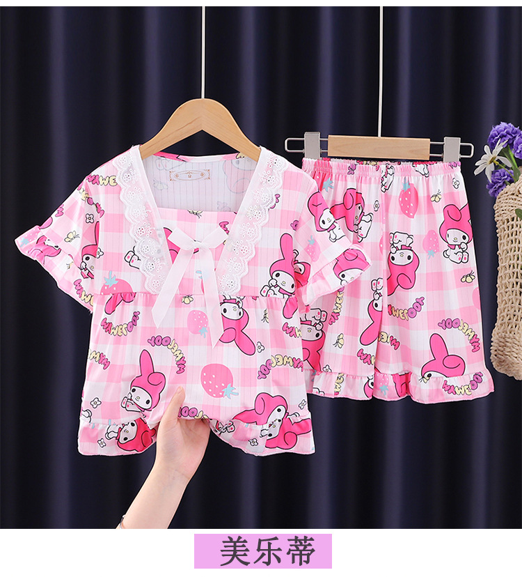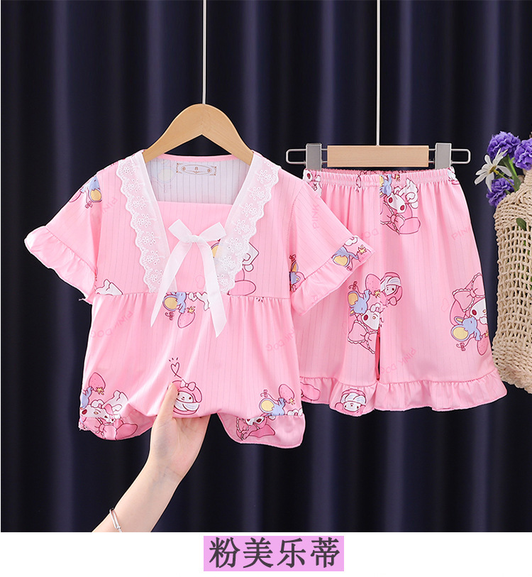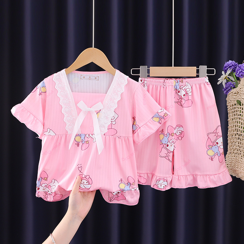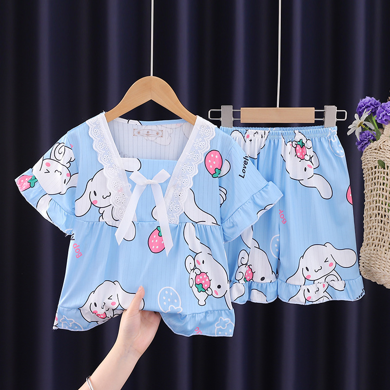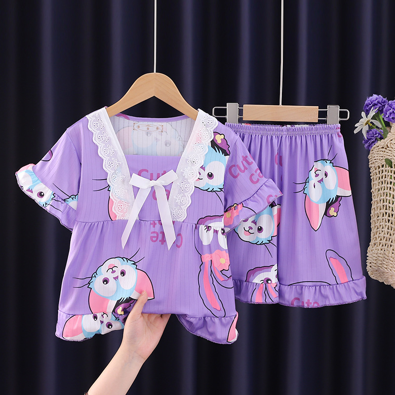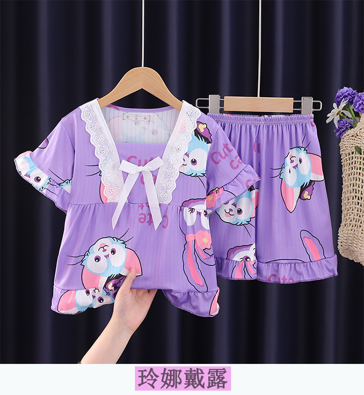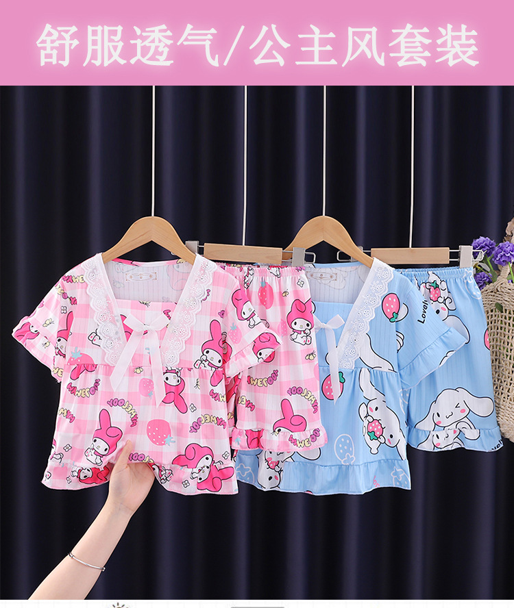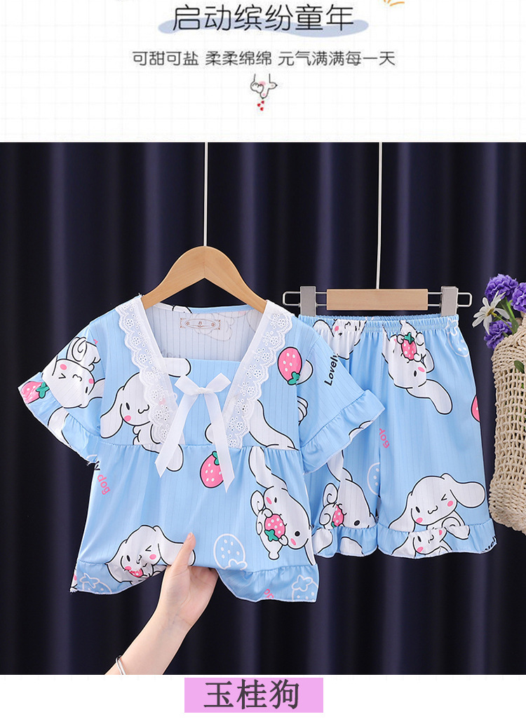 어린이 잠옷 여름 반팔 얇은 레이스 칼라 달콤한 만화 어린이 소녀 아기 중간 및 큰 어린이 가정 옷 세트