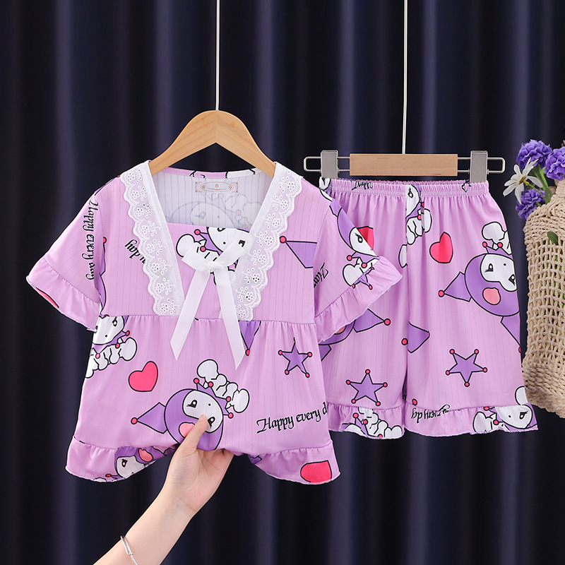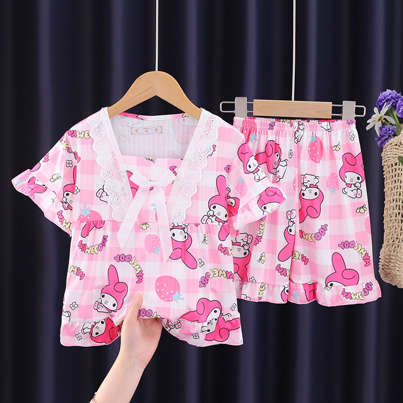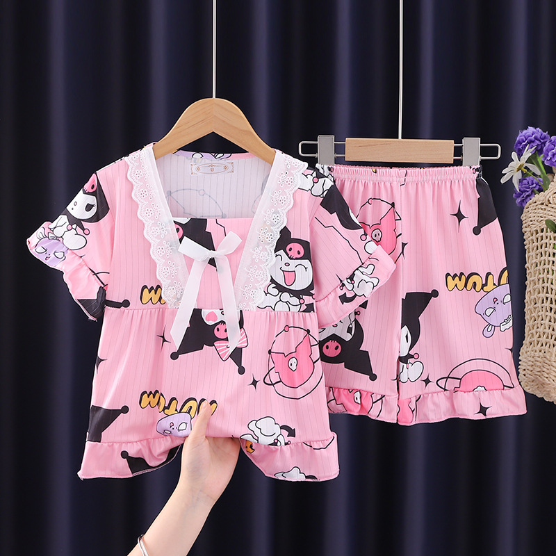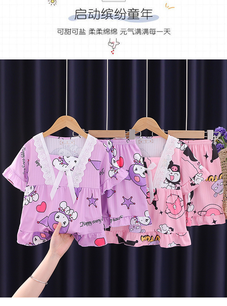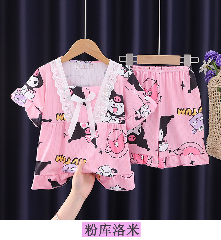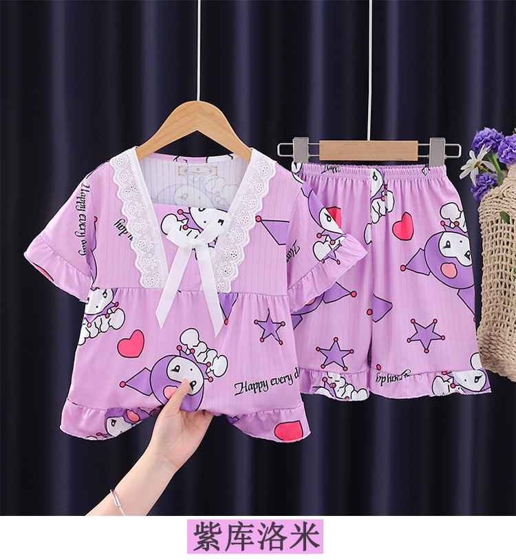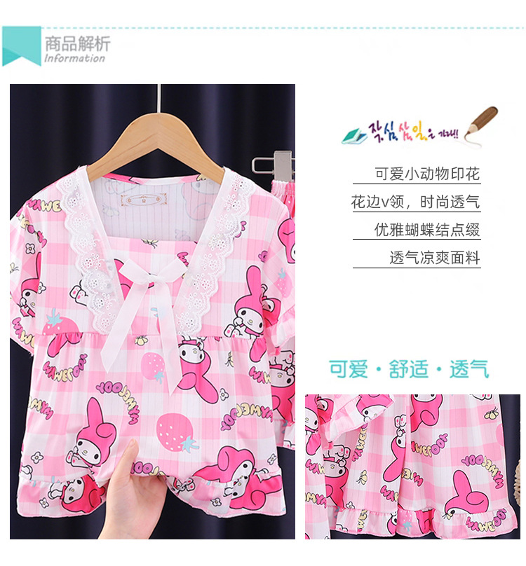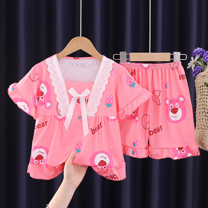 어린이 잠옷 여름 반팔 얇은 레이스 칼라 달콤한 만화 어린이 소녀 아기 중간 및 큰 어린이 가정 옷 세트