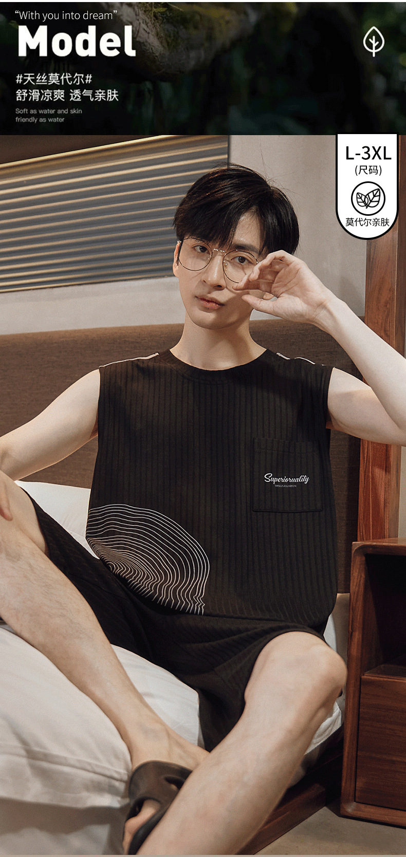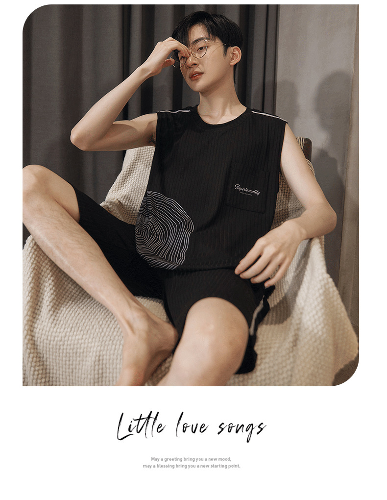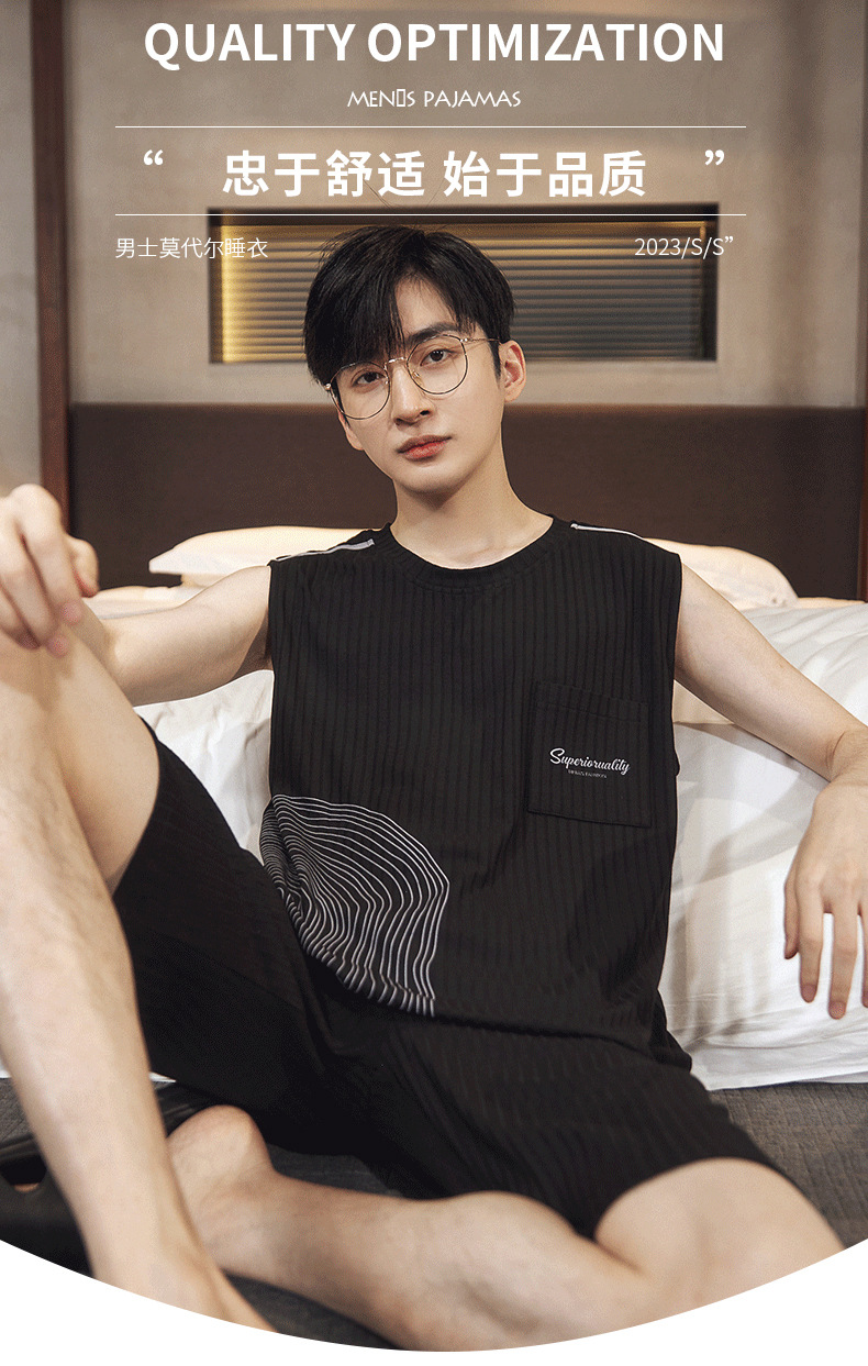 모달 쿨 느낌 잠옷 남자 여름 조끼 반바지 여름 얇은 캐주얼 솔리드 컬러 세트