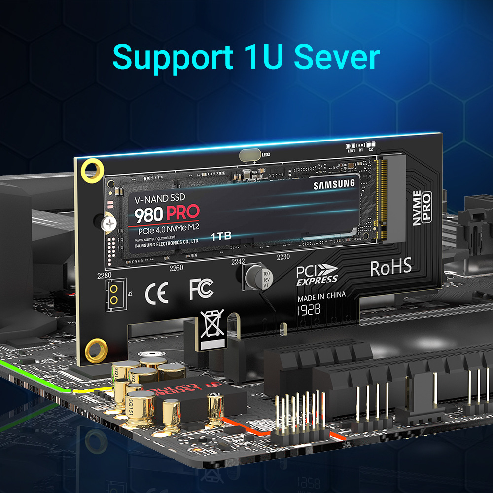 It is built with a high-quality capacitor and gold-plated interface to ensure information security and stable transmission. The vented design on immersion gold PCB enhances heat dissipation of SSD. Comes with a bracket, the best choice for a 2U case.