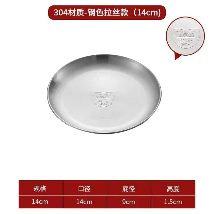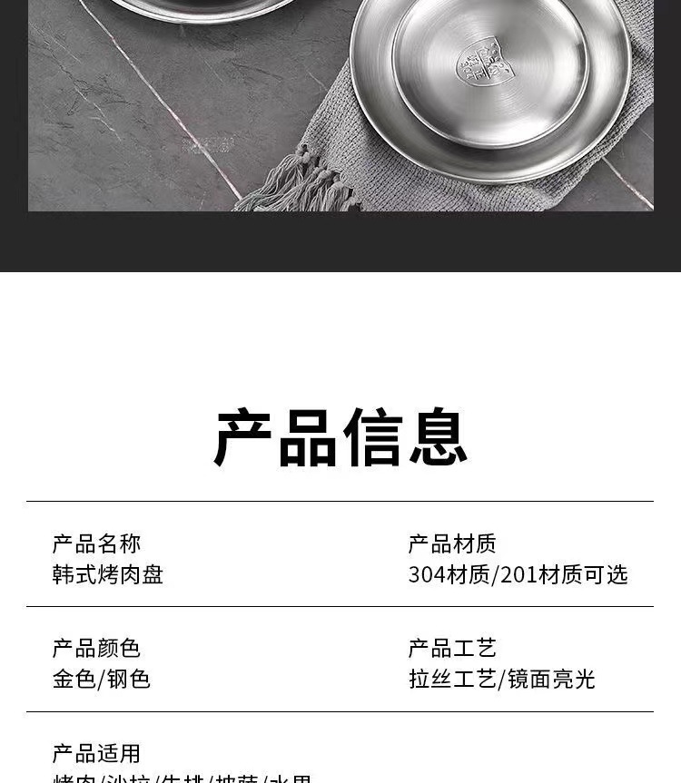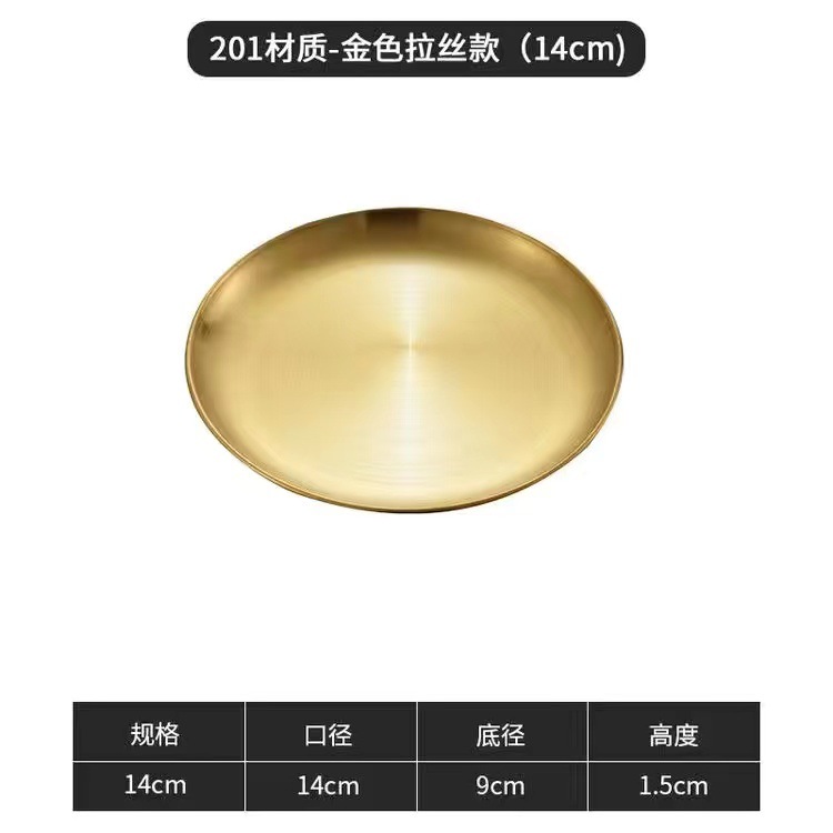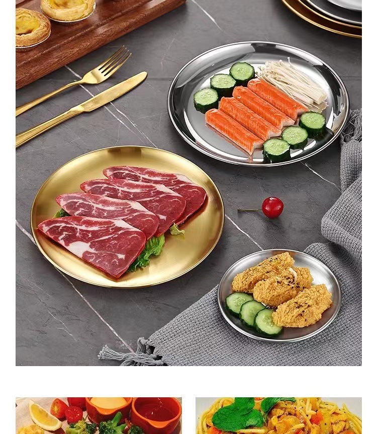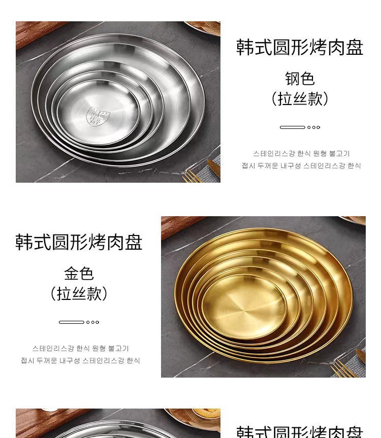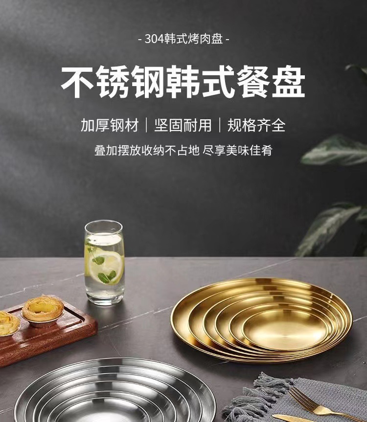 한국식 스테인레스 스틸 304 디스크 골든 플랫 바닥 트레이 바베큐 가게 가정용 상업용 레스토랑 얕은 접시 뼈 접시스토어 가기