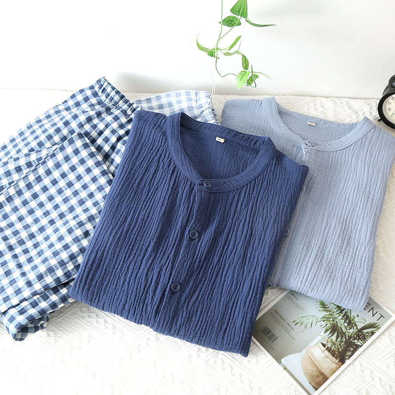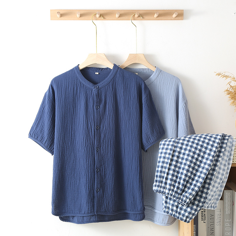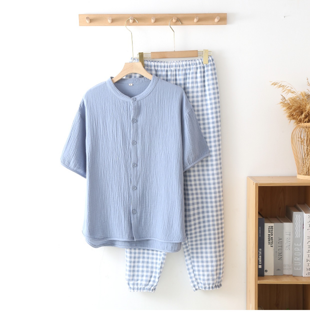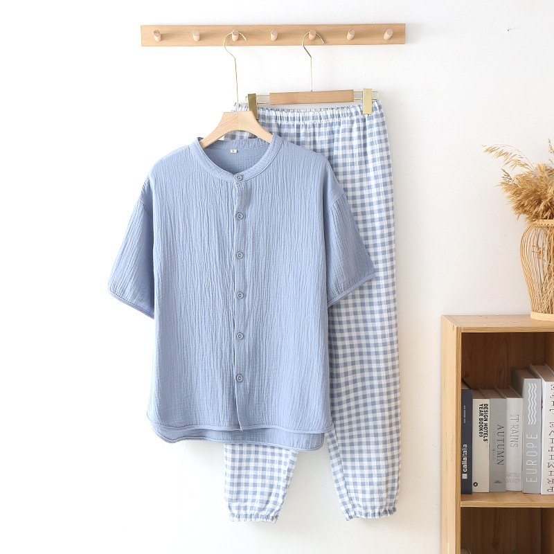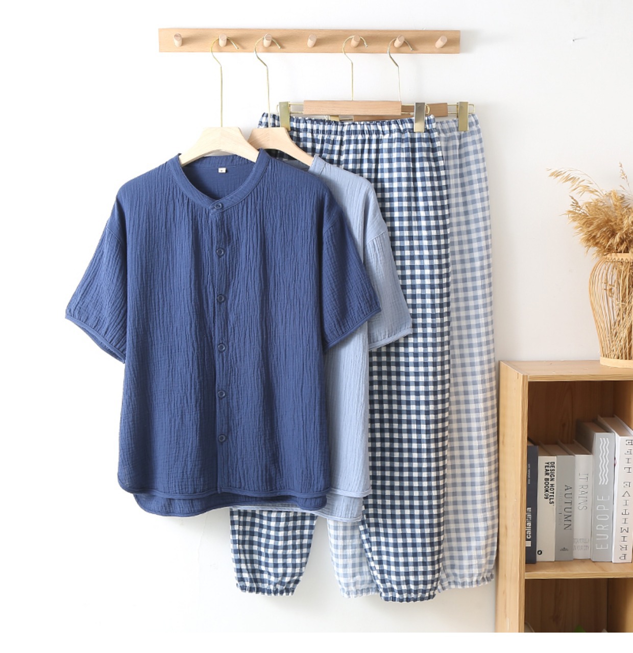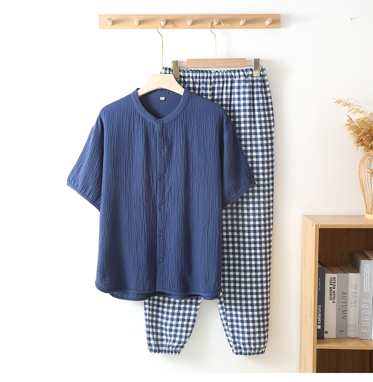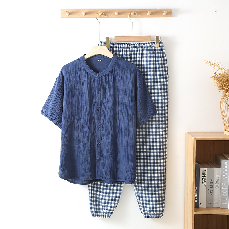남자의 얇은 여름 순면 가정 옷 세트 거즈 반팔 바지 잠옷 간단한 일본 격자 무늬 플러스 사이즈