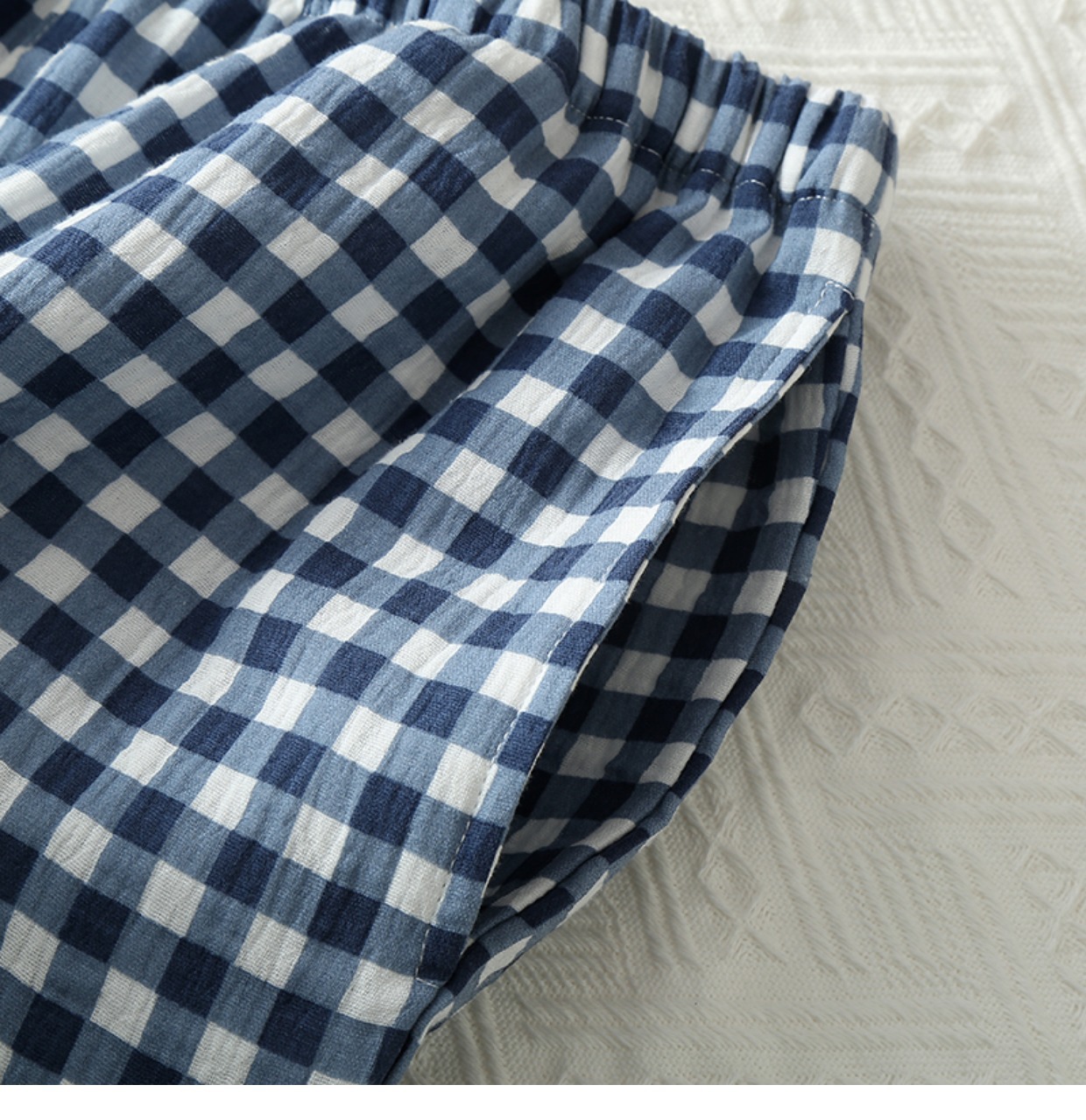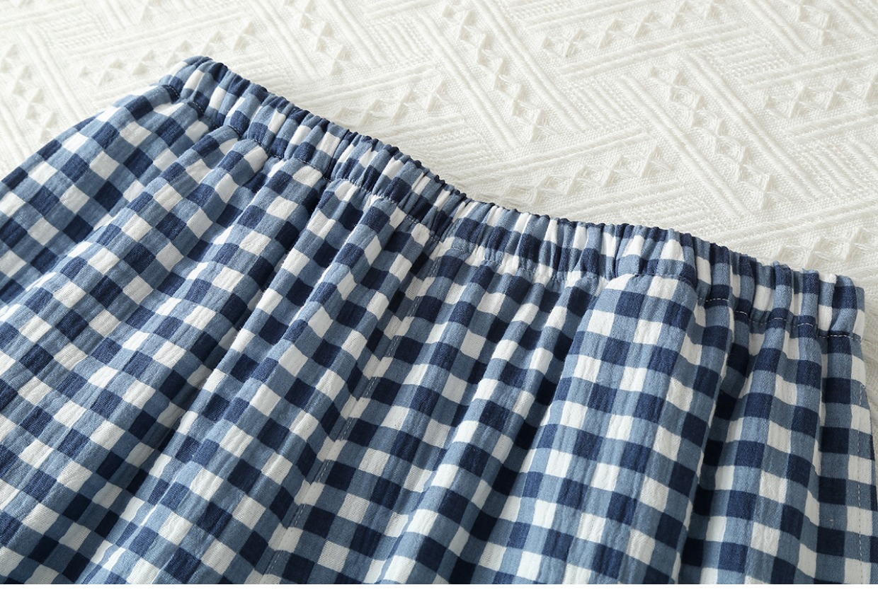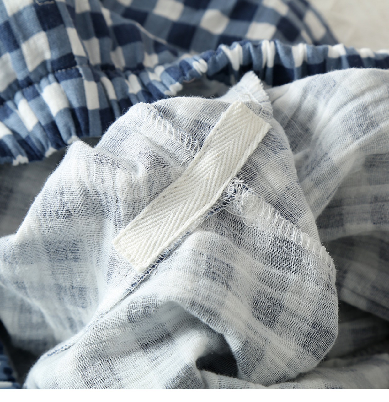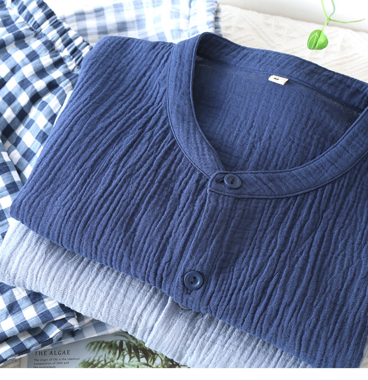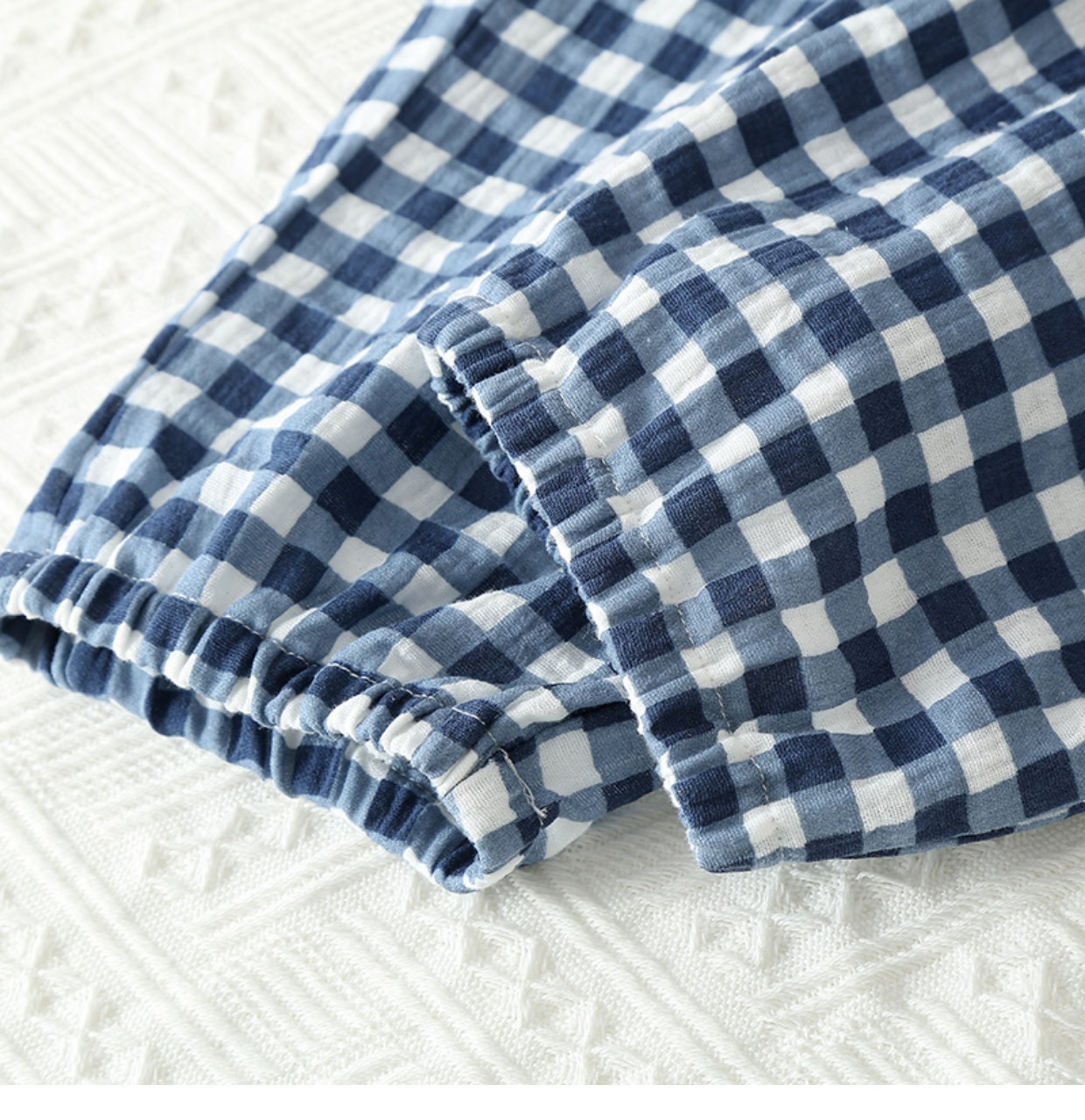 남자의 얇은 여름 순면 가정 옷 세트 거즈 반팔 바지 잠옷 간단한 일본 격자 무늬 플러스 사이즈