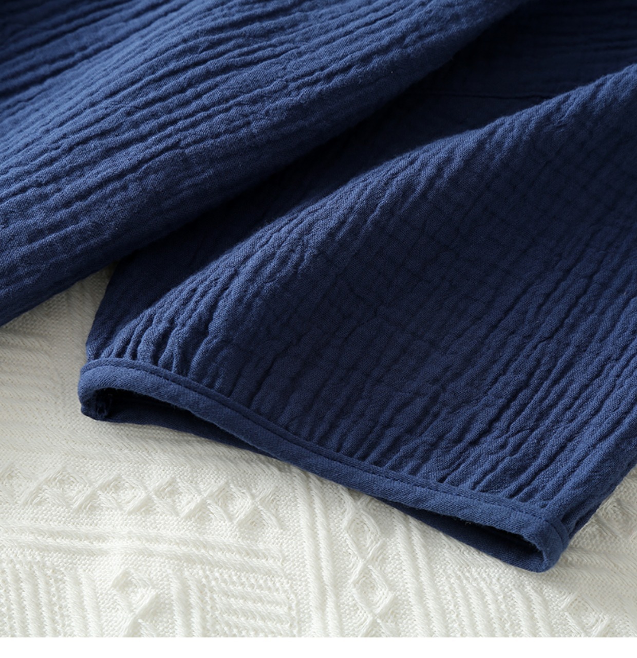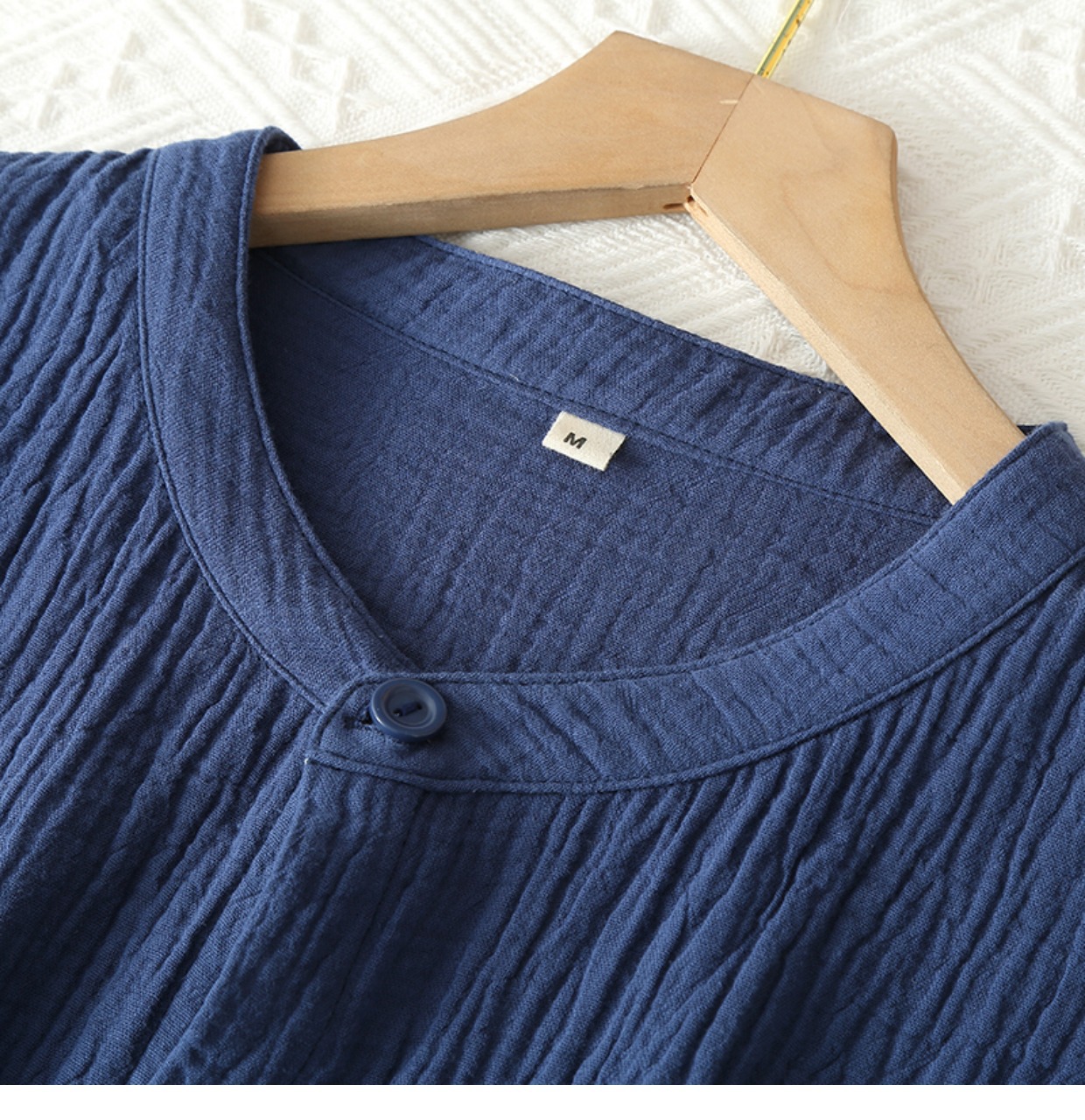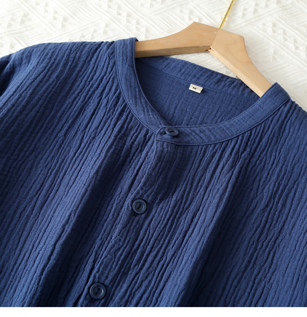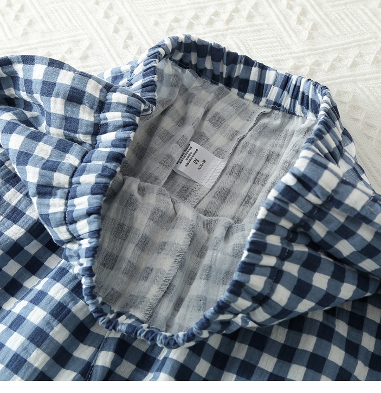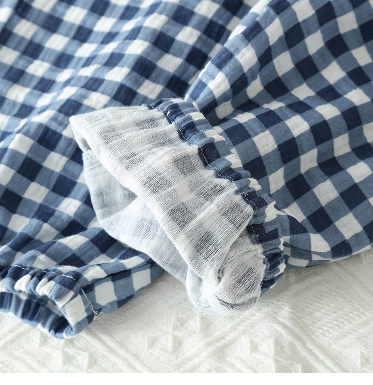 남자의 얇은 여름 순면 가정 옷 세트 거즈 반팔 바지 잠옷 간단한 일본 격자 무늬 플러스 사이즈