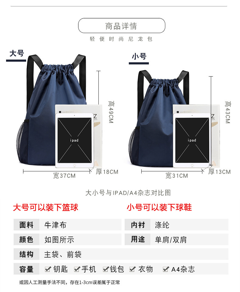 조임끈 백팩 남녀공용 경량 하이킹 가방 대용량 야외 피트니스 스포츠 농구 가방스토어 가기