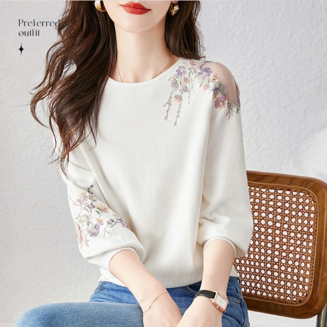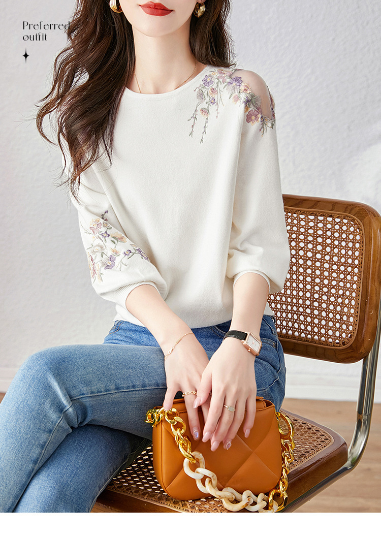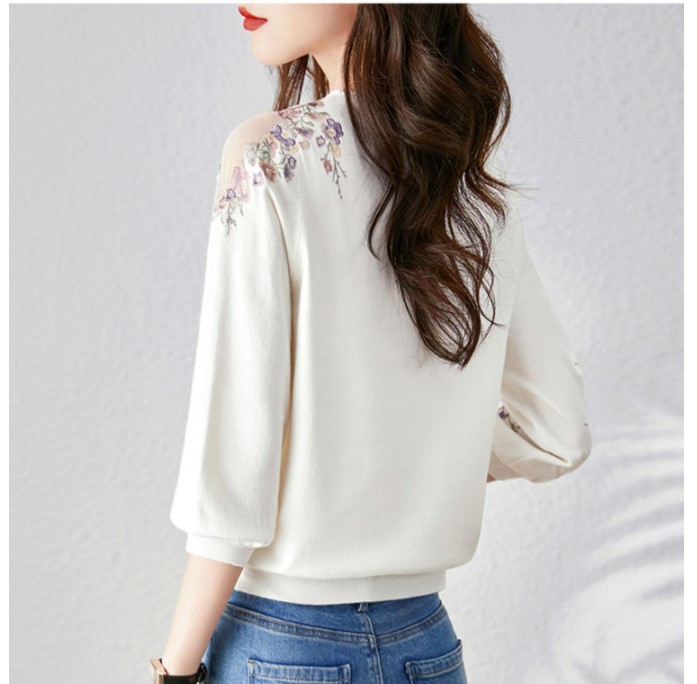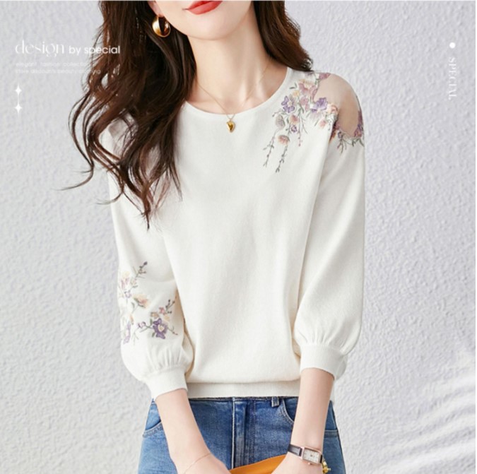 중공 스웨터 2023 봄 새로운 달콤한 신선한 꽃 슬리밍 라운드 넥 풀오버 여성 하프 슬리브 탑