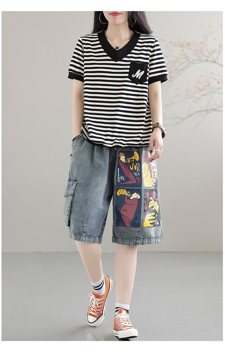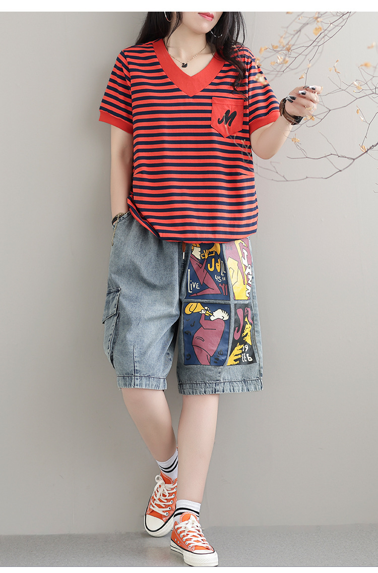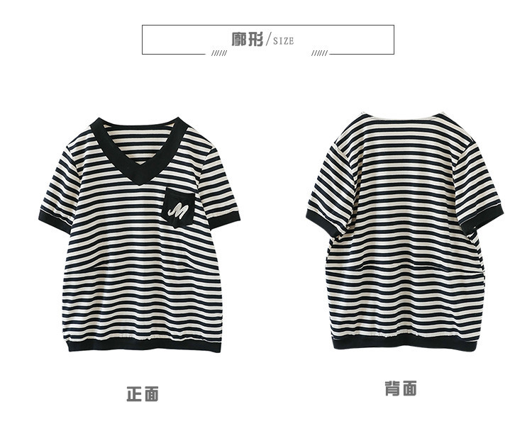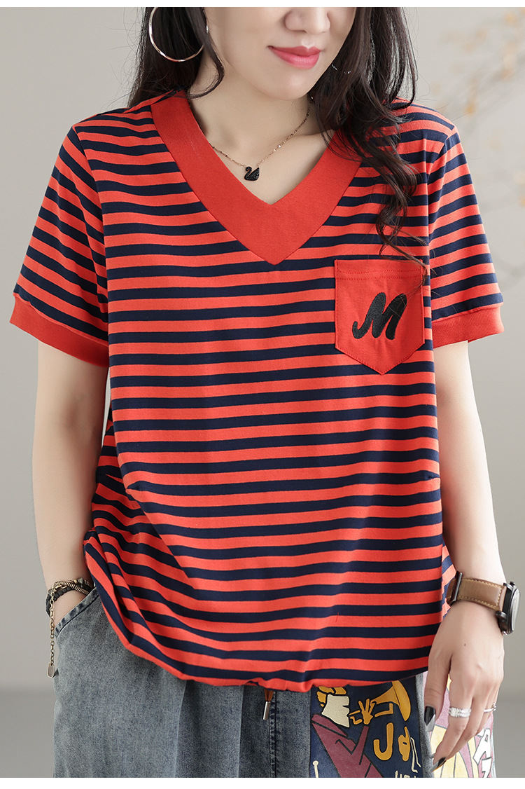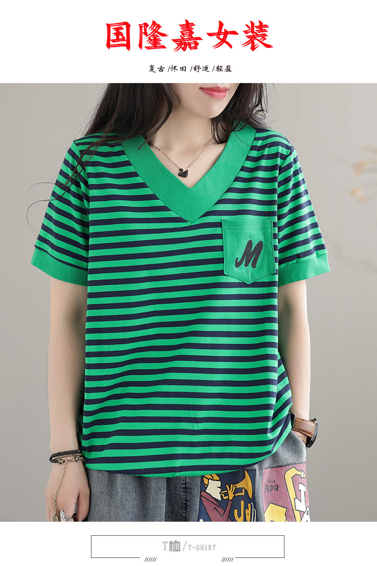 여자 플러스 사이즈 스트라이프 반팔 티셔츠 여자 코튼 2024 여름 새로운 V 넥 자수 예술적 루즈 올 매치 탑스토어 가기