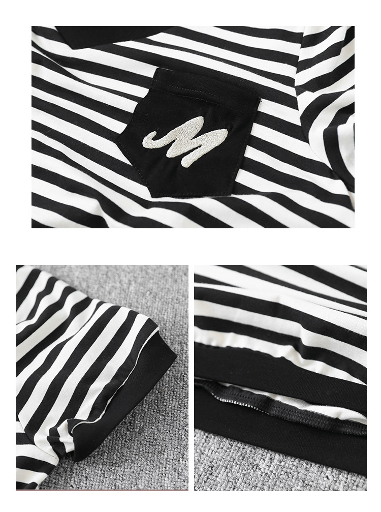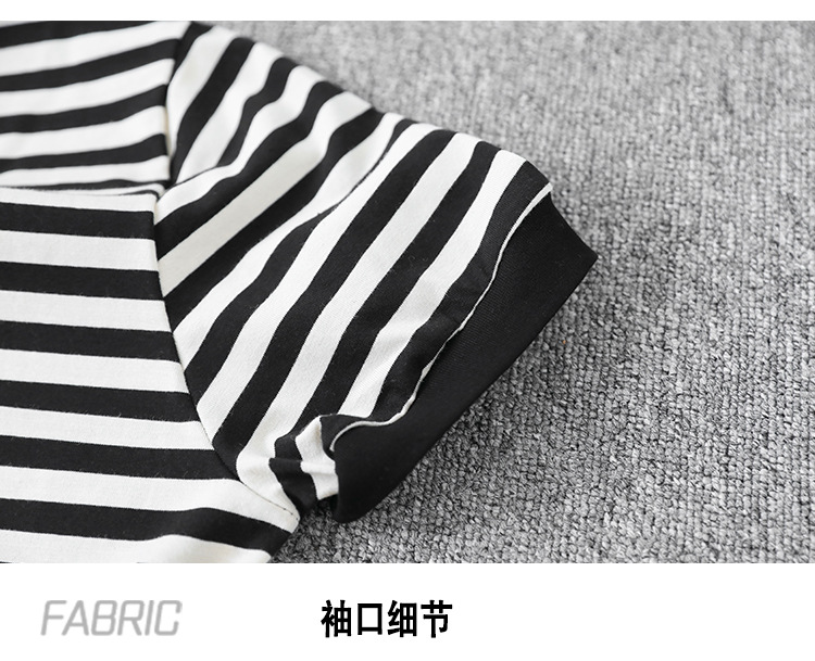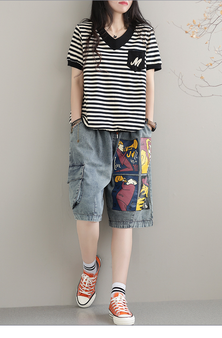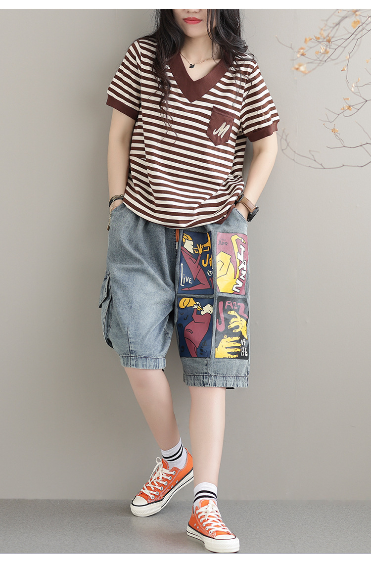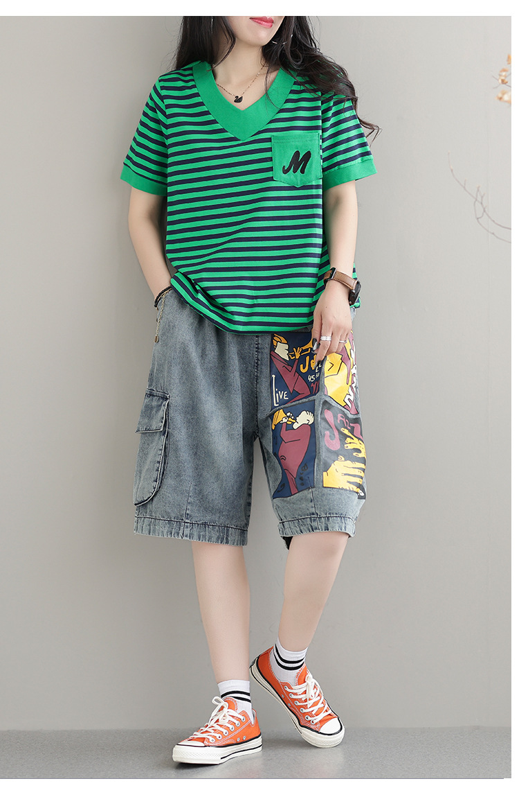 여자 플러스 사이즈 스트라이프 반팔 티셔츠 여자 코튼 2024 여름 새로운 V 넥 자수 예술적 루즈 올 매치 탑스토어 가기