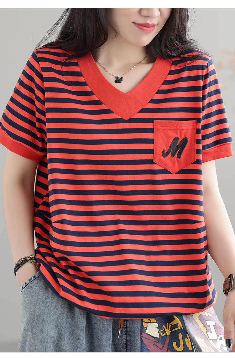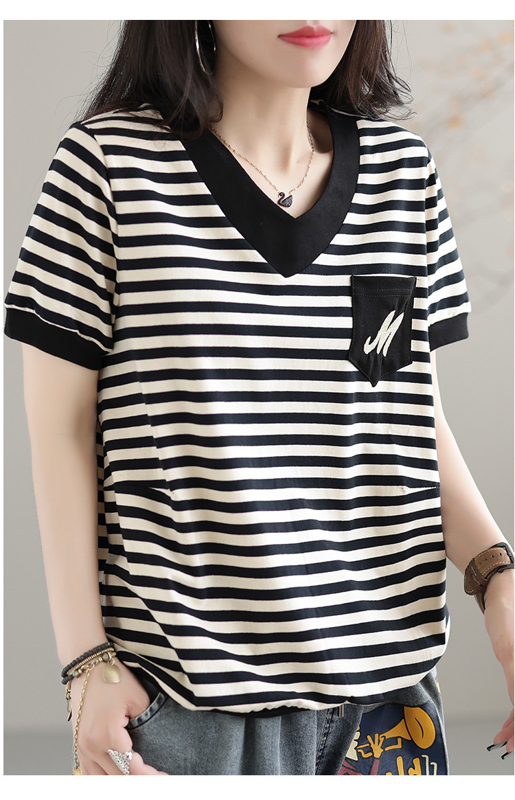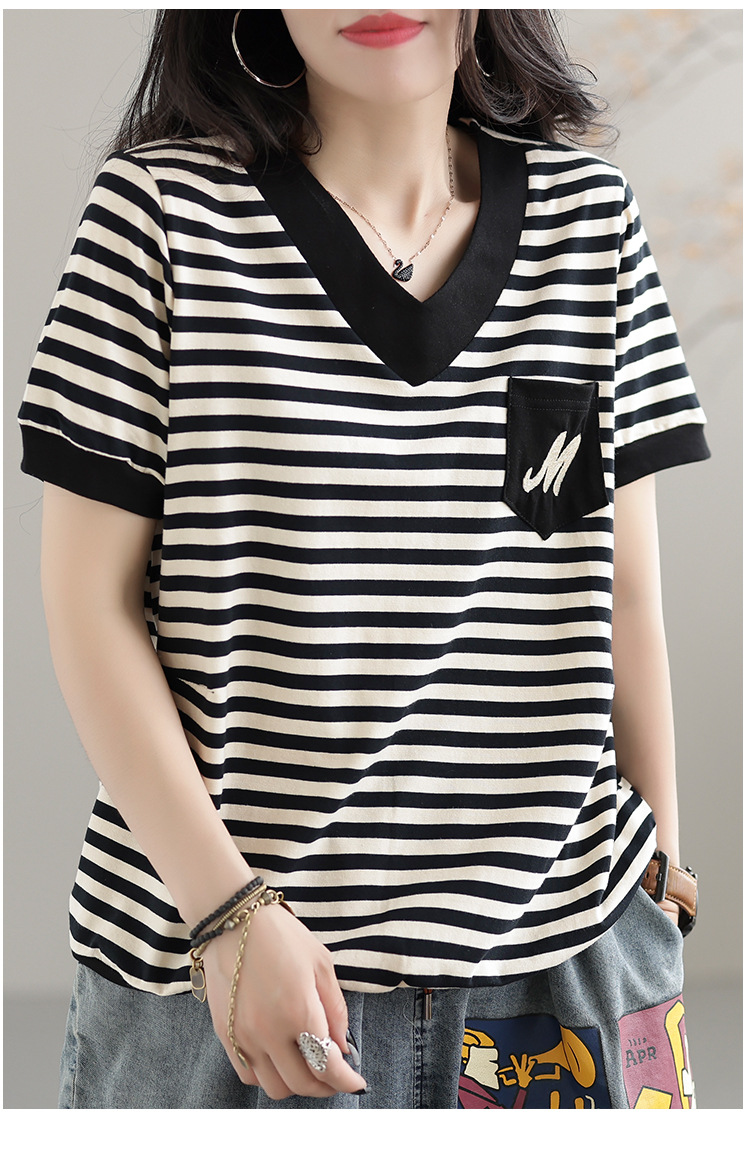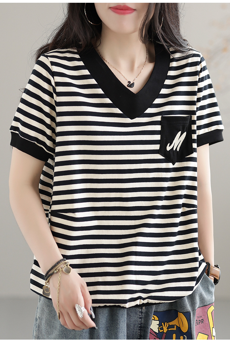 여자 플러스 사이즈 스트라이프 반팔 티셔츠 여자 코튼 2024 여름 새로운 V 넥 자수 예술적 루즈 올 매치 탑