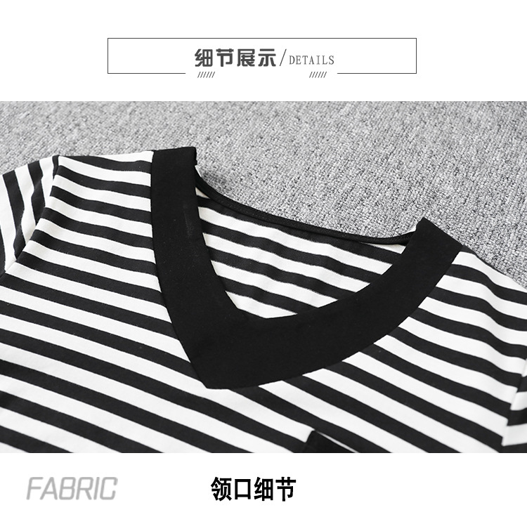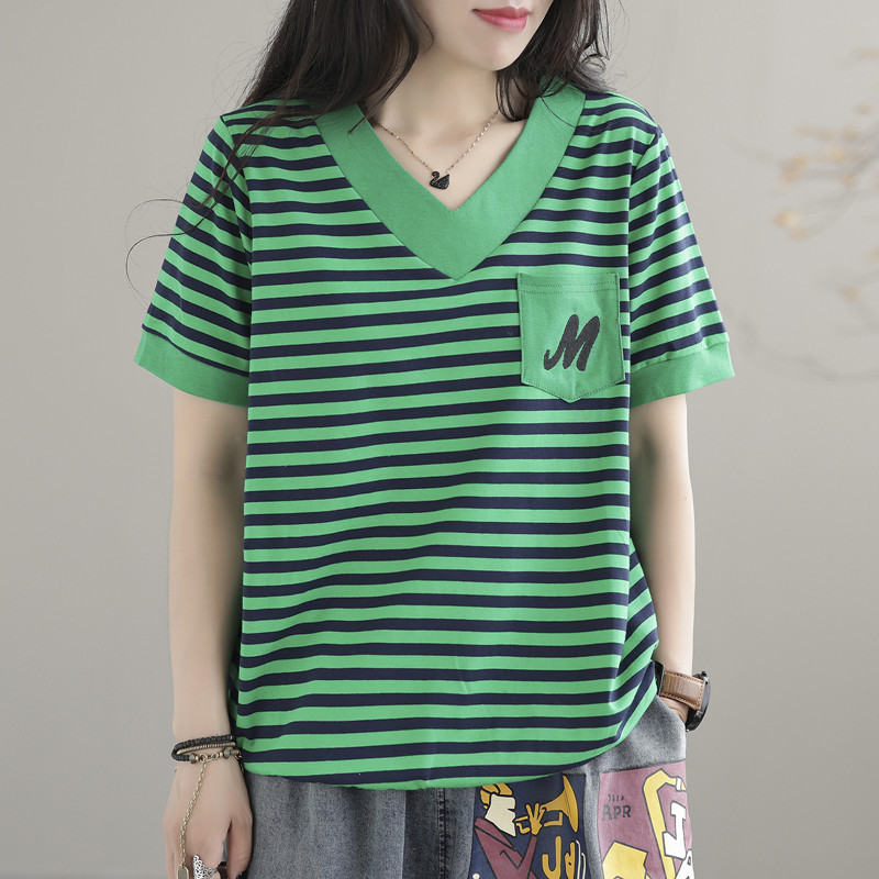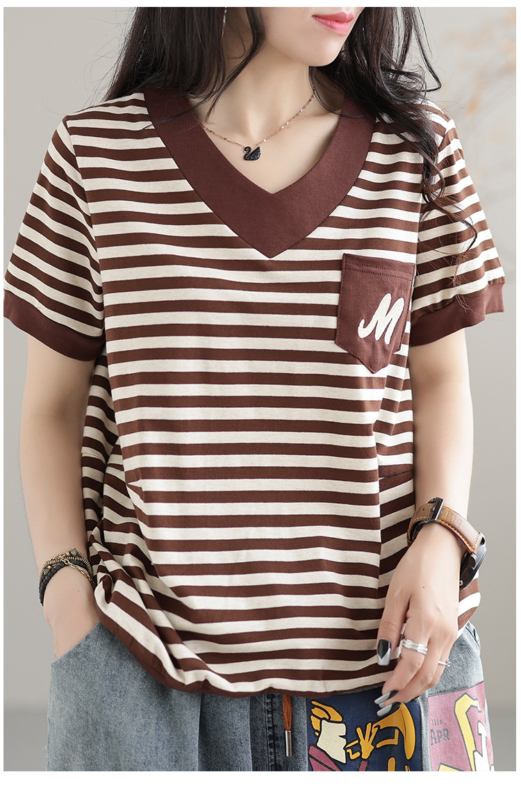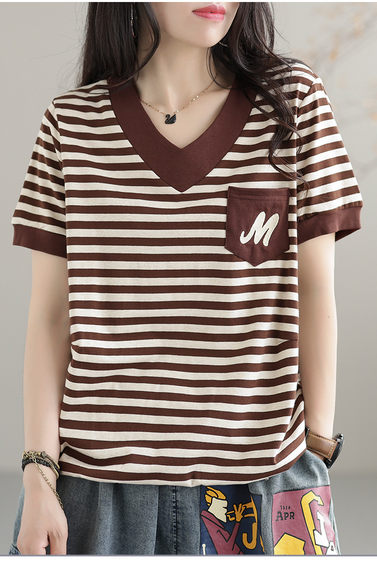 여자 플러스 사이즈 스트라이프 반팔 티셔츠 여자 코튼 2024 여름 새로운 V 넥 자수 예술적 루즈 올 매치 탑