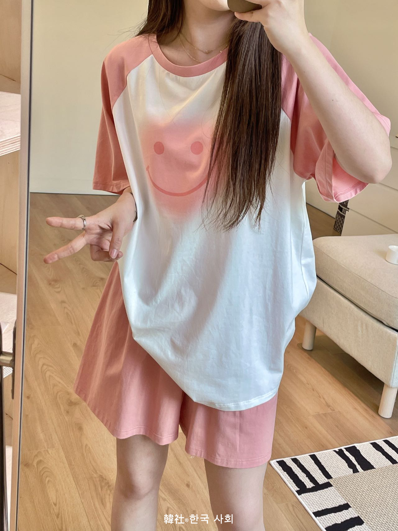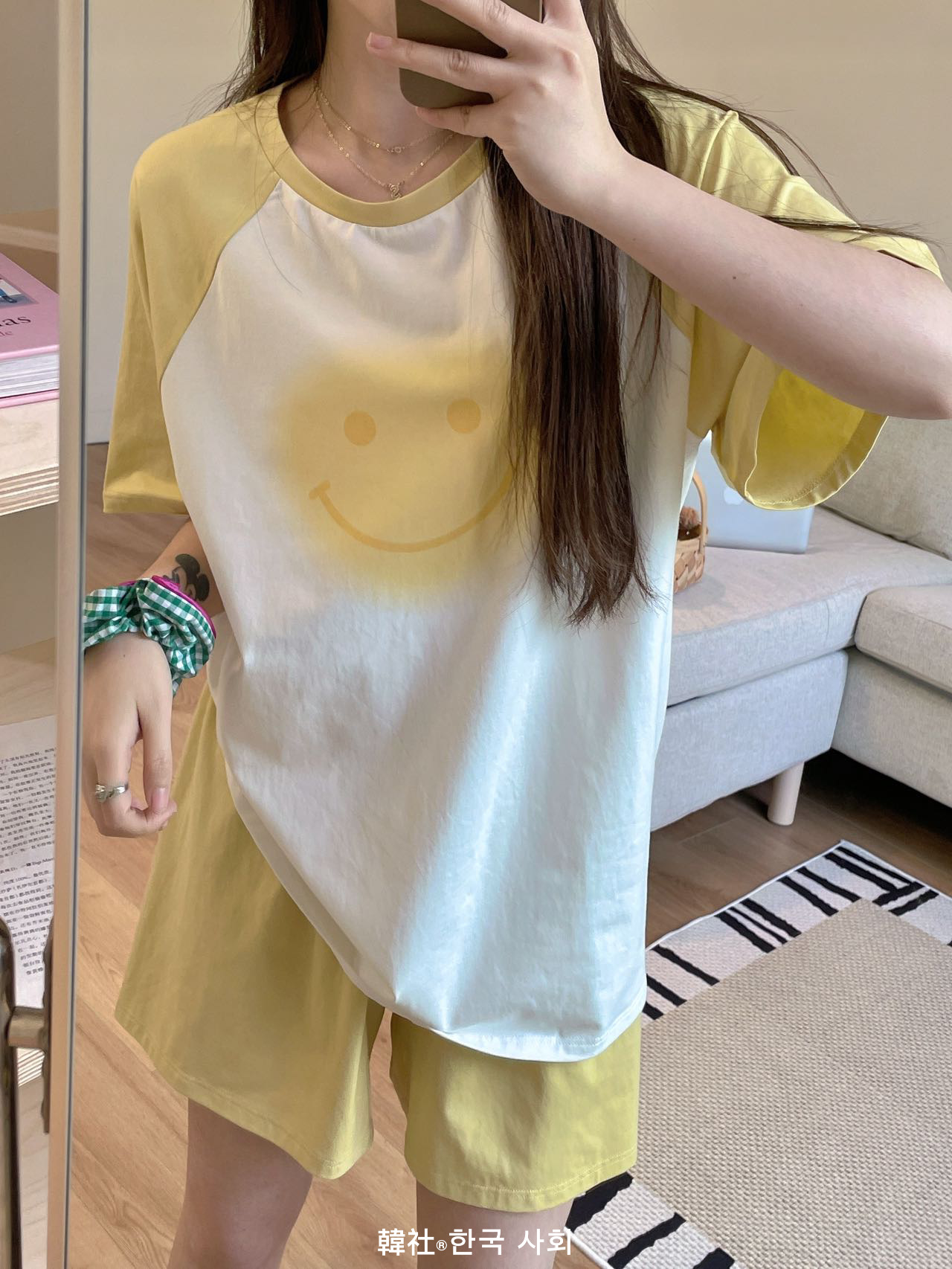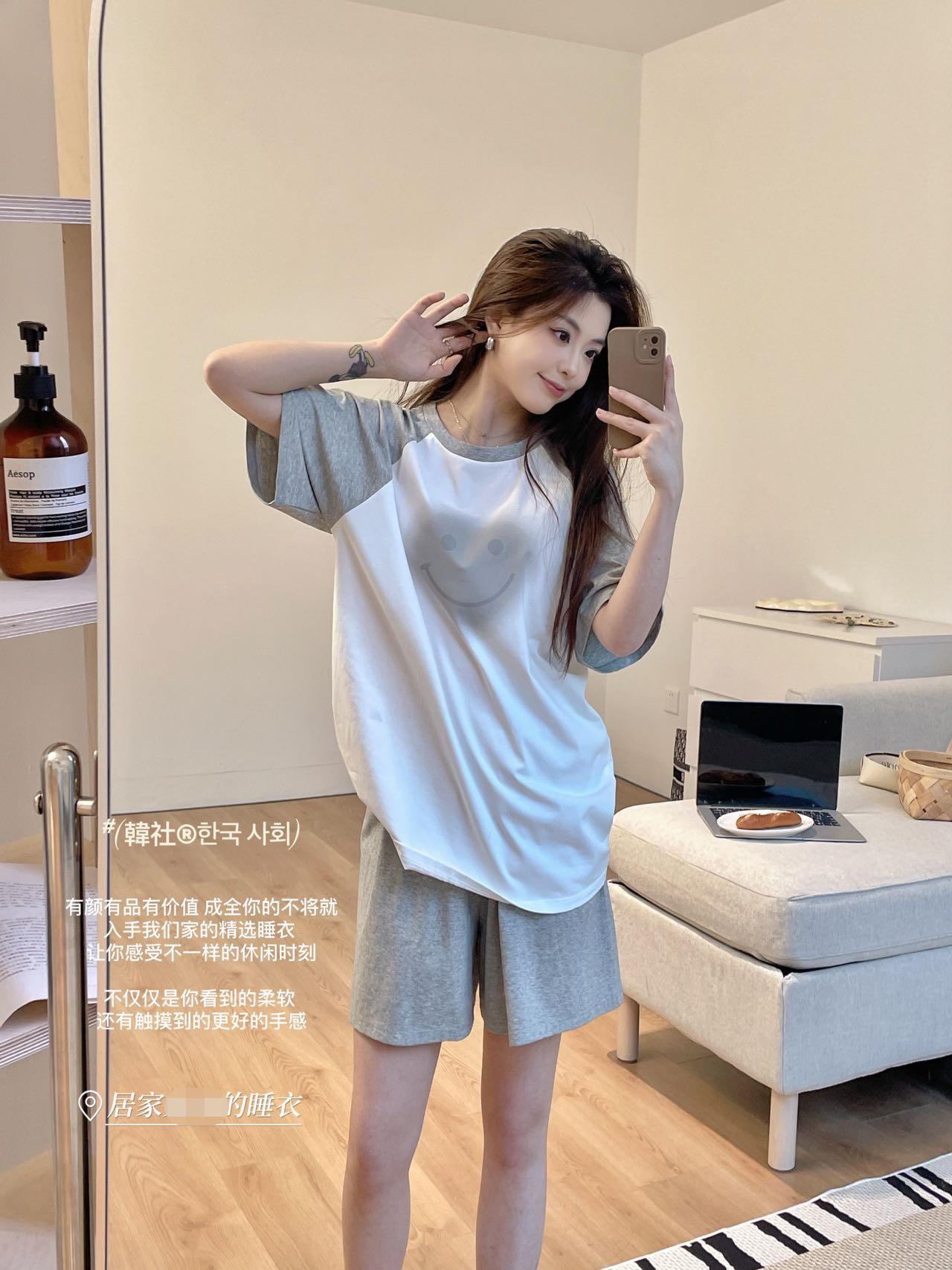 한국 사회 여름 새로운 얼음 순면 대비 스마일 세트 가정 의류 여성의 대조 반팔 반바지 라운드 넥 잠옷스토어 가기