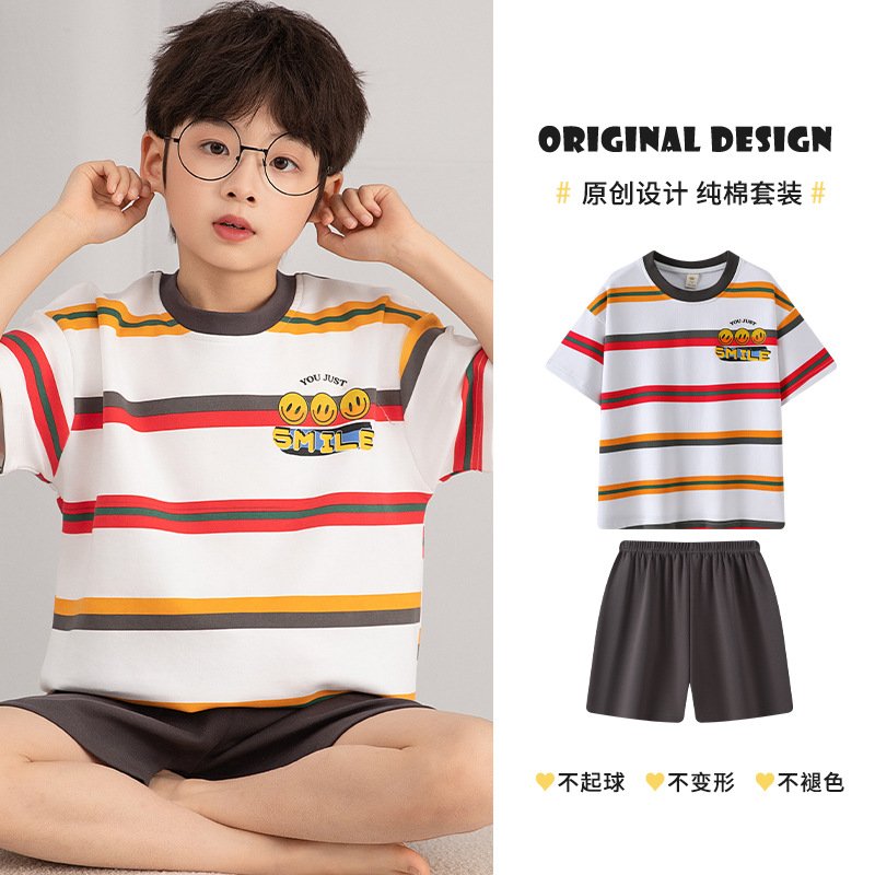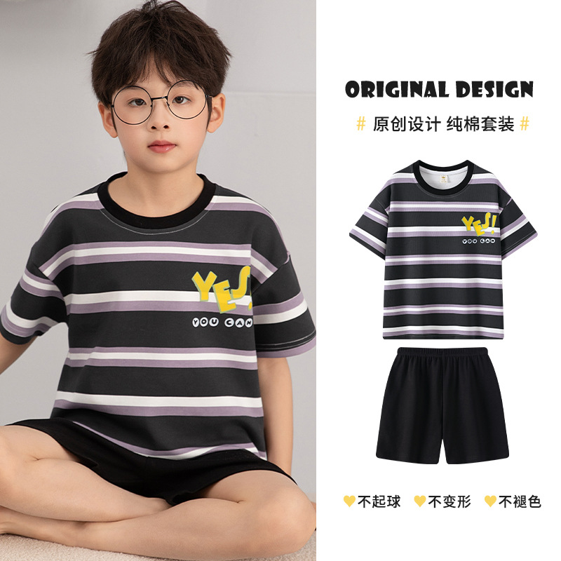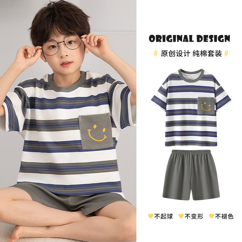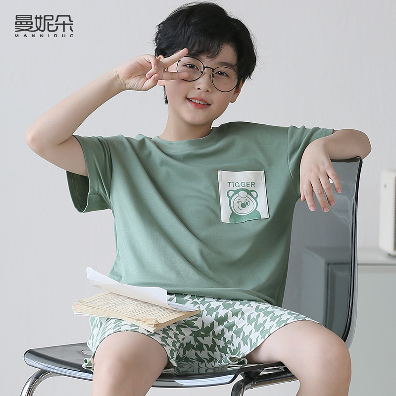 소년 잠옷 여름 얇은 순면 십대 여름 순면 세트 소년 큰 어린이 반팔 어린이 가정복