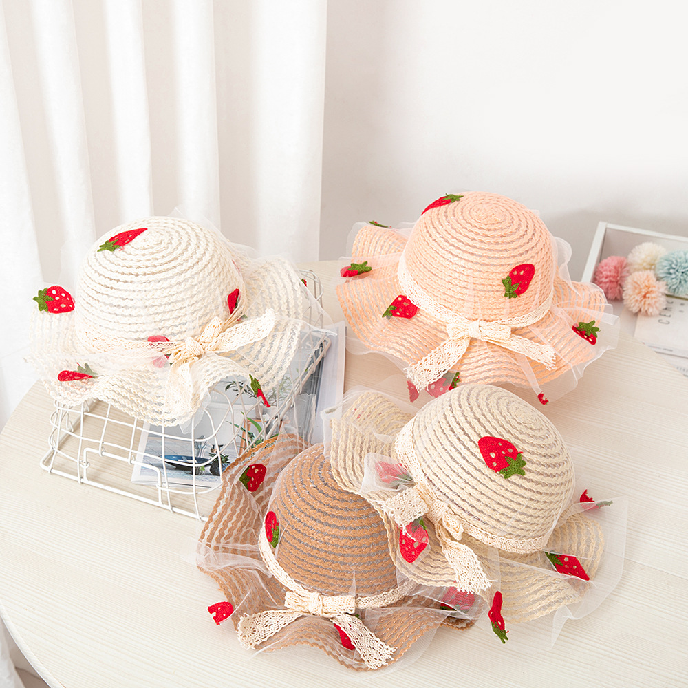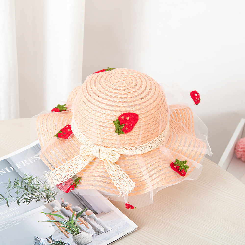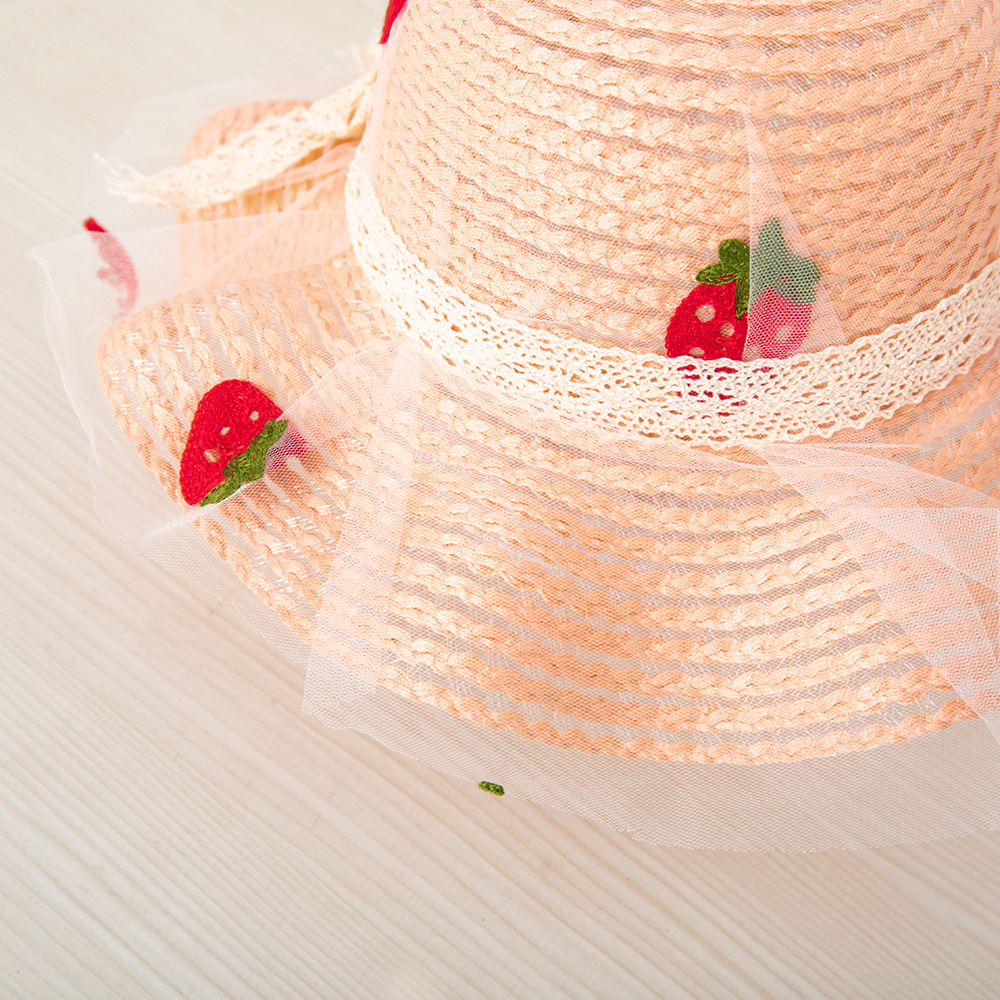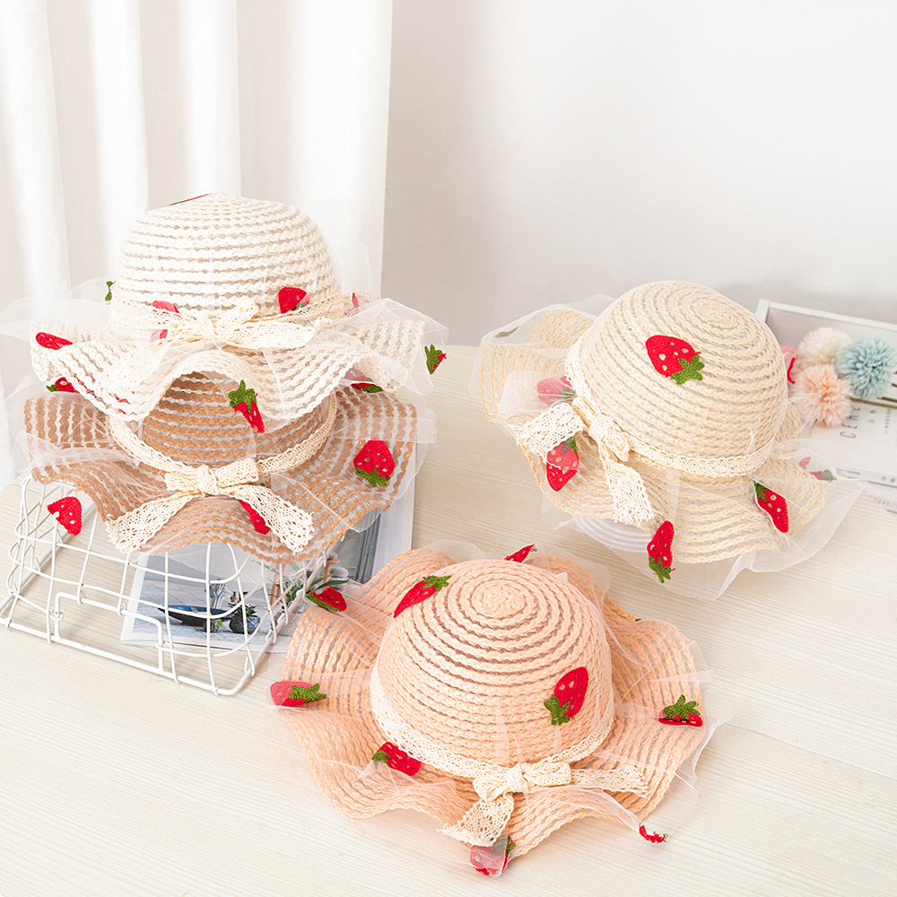 여름 어린이 자외선 차단제 모자 소녀 아기 귀여운 태양 모자 딸기 메쉬 밀짚 모자 큰 챙 해변 태양 모자