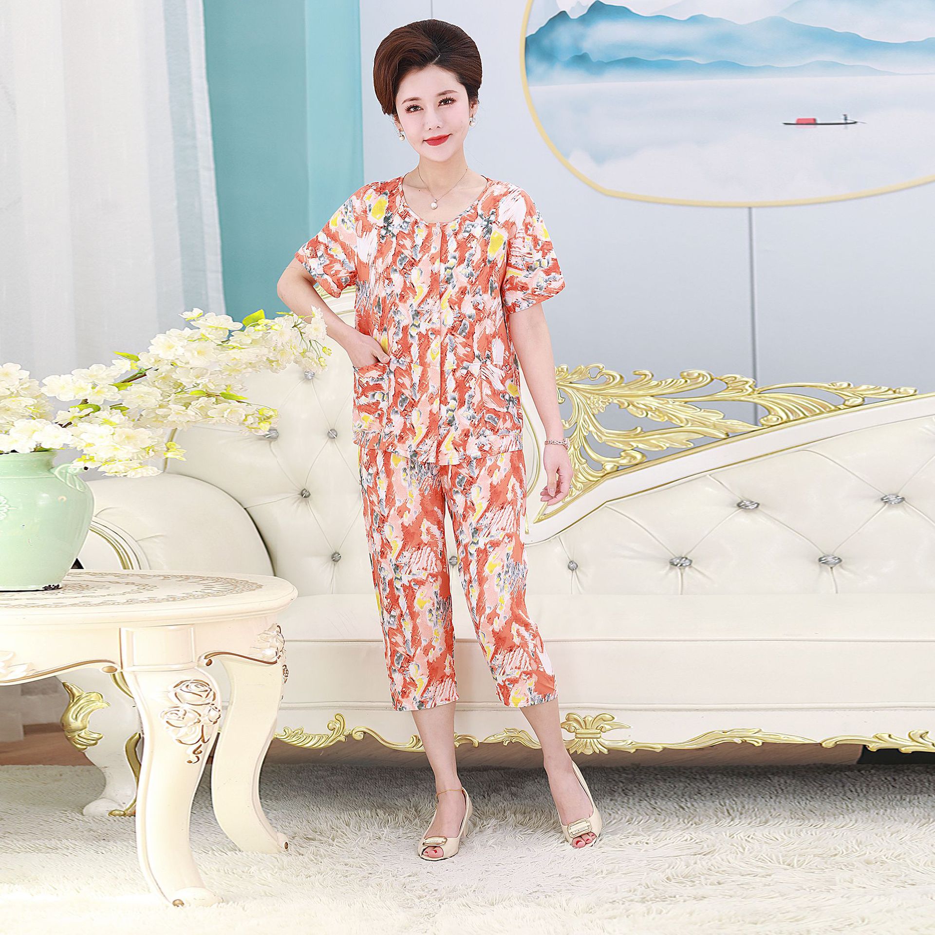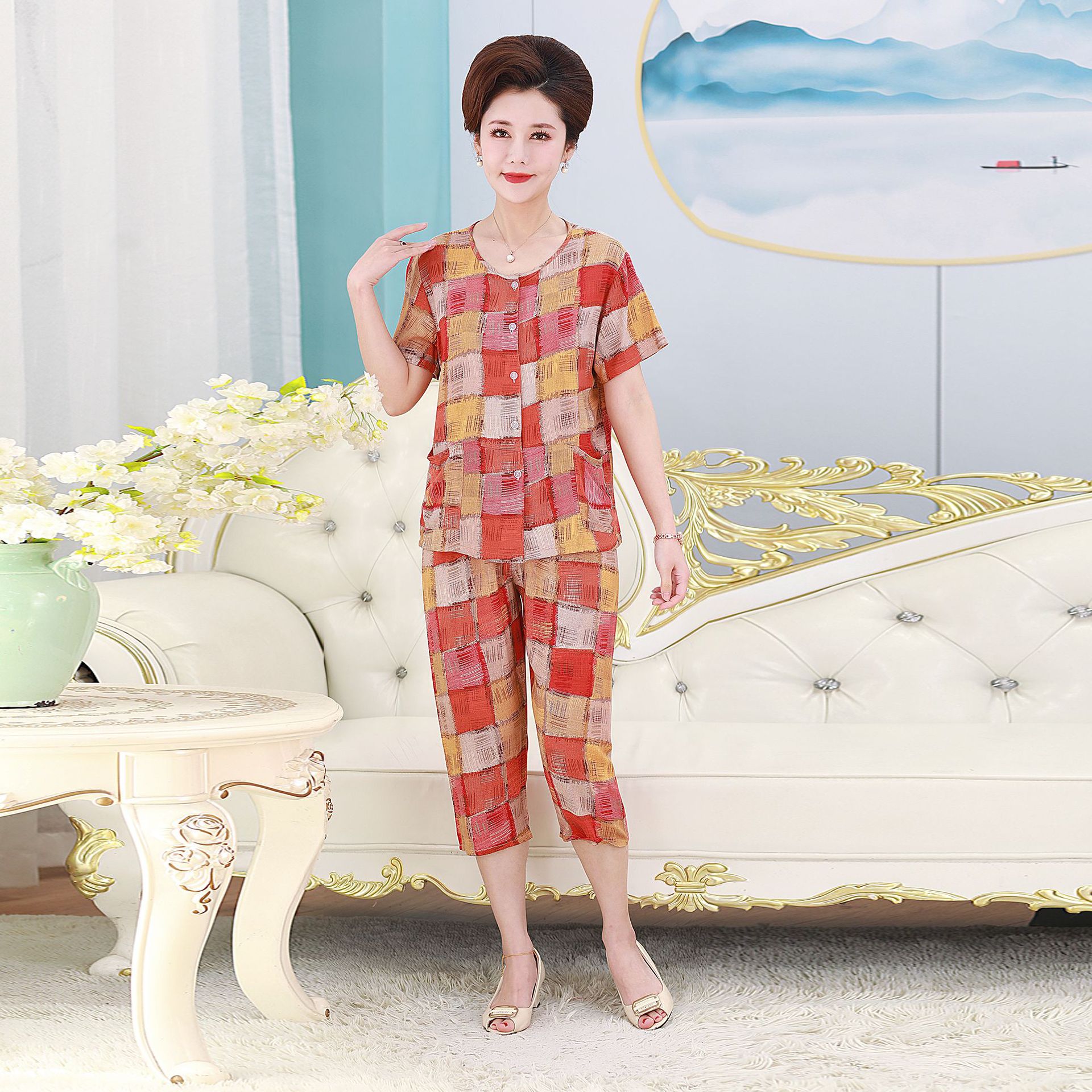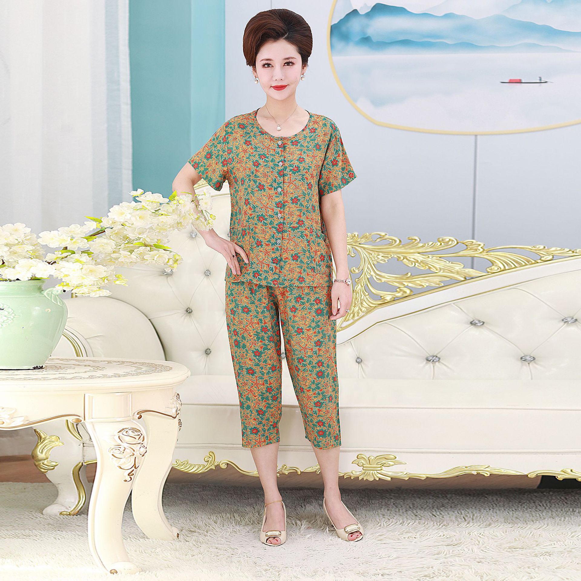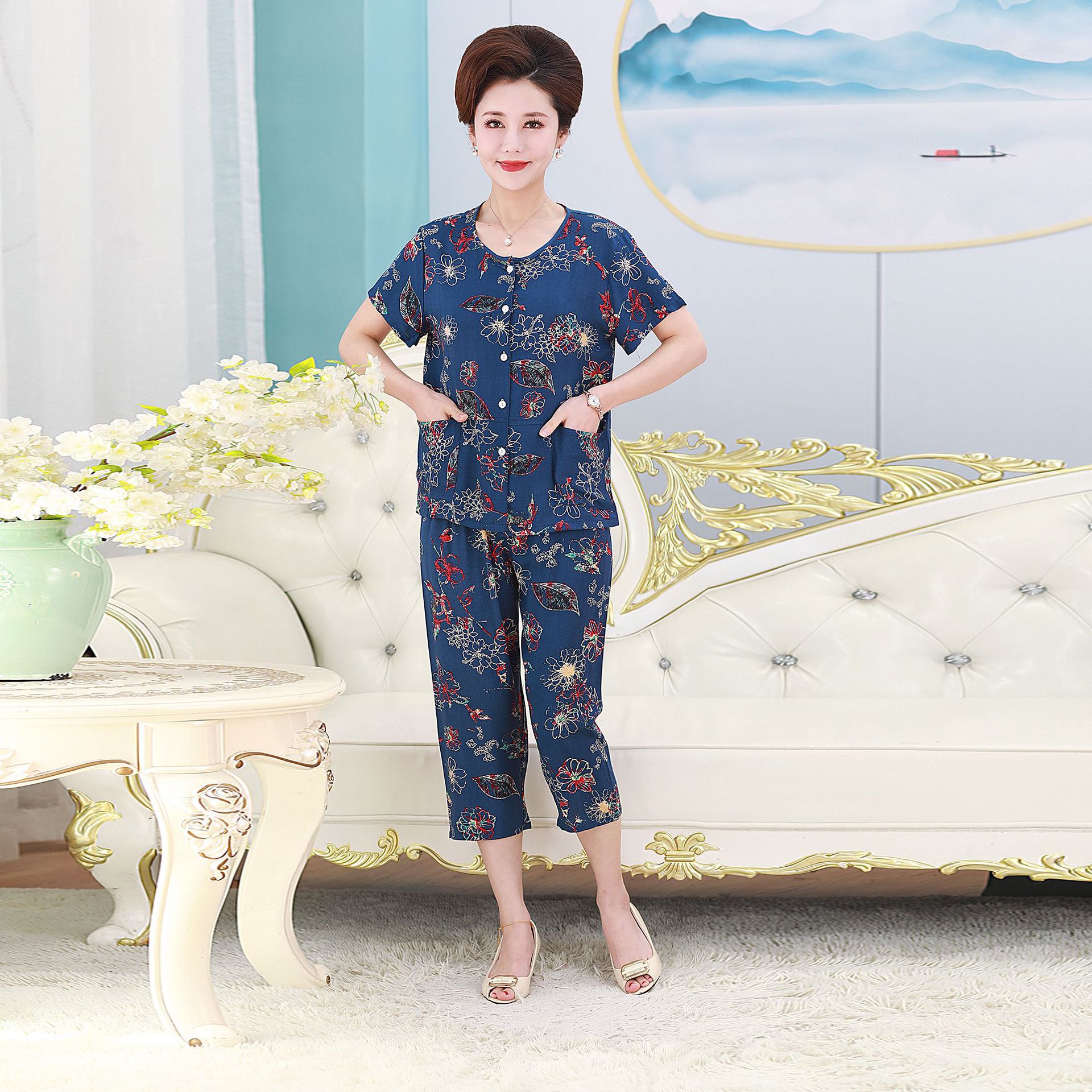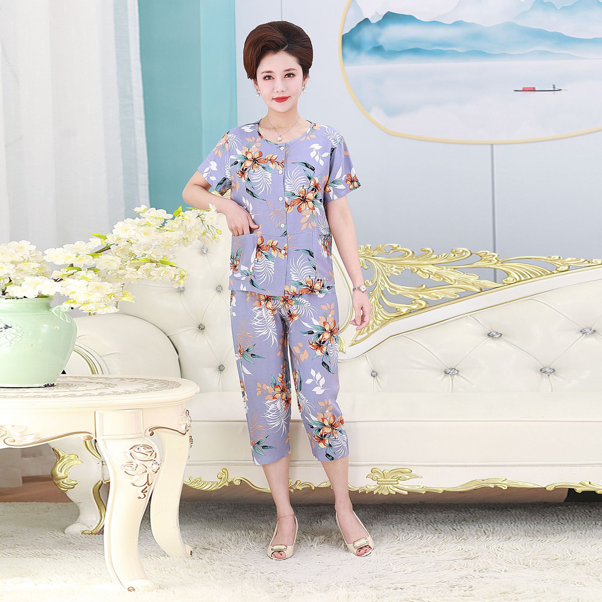 여름 중년 및 노인 어머니 면 실크 잠옷 여성용 가디건 버튼 통기성 세트 아우터 홈웨어 반팔 포켓스토어 가기