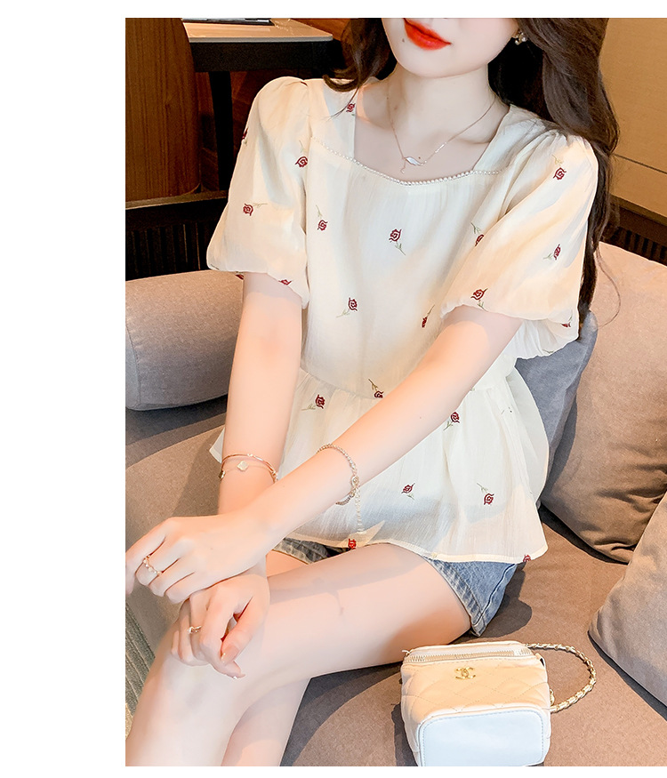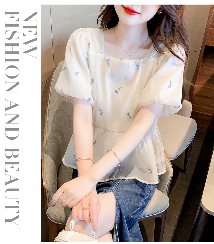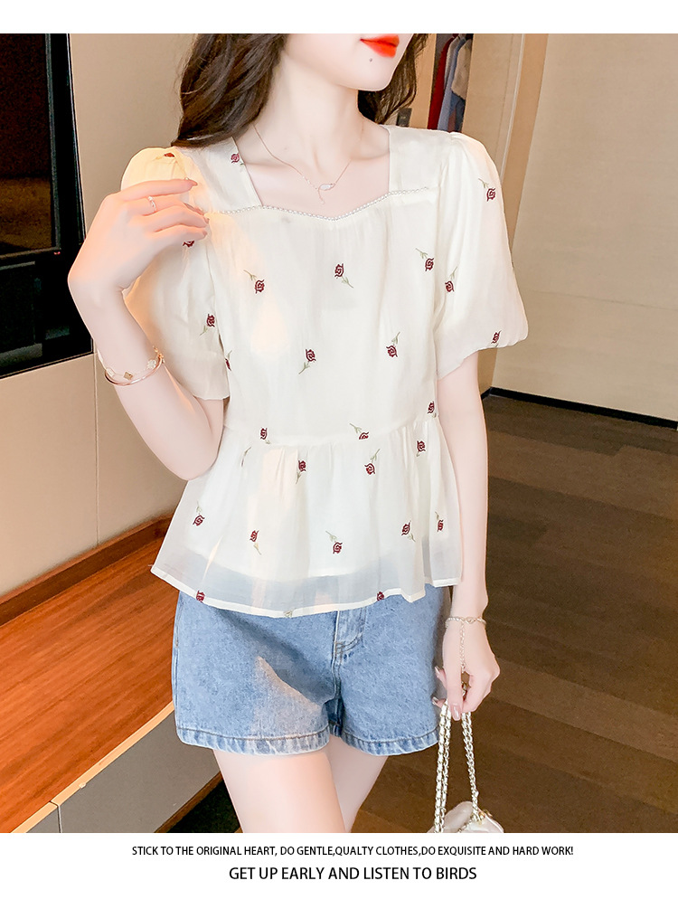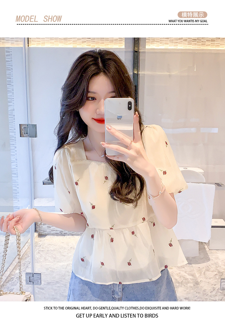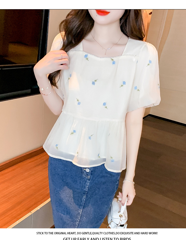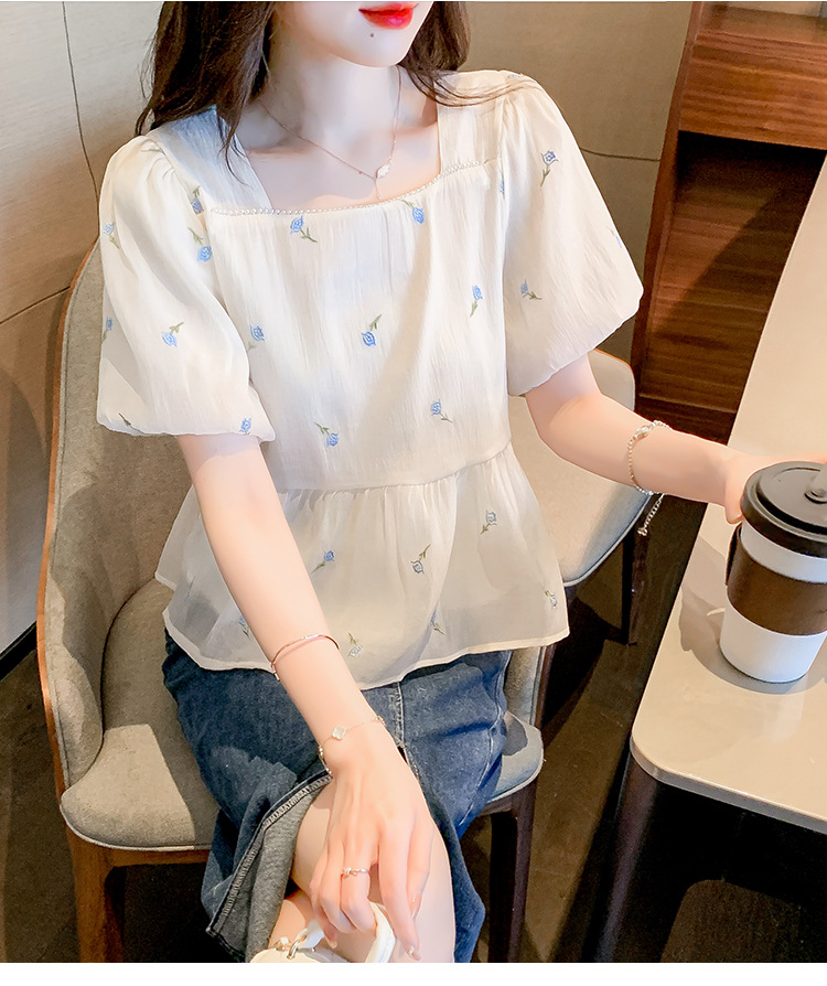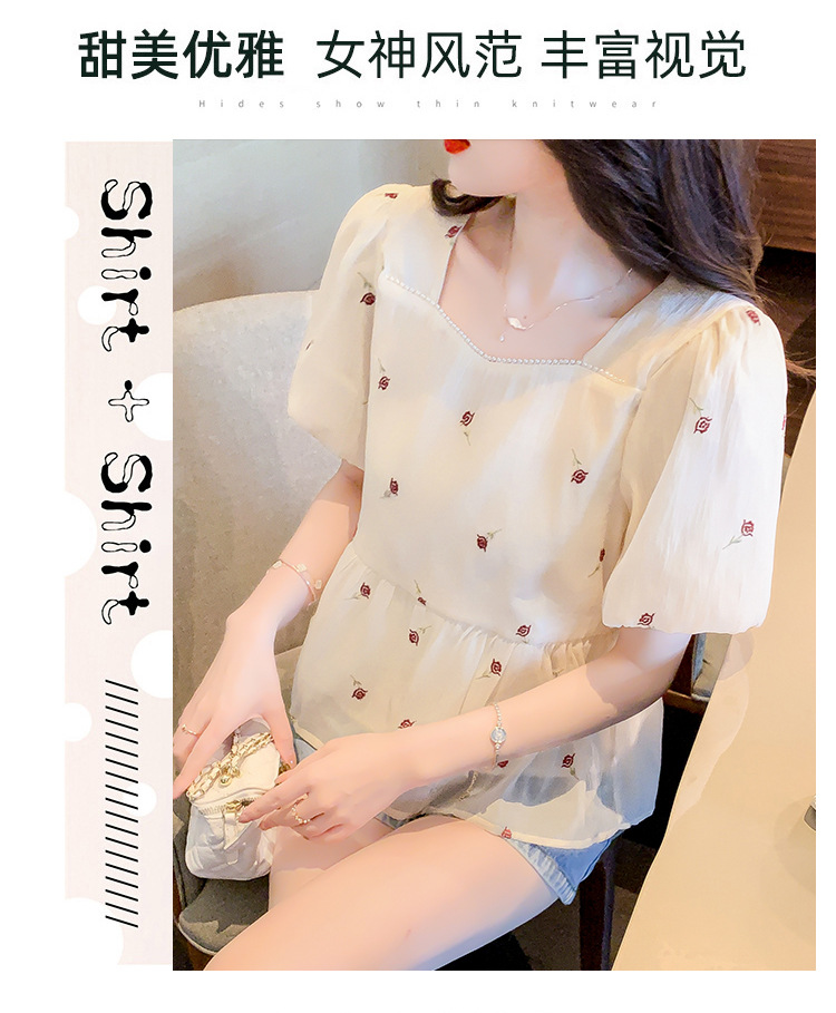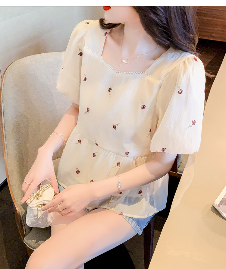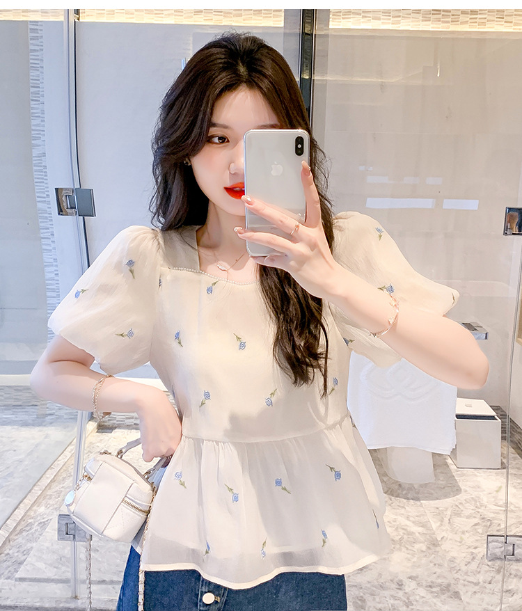 달콤한 진주 스퀘어 칼라 인형 셔츠 여성 여름 2023 새로운 한국식 슬리밍 서양식 나이 감소 셔츠 탑스토어 가기
