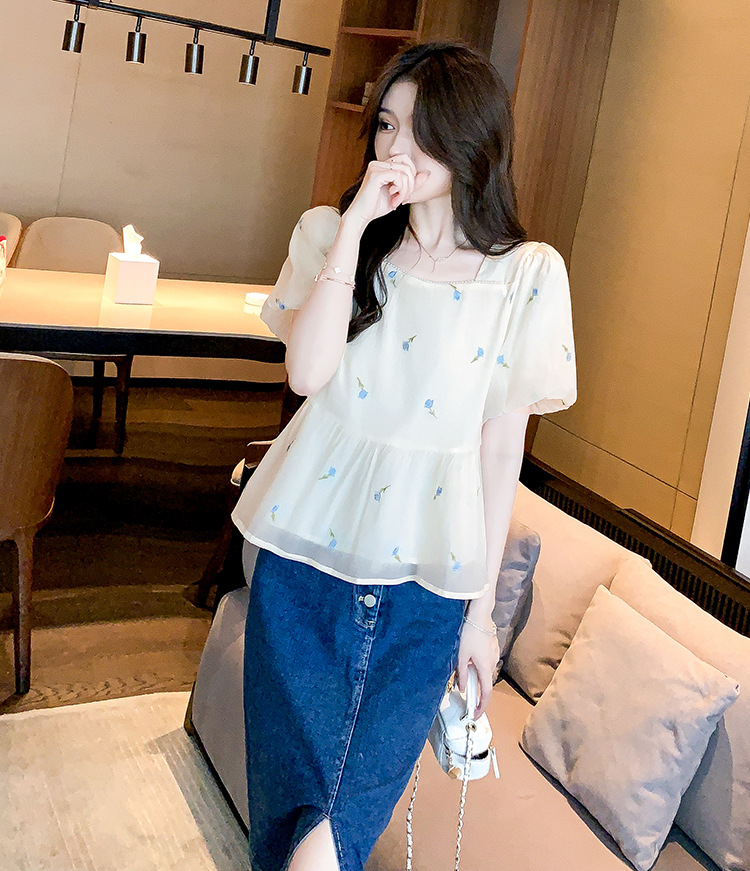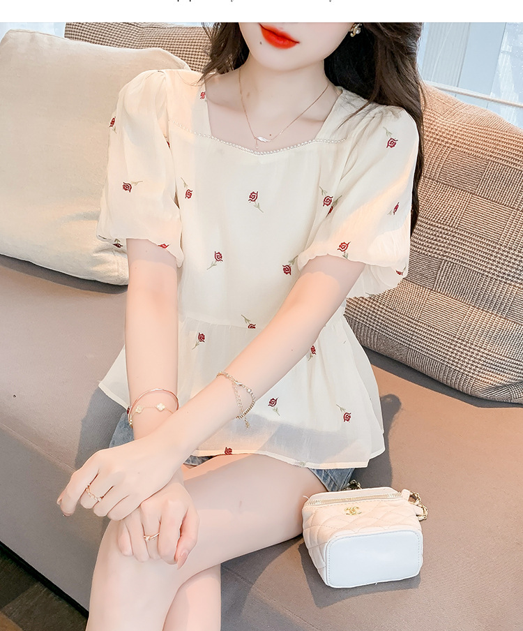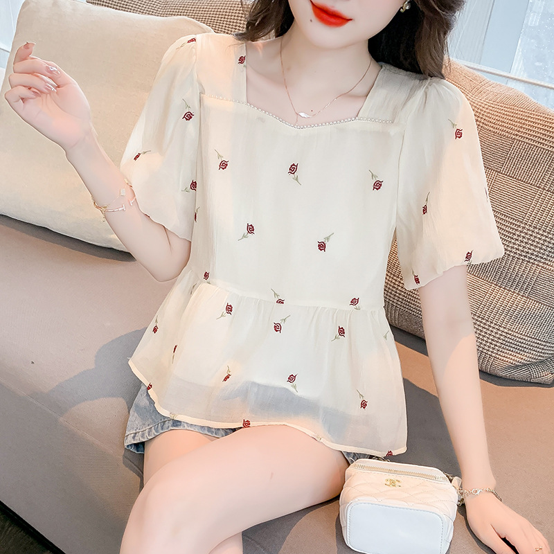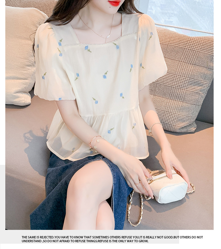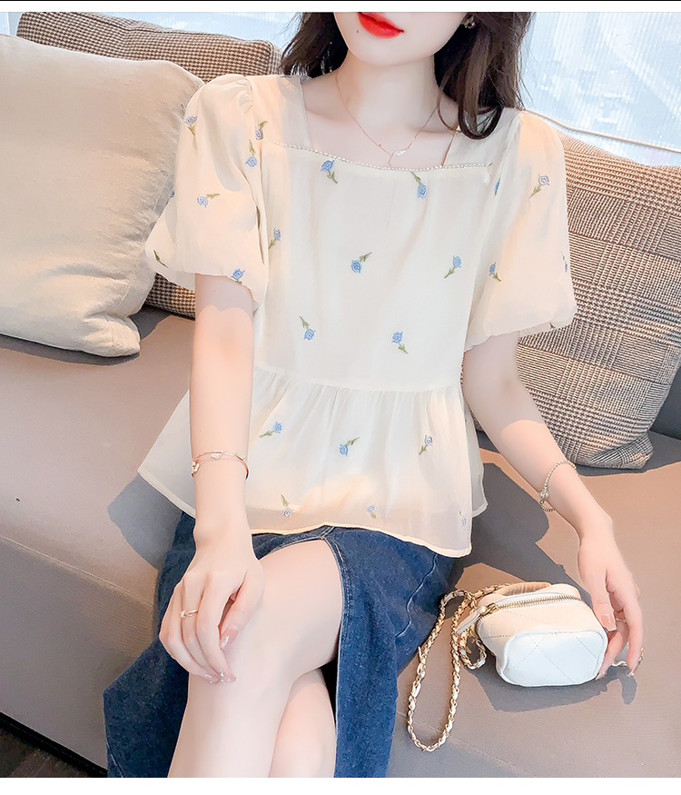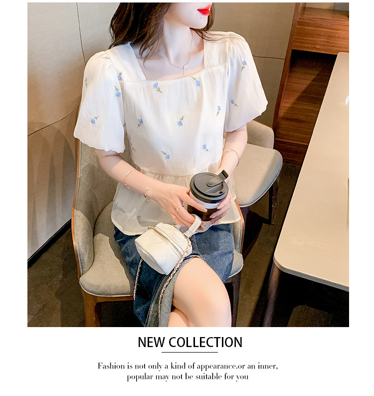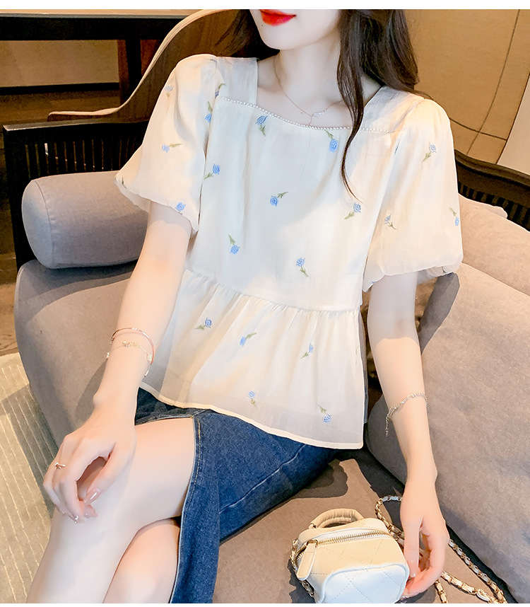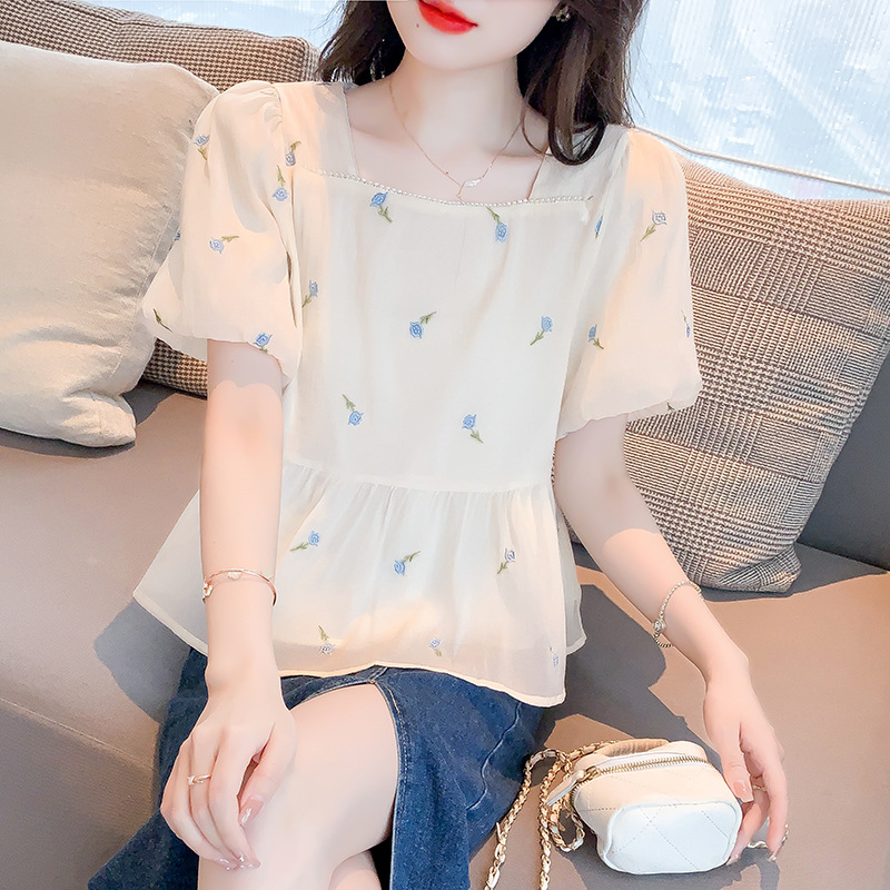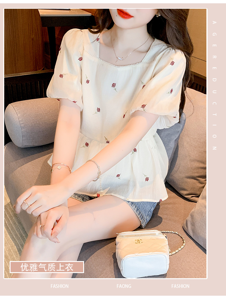 달콤한 진주 스퀘어 칼라 인형 셔츠 여성 여름 2023 새로운 한국식 슬리밍 서양식 나이 감소 셔츠 탑스토어 가기