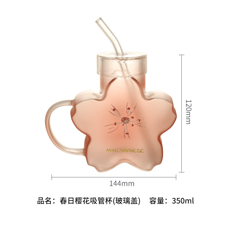 Mingshangde 크리에이티브 워터 컵 유리 인 스타일 고가 벚꽃 컵 여아 동반 선물 유리 흡입 튜브 컵