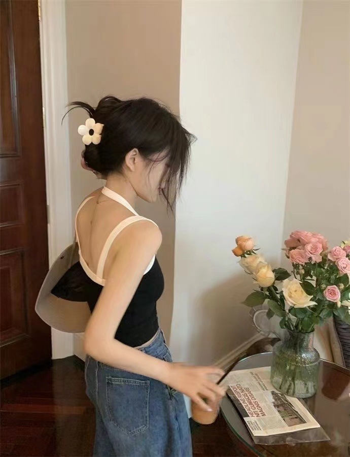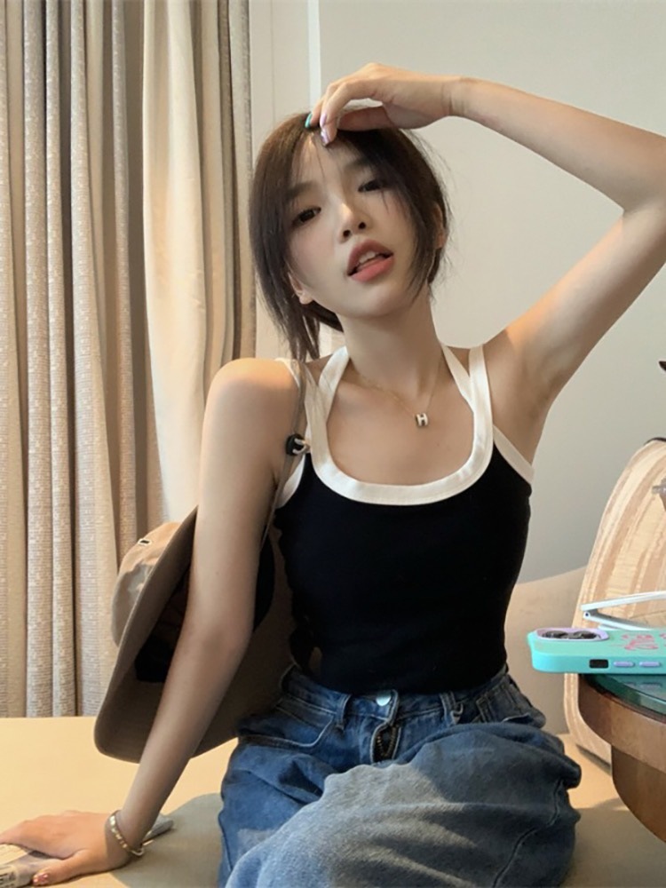 여름 얇은 달콤하고 매운 색상 매칭 캐미솔 여성용 크로스 섹시 짧은 겉옷 내부 아름다운 등 탄성 슬림 핏