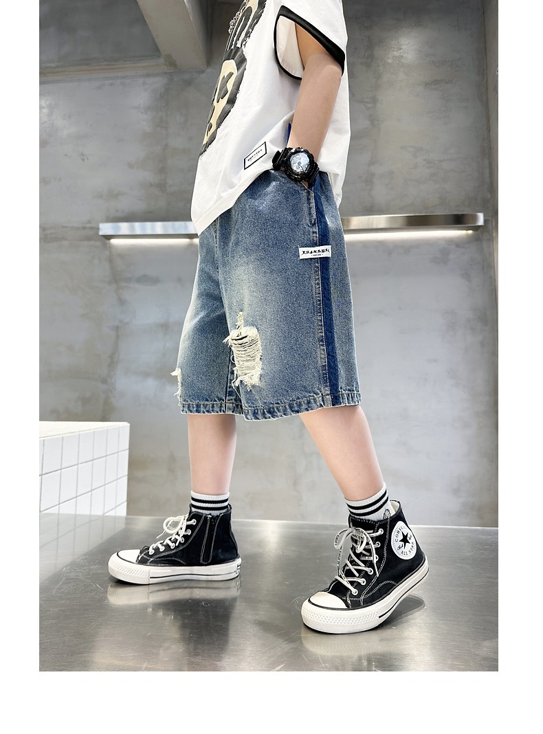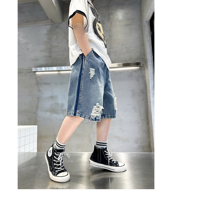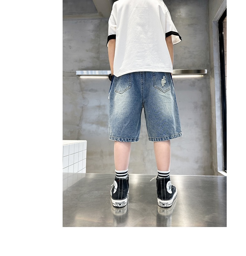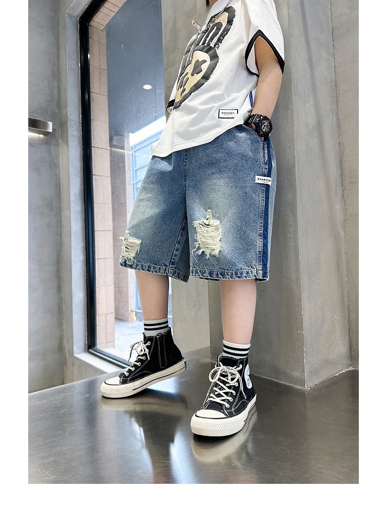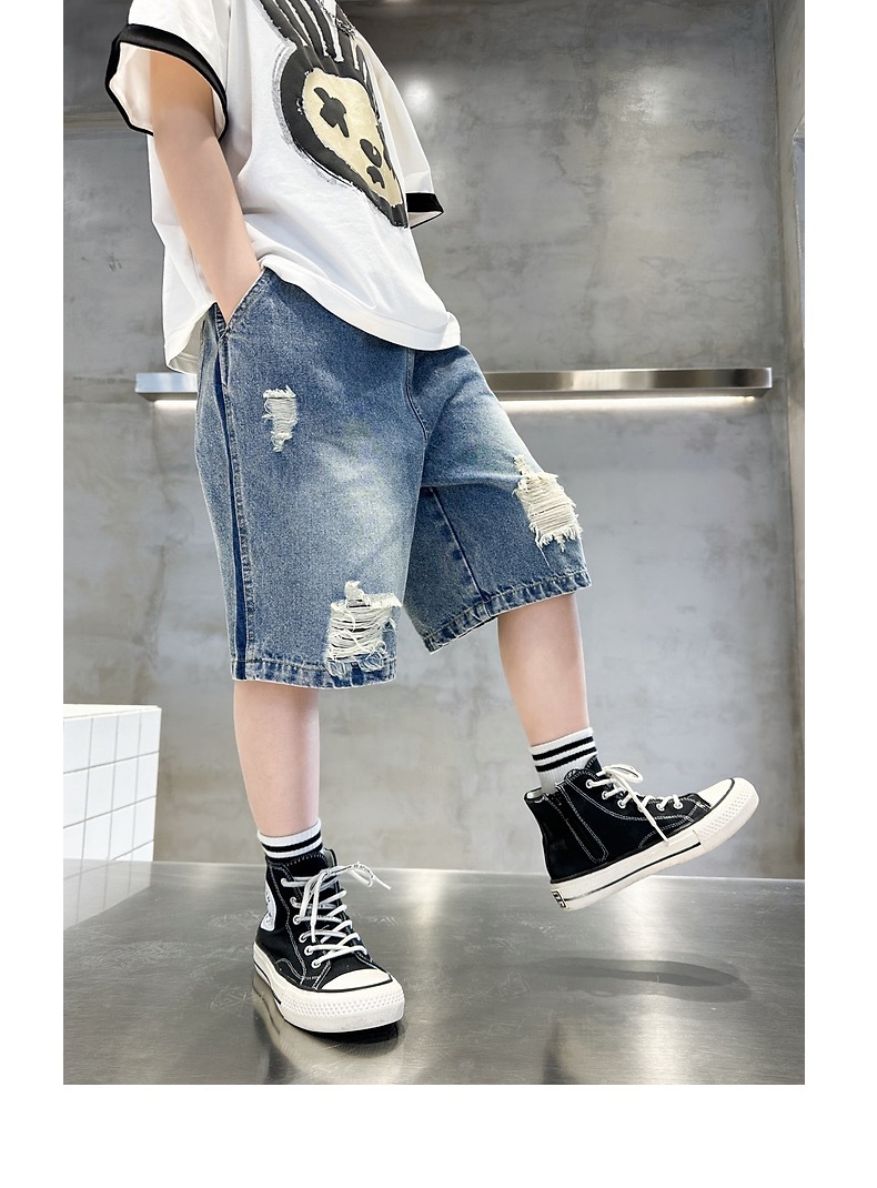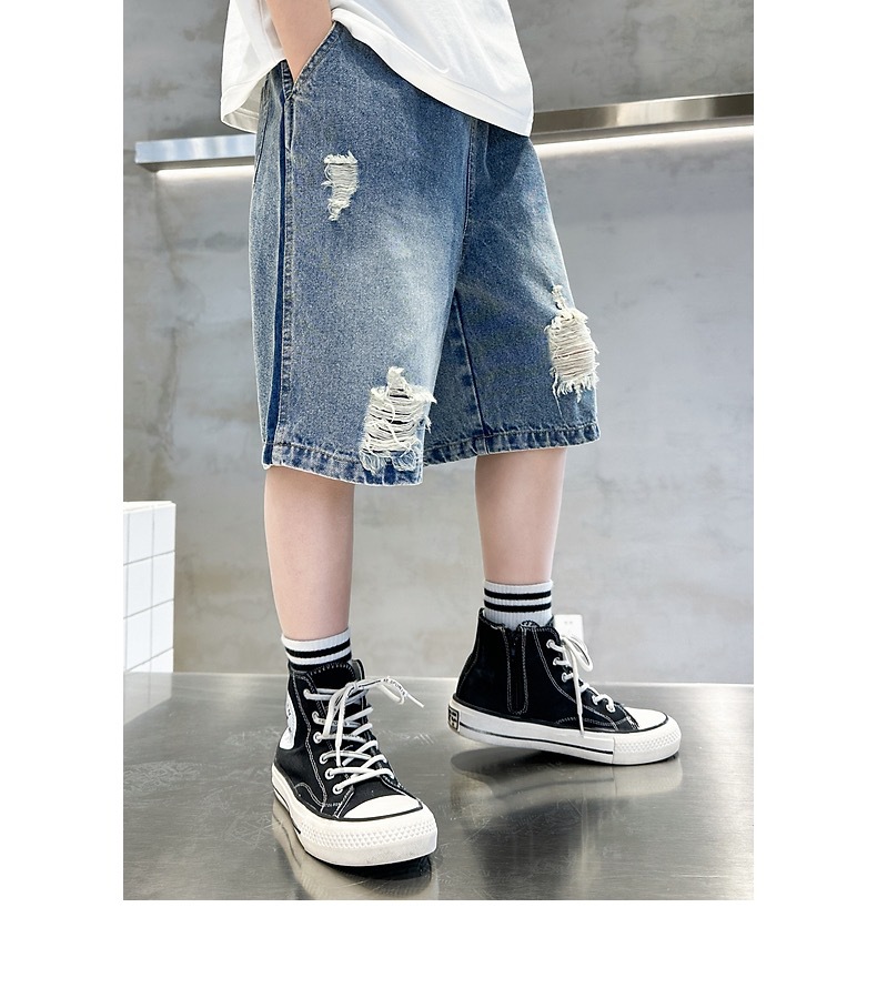 어린이용 한국판 2026 여름 신상 찢어진 데님 반바지, 중대형 어린이용 여름 얇은 바지, 5부 중간 길이 바지스토어 가기