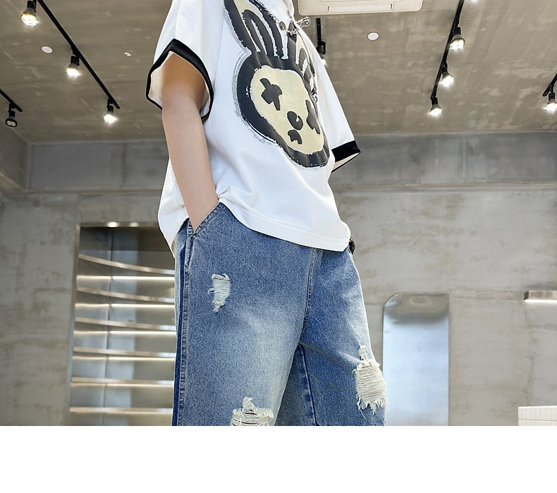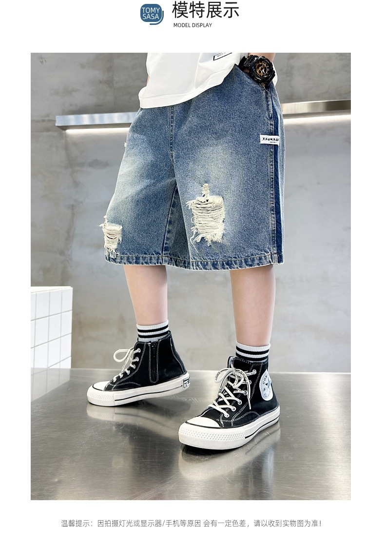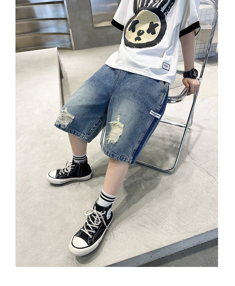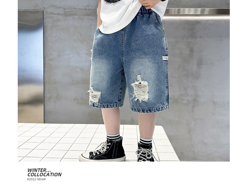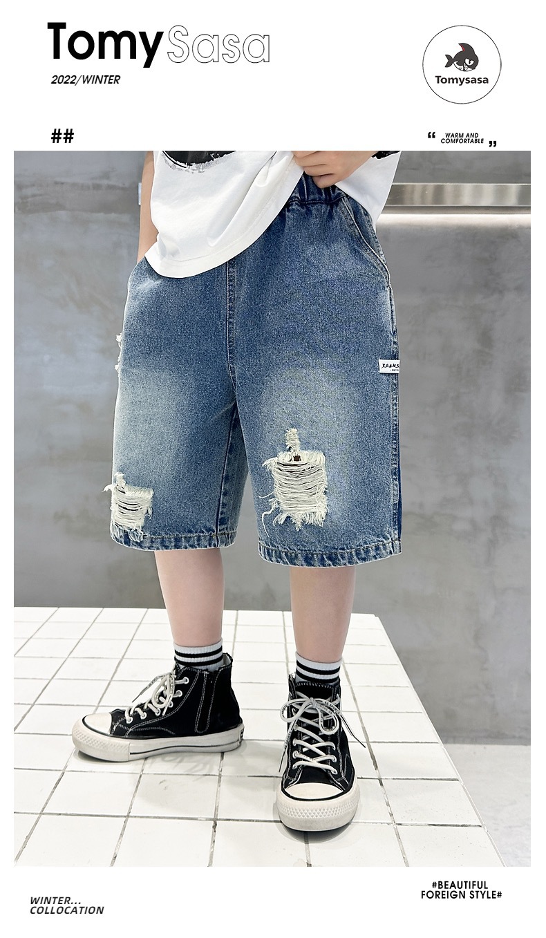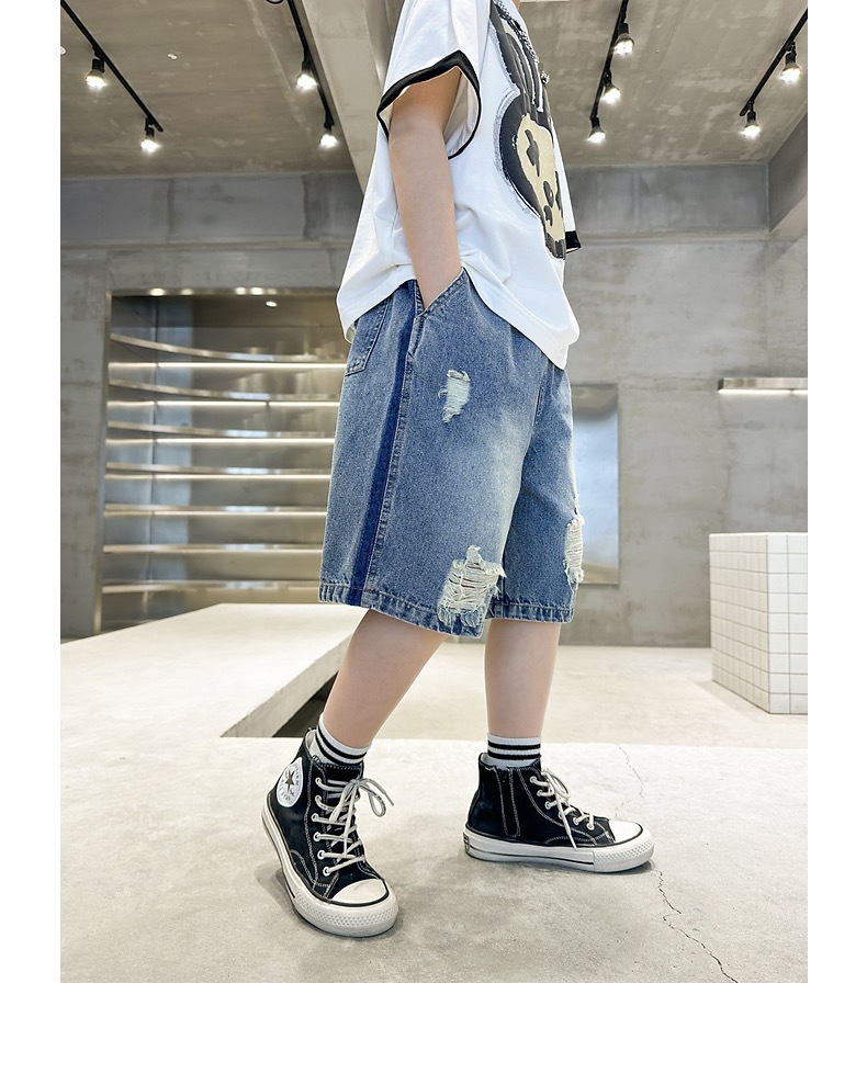 어린이용 한국판 2026 여름 신상 찢어진 데님 반바지, 중대형 어린이용 여름 얇은 바지, 5부 중간 길이 바지스토어 가기