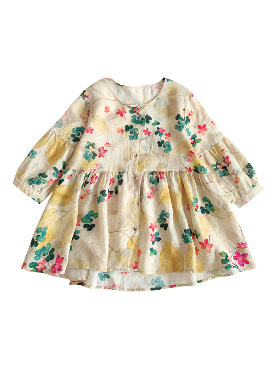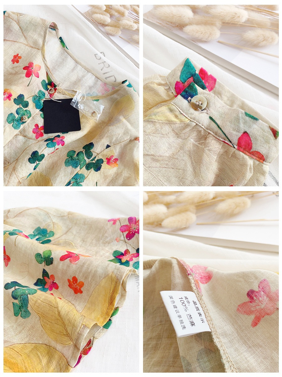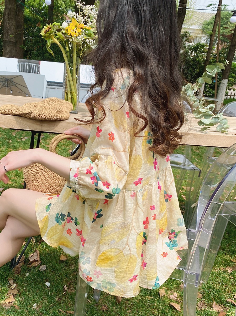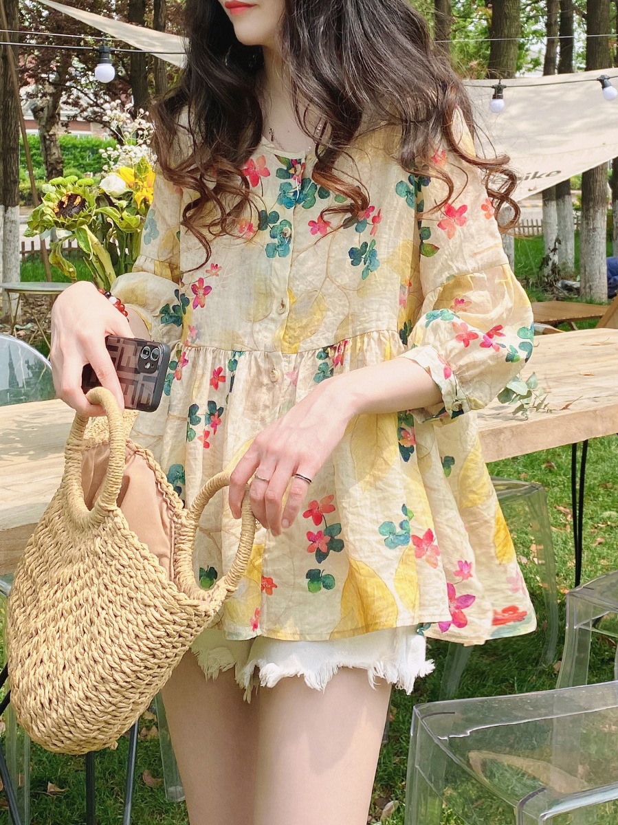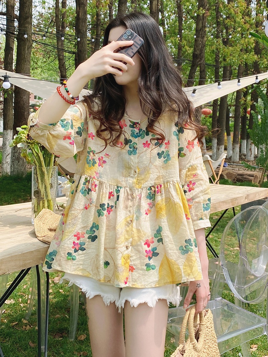 인형 셔츠 탑 한국 스타일 느슨한 통근 달콤한 서양 스타일 꽃 라미 퍼프 셔츠 중간 소매 셔츠
