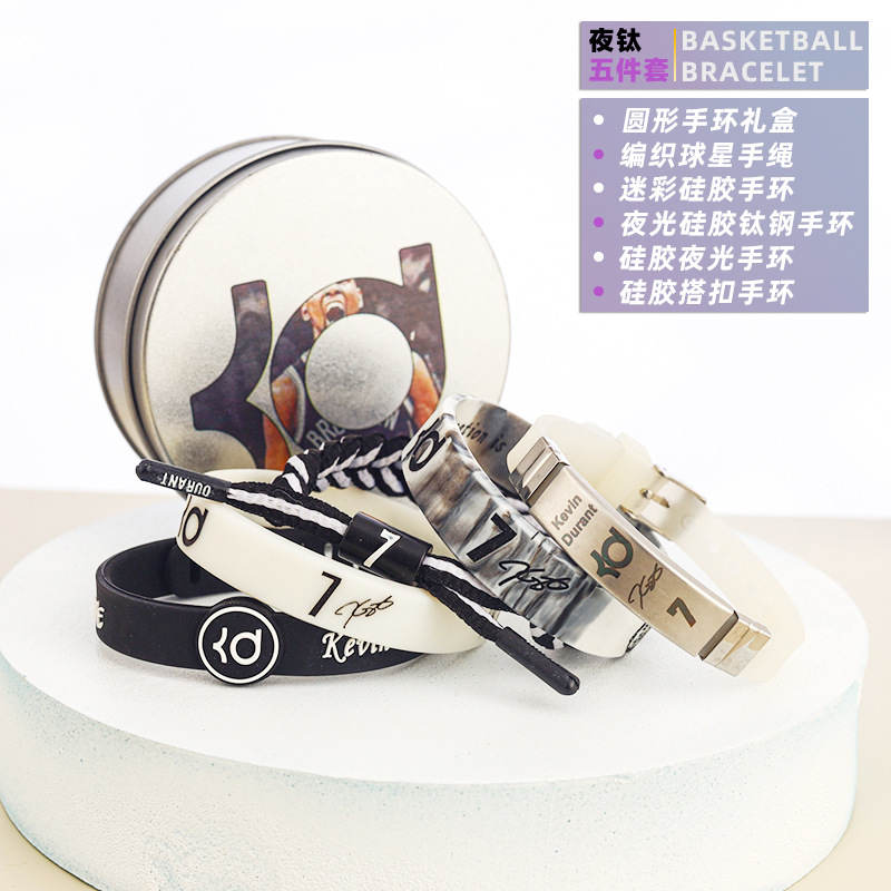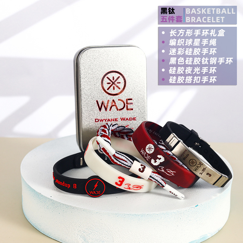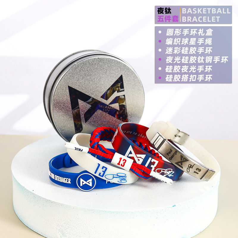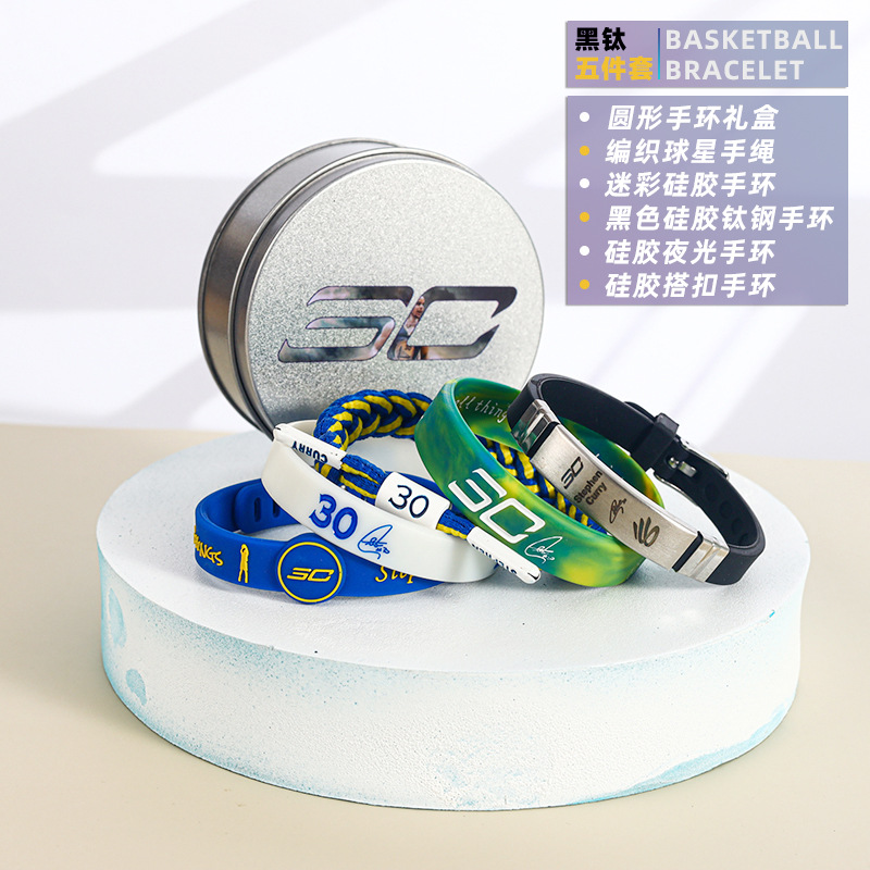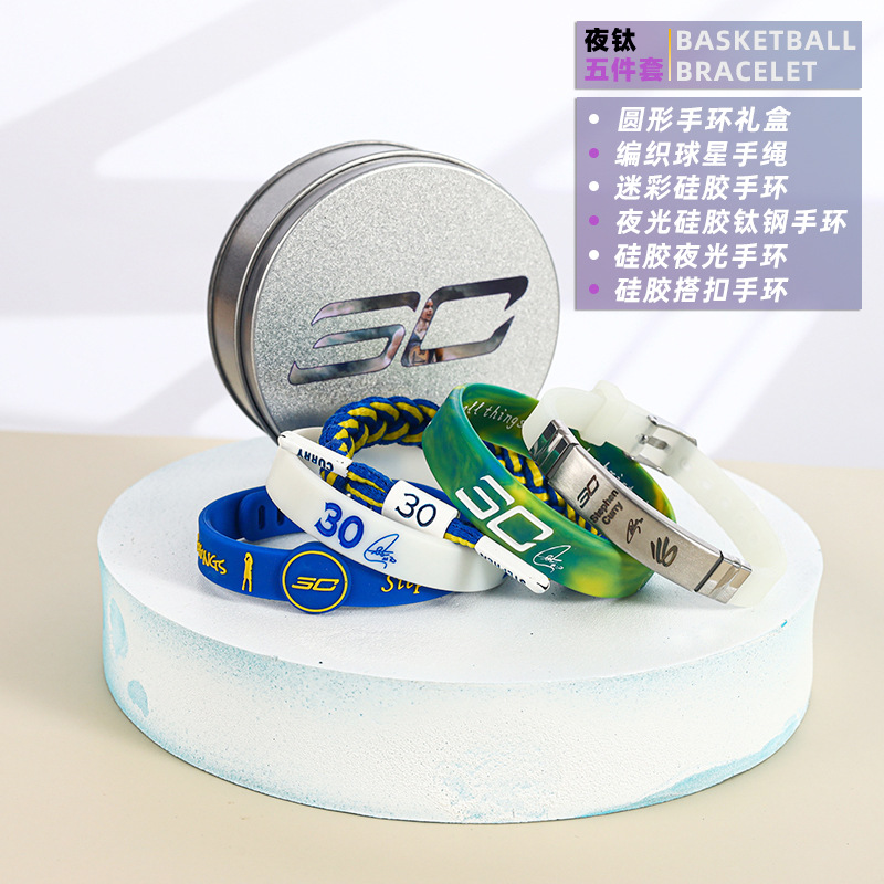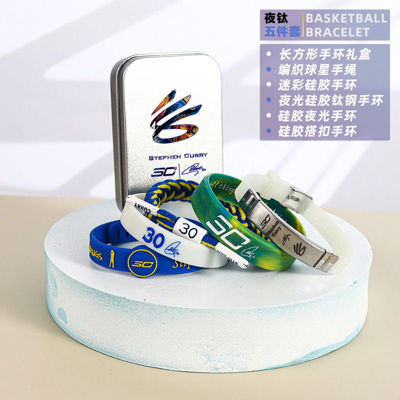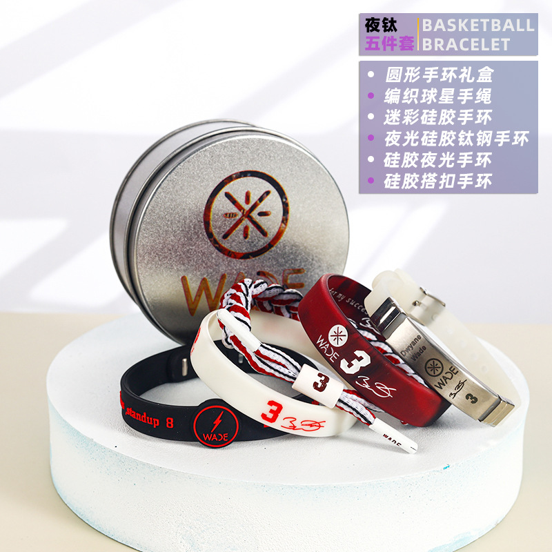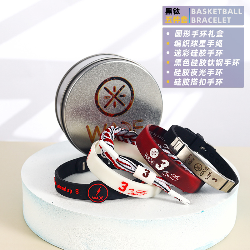농구 팔찌 두꺼운 실리콘 발광 스포츠 팔찌 스타 꼰 핸드 로프 티타늄 스틸 팔찌 5 피스 선물 상자스토어 가기