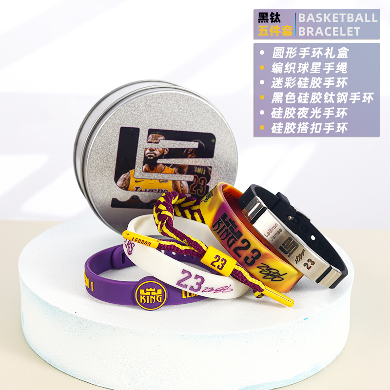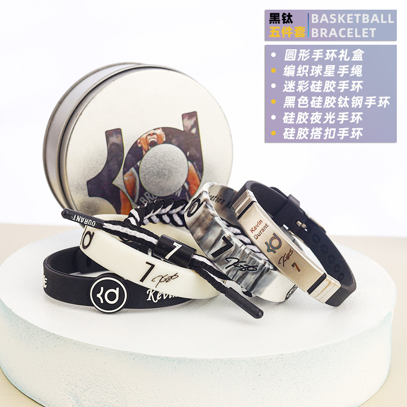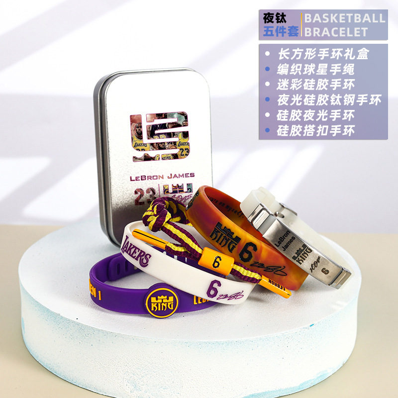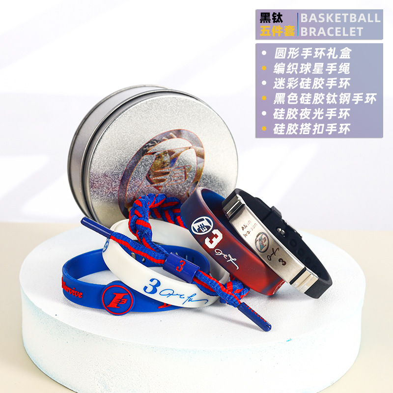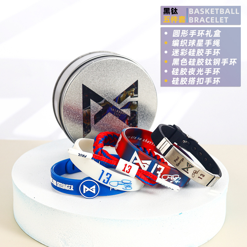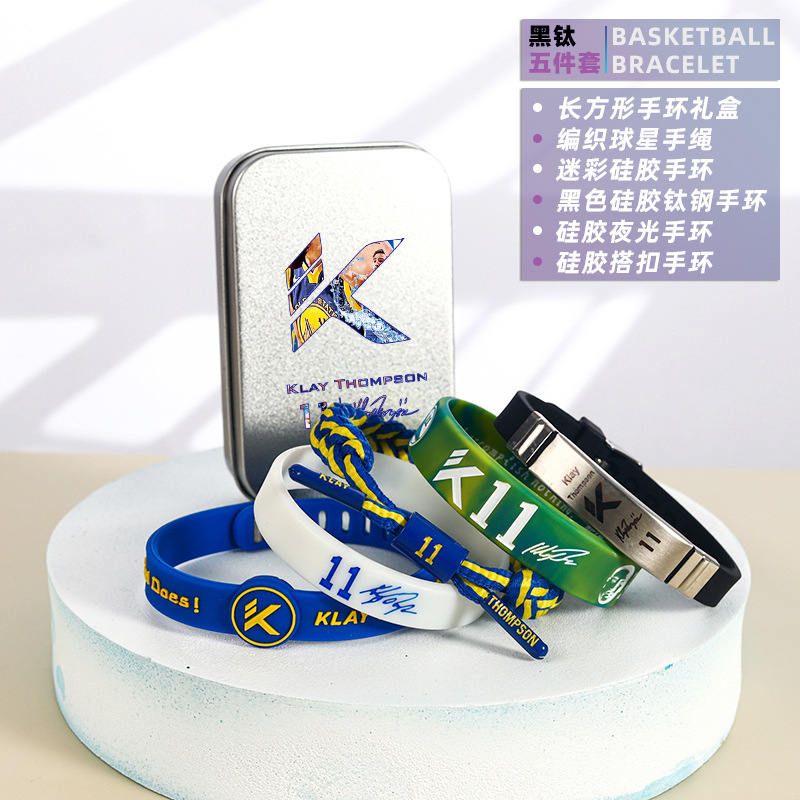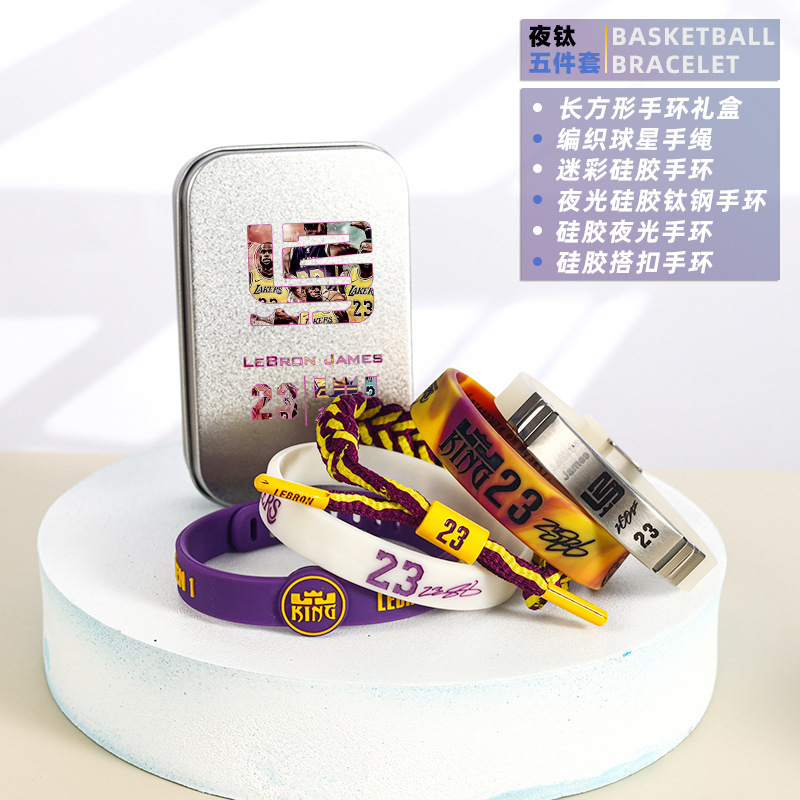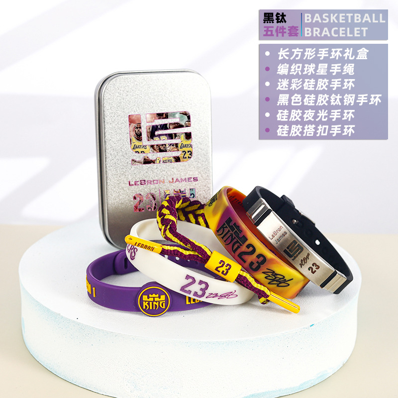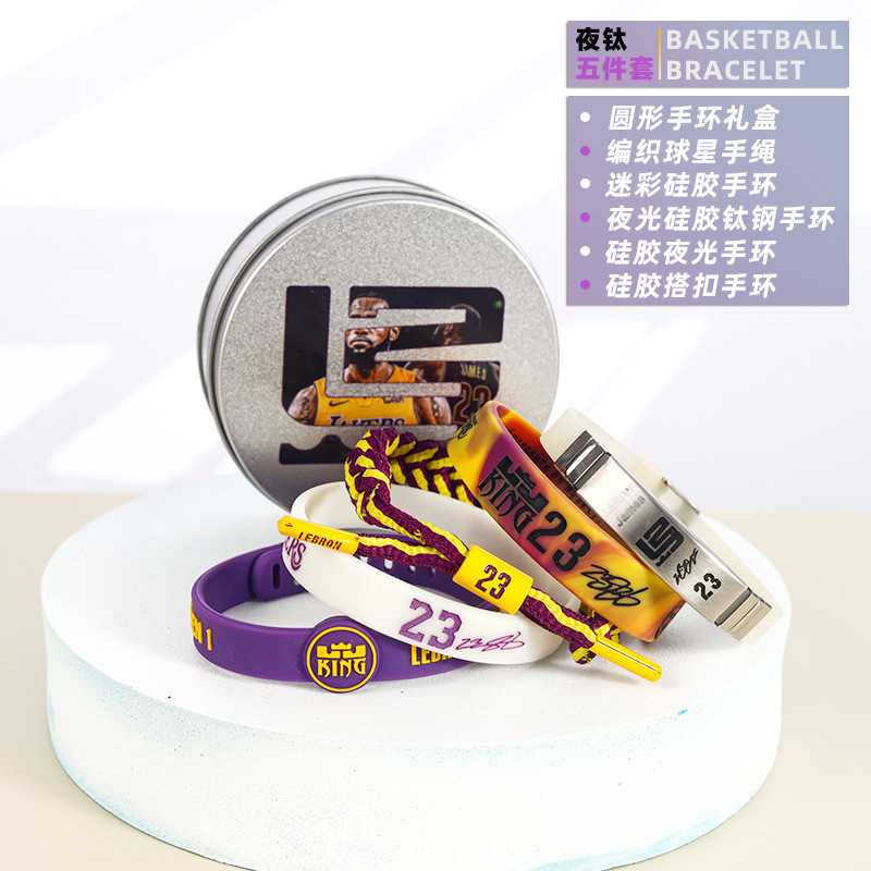농구 팔찌 두꺼운 실리콘 발광 스포츠 팔찌 스타 꼰 핸드 로프 티타늄 스틸 팔찌 5 피스 선물 상자스토어 가기
