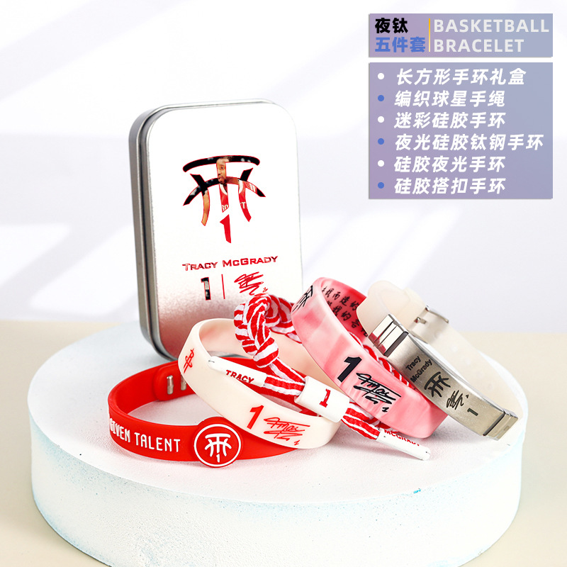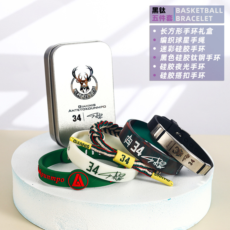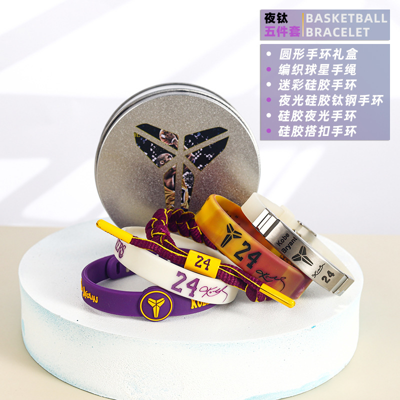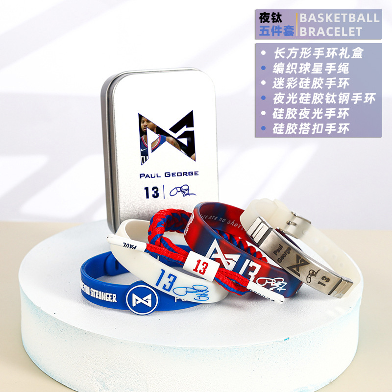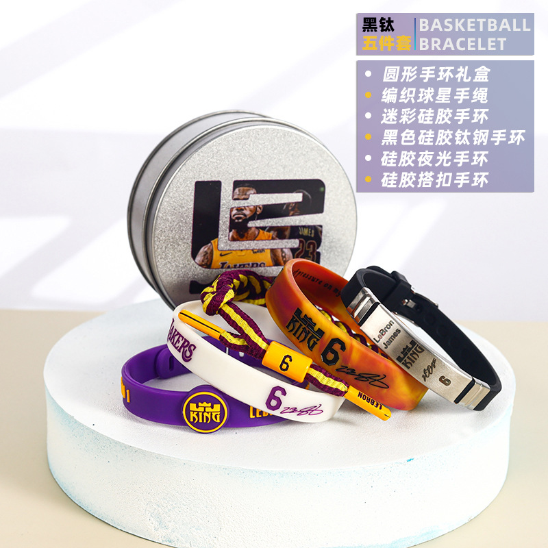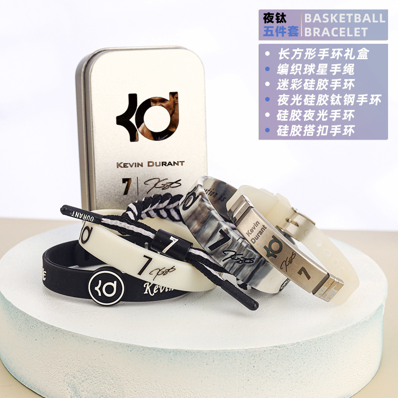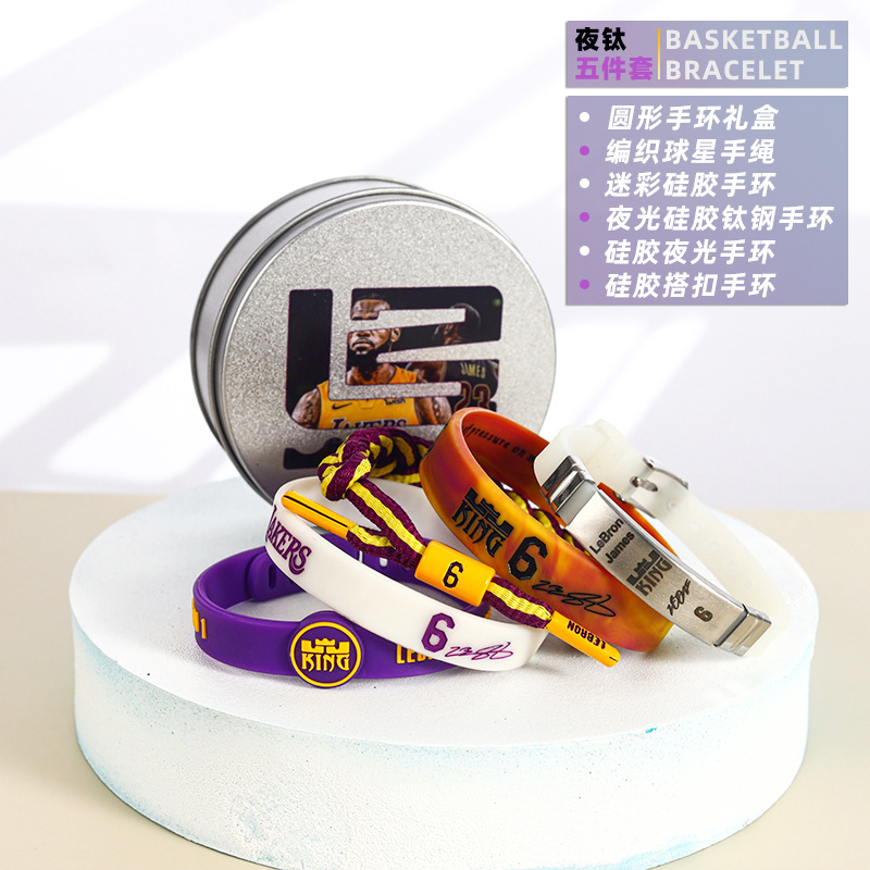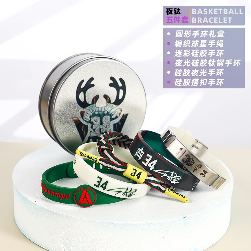 농구 팔찌 두꺼운 실리콘 발광 스포츠 팔찌 스타 꼰 핸드 로프 티타늄 스틸 팔찌 5 피스 선물 상자스토어 가기