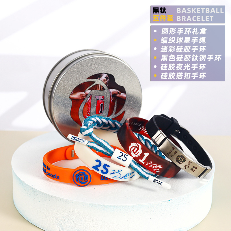 농구 팔찌 두꺼운 실리콘 발광 스포츠 팔찌 스타 꼰 핸드 로프 티타늄 스틸 팔찌 5 피스 선물 상자