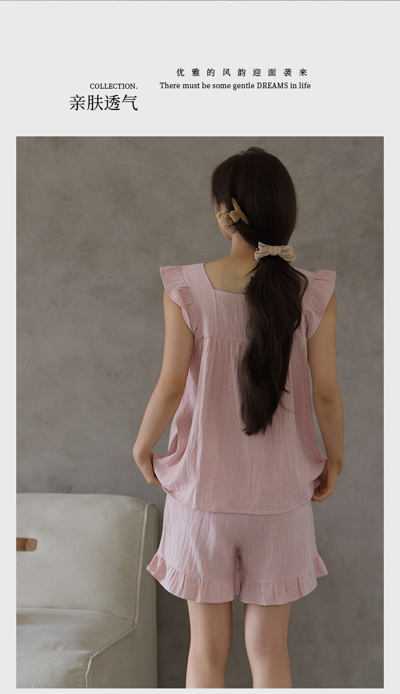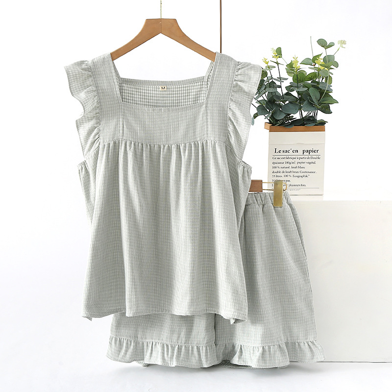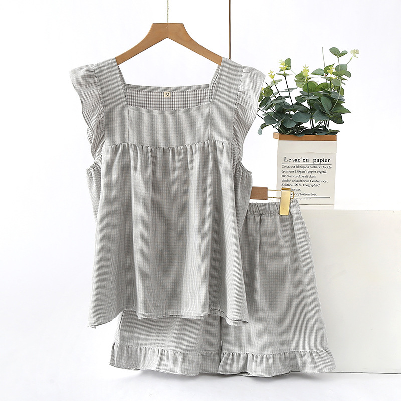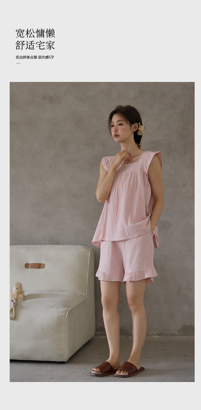 새로운 여름 순면 더블 레이어 거즈 여성용 잠옷 얇은 민소매 조끼 반바지 겉옷 가정복 세트