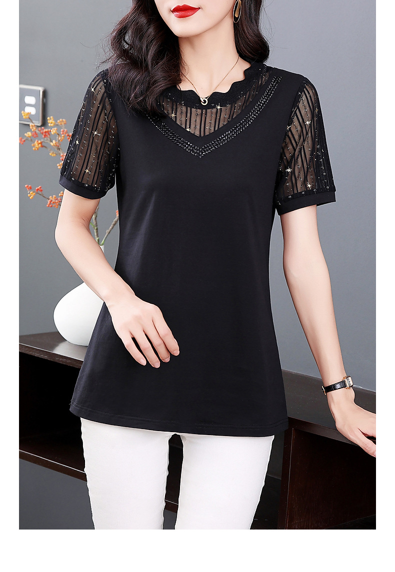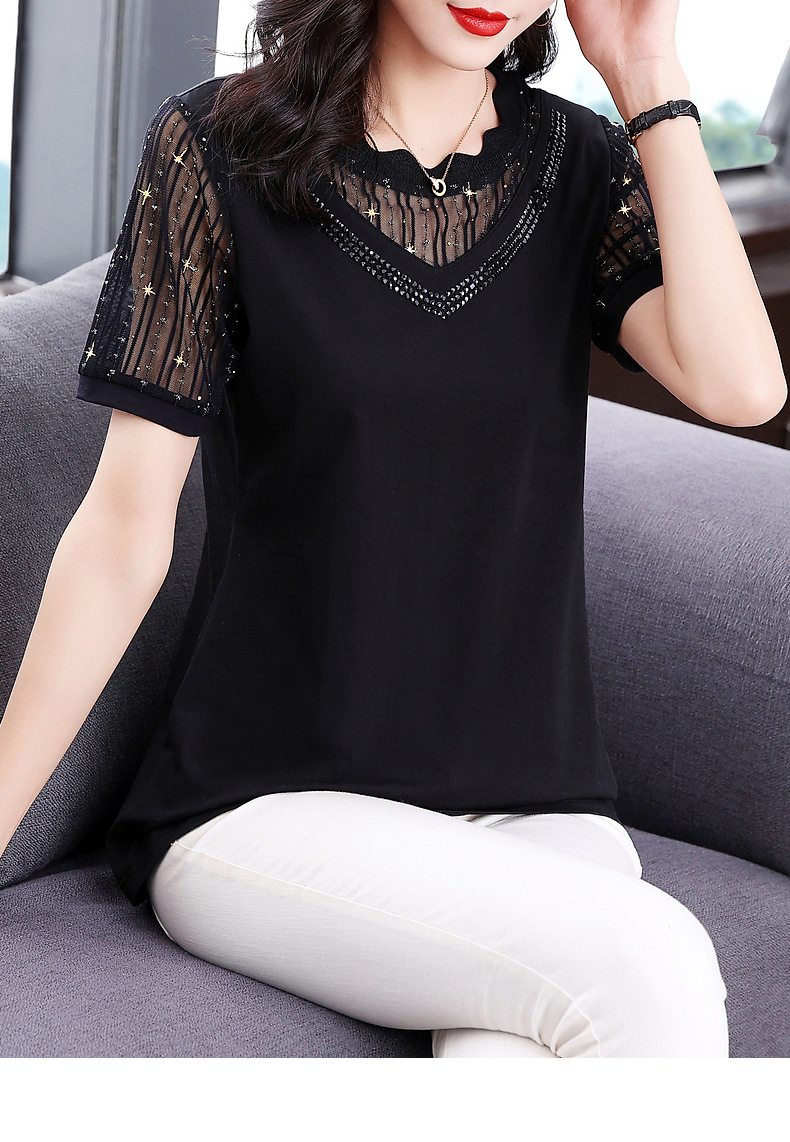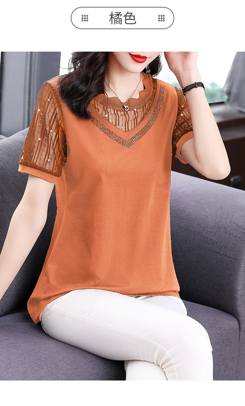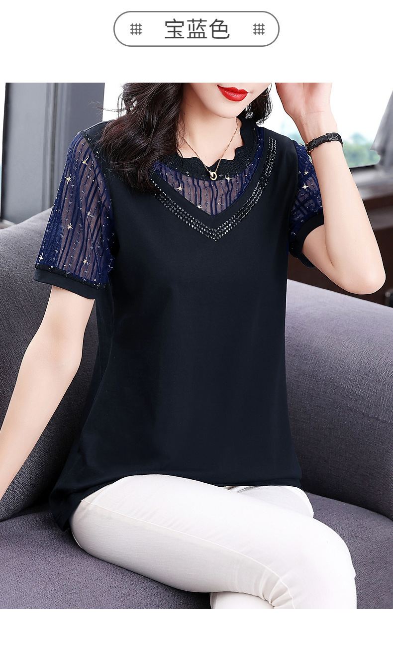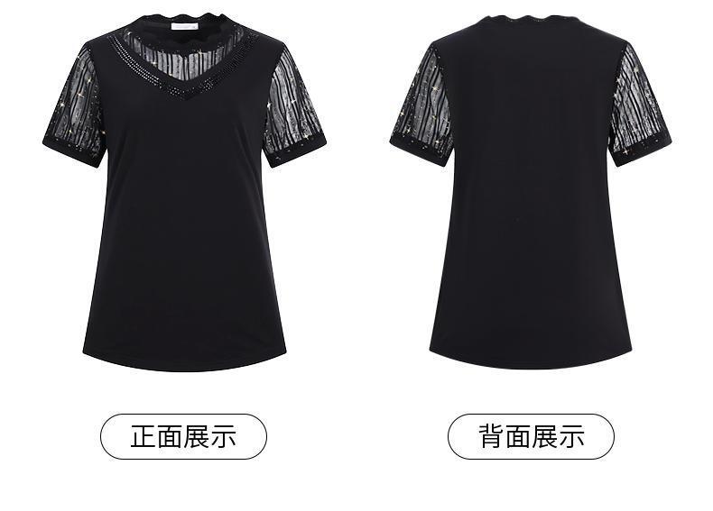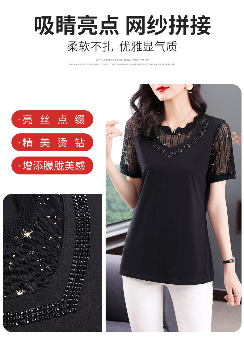 대외 무역 도매 메쉬 패치워크 반팔 티셔츠 여성복 큰 사이즈 2025 신상 엄마복 다이아몬드 장식 여성 상의 트렌디스토어 가기