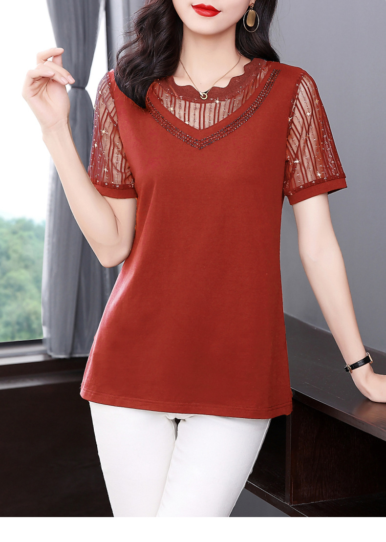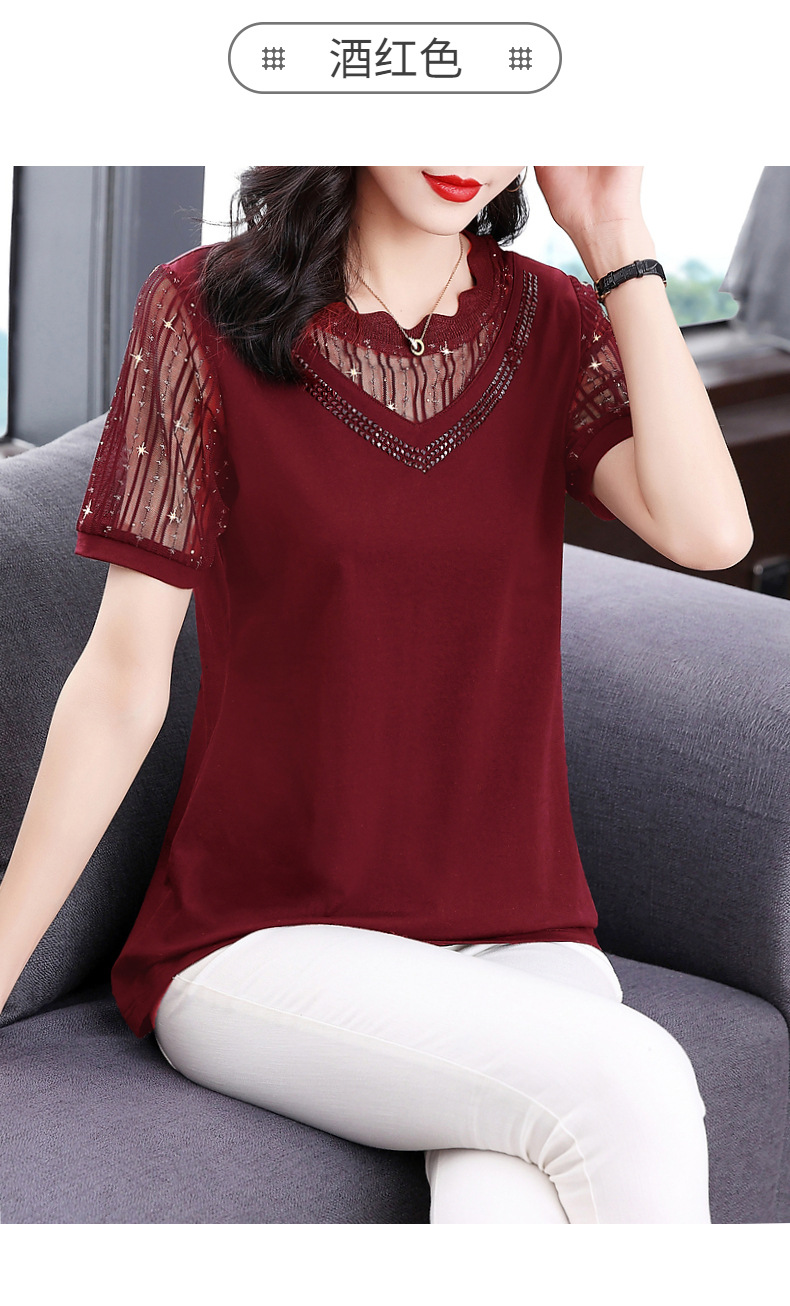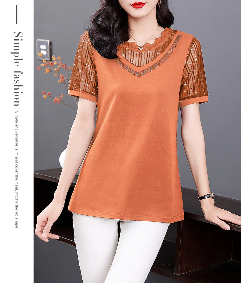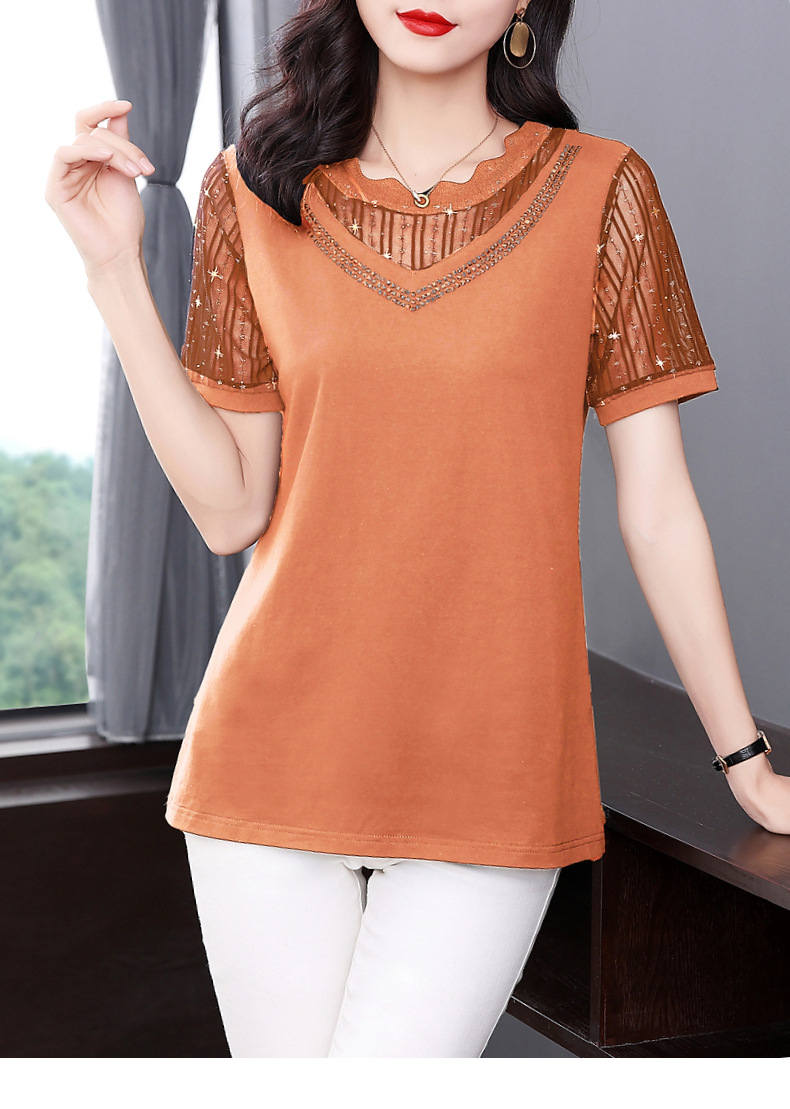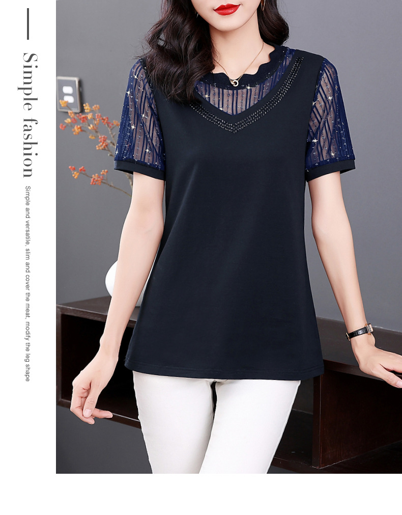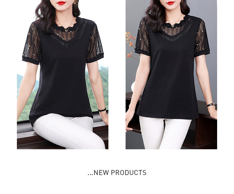 대외 무역 도매 메쉬 패치워크 반팔 티셔츠 여성복 큰 사이즈 2025 신상 엄마복 다이아몬드 장식 여성 상의 트렌디스토어 가기