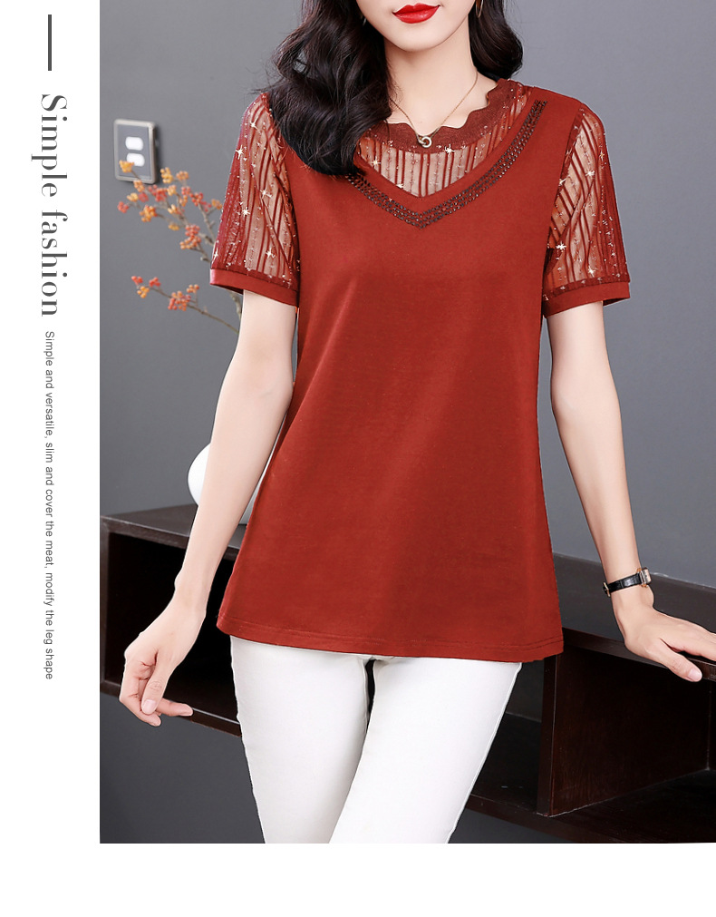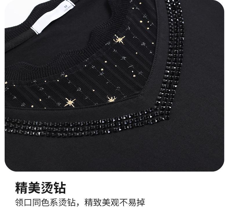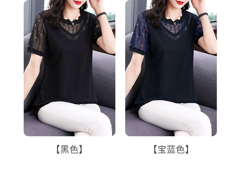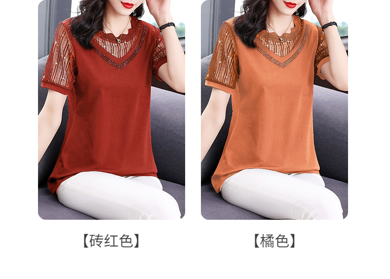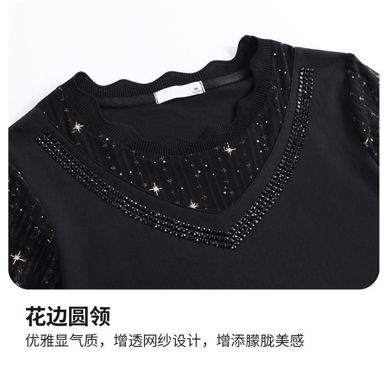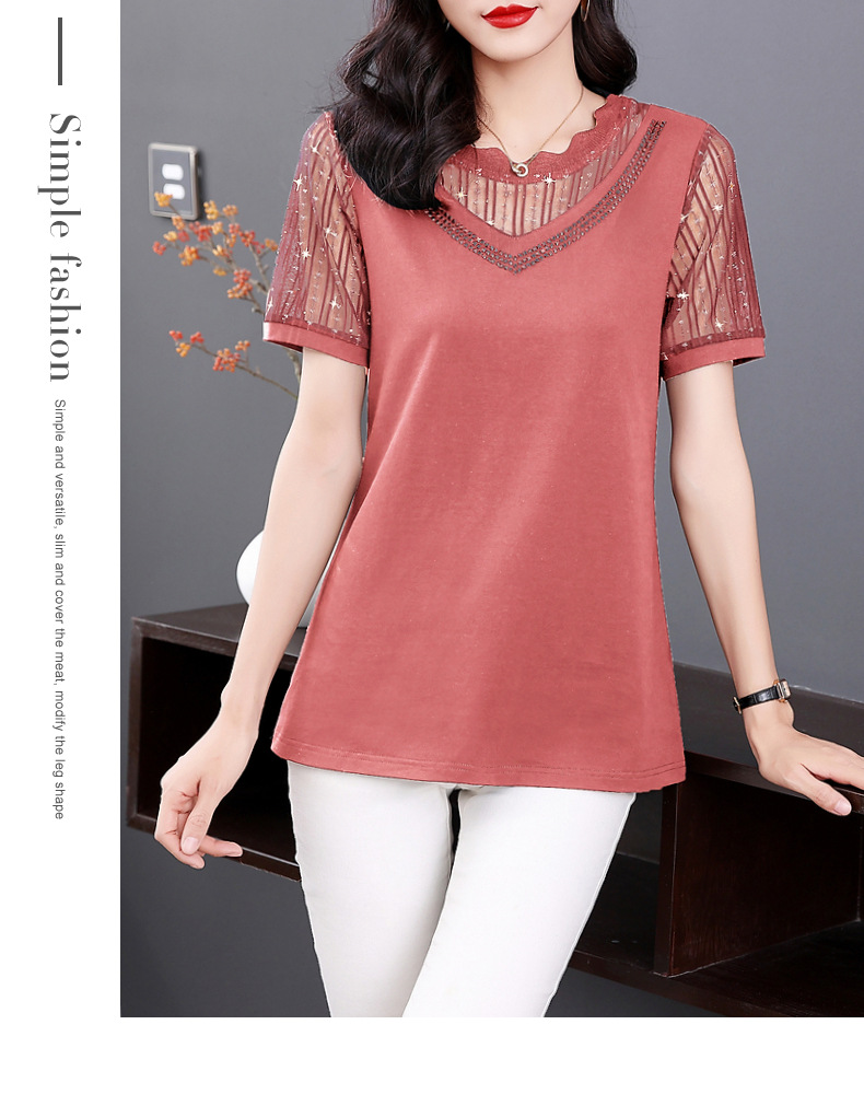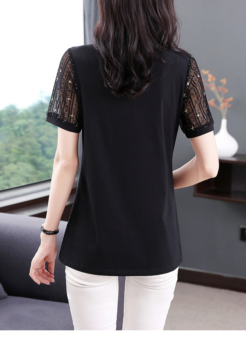 대외 무역 도매 메쉬 패치워크 반팔 티셔츠 여성복 큰 사이즈 2025 신상 엄마복 다이아몬드 장식 여성 상의 트렌디스토어 가기