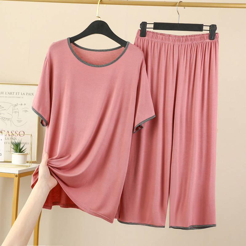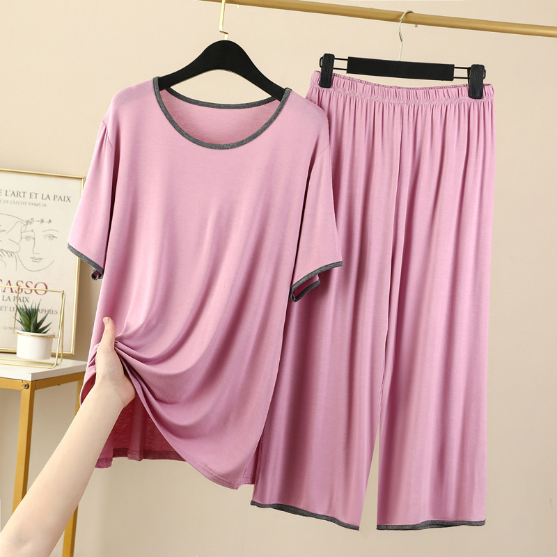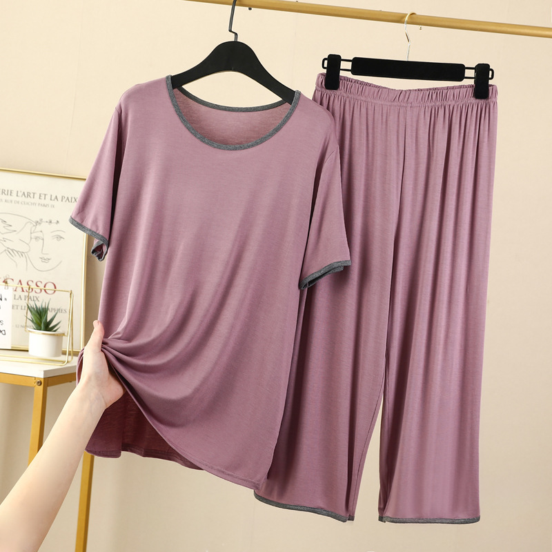 여름 얇은 모달 잠옷 여자의 느슨한 캐주얼 아이스 실크 반팔 카프리 바지 가정 옷 세트 겉옷스토어 가기