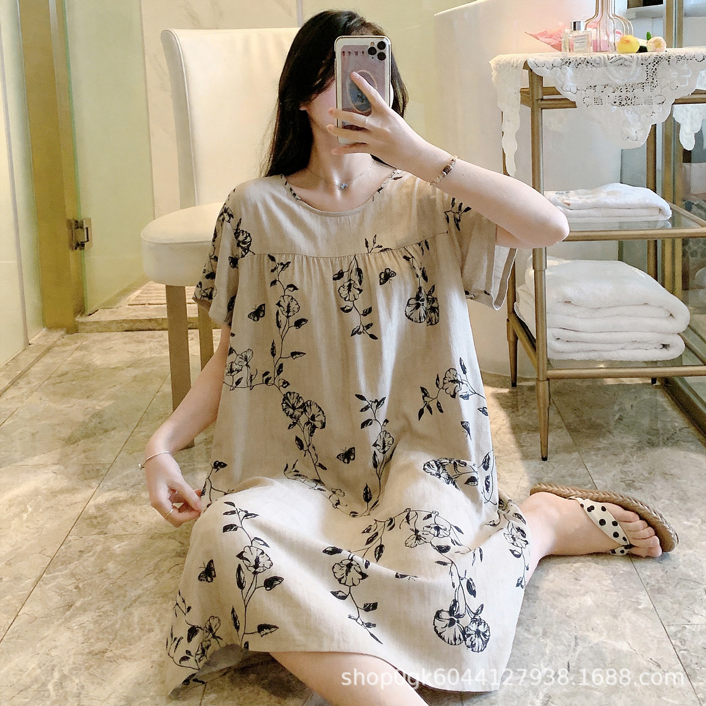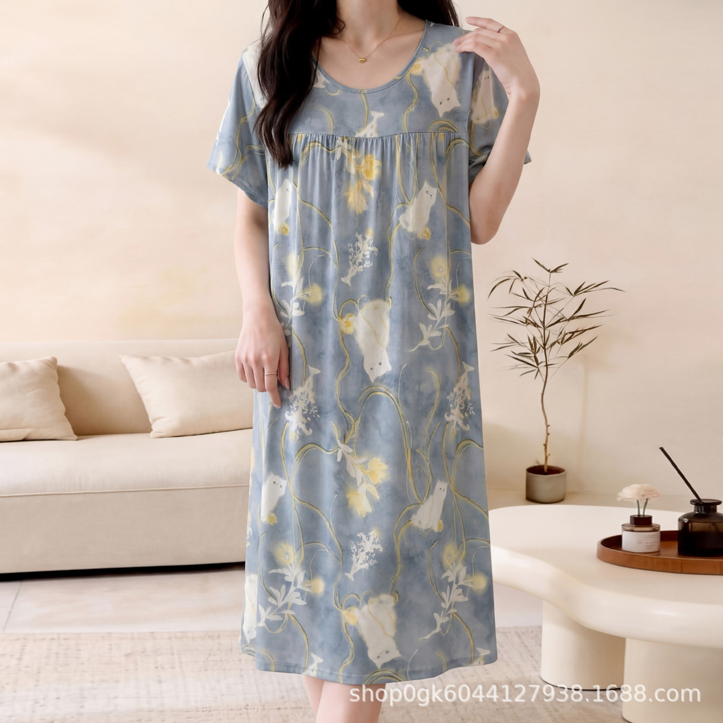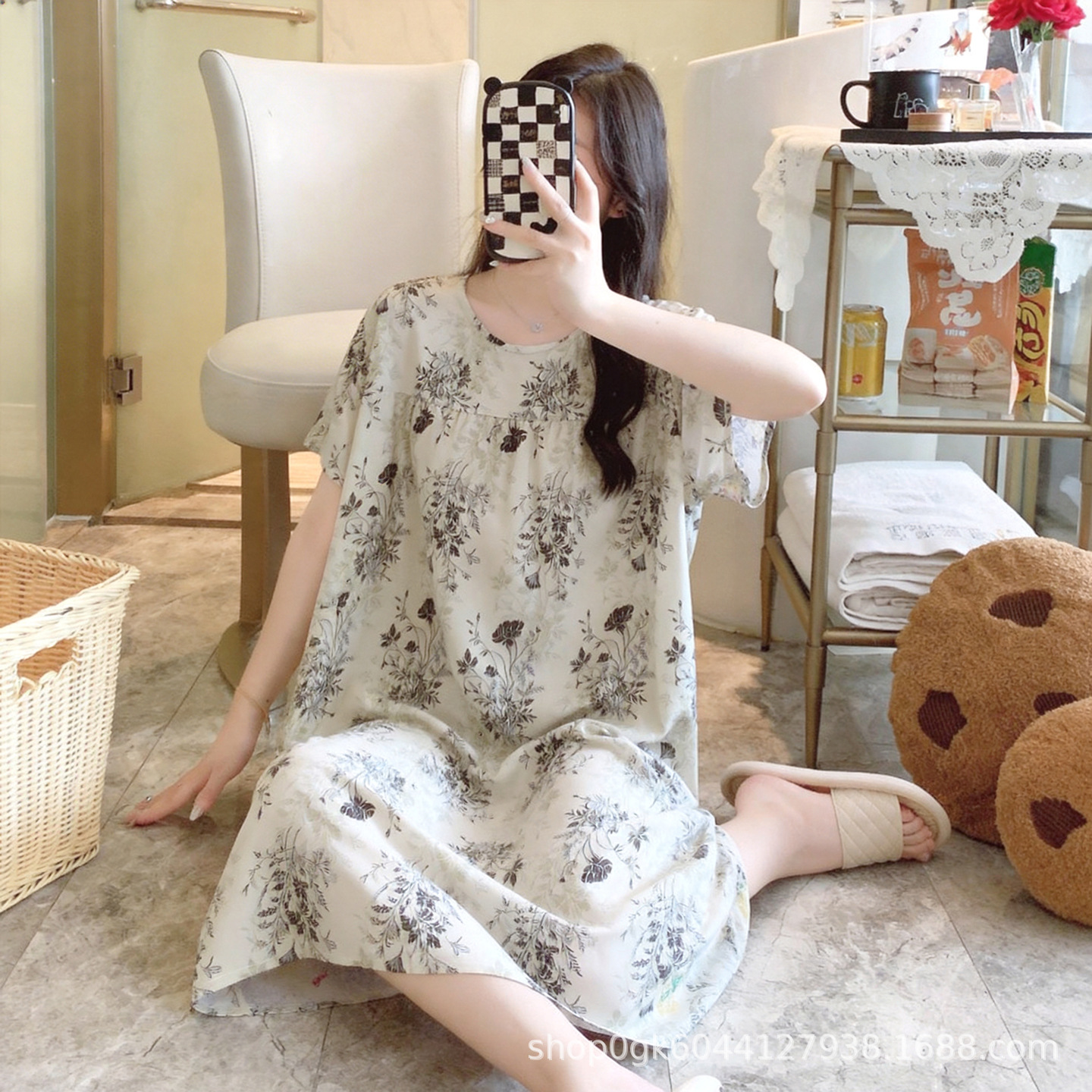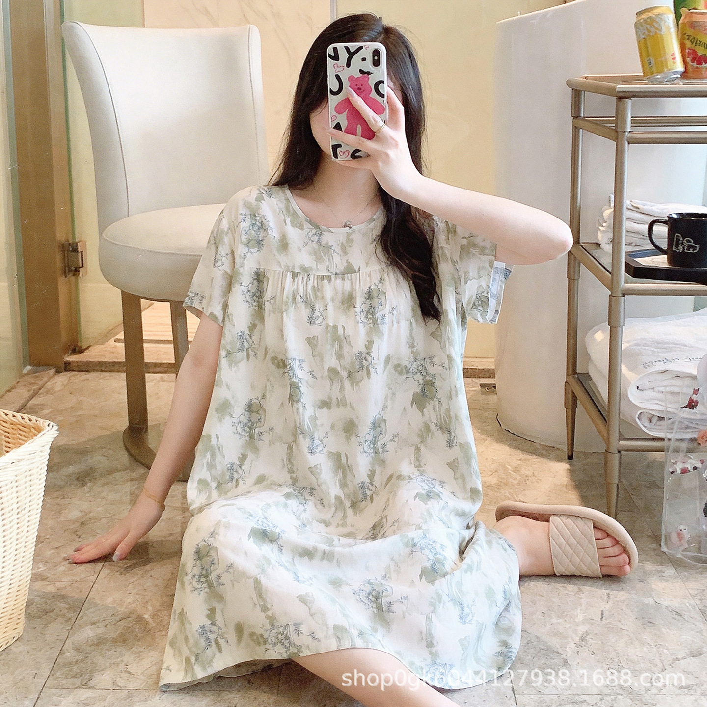 면 실크 나이트 드레스 여성의 여름 얇은 잠옷 홈 하이 엔드 센스 인쇄 인공 면 반소매 면 실크 원피스 플러스 사이즈스토어 가기