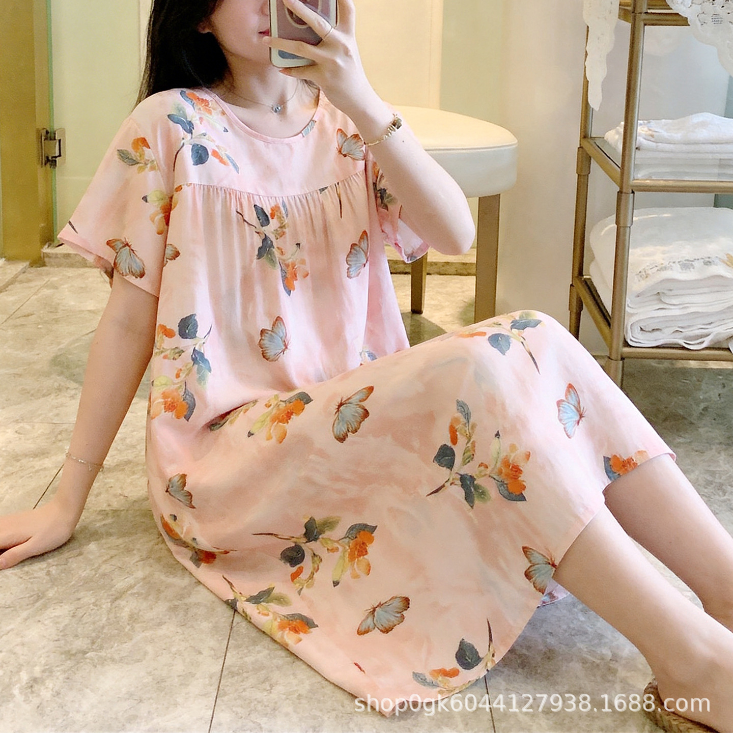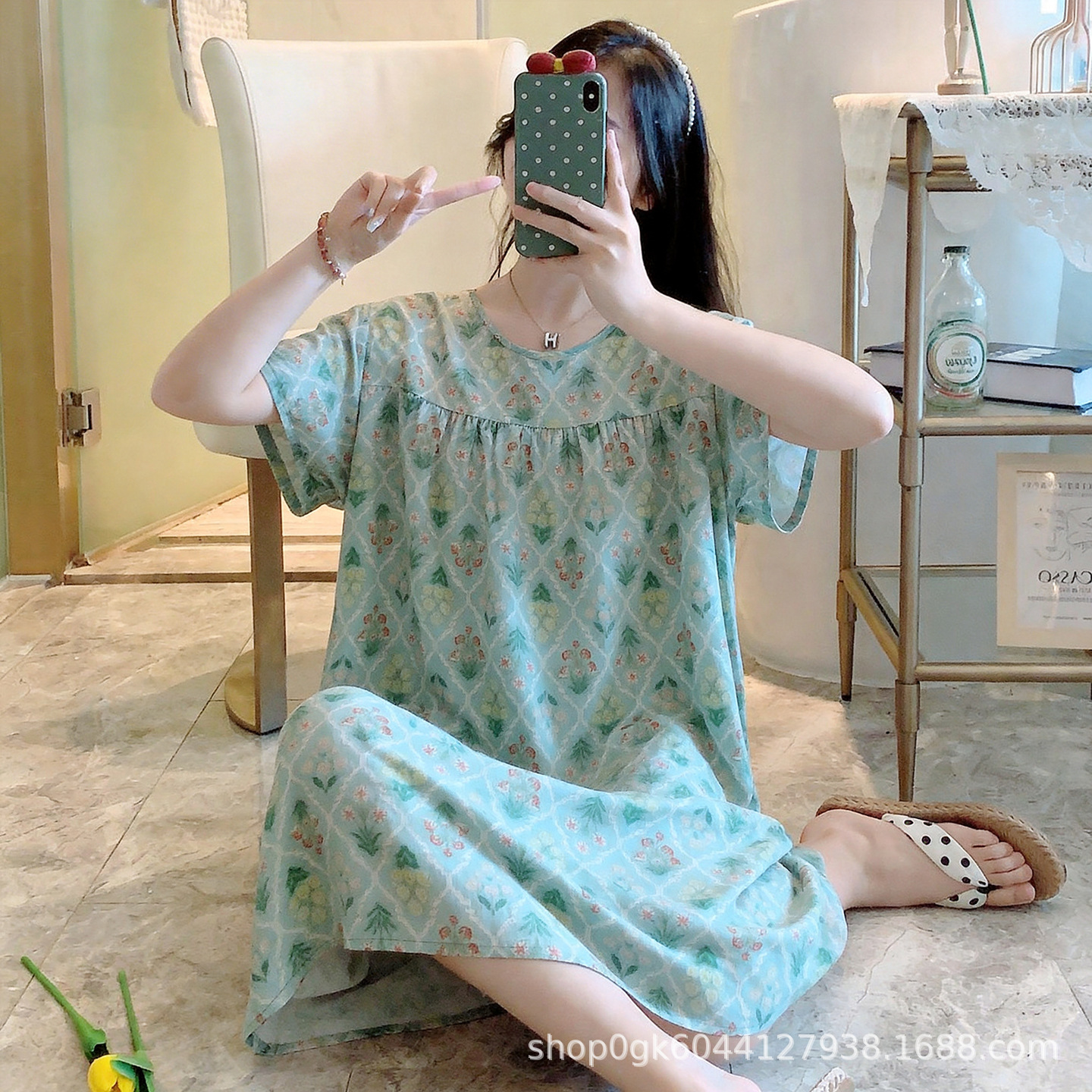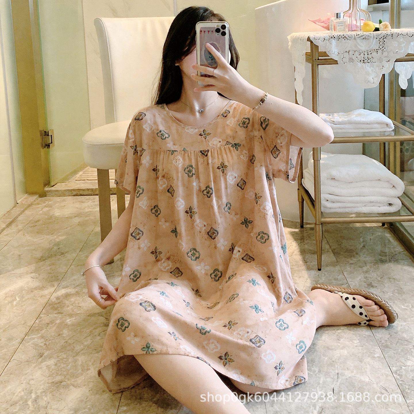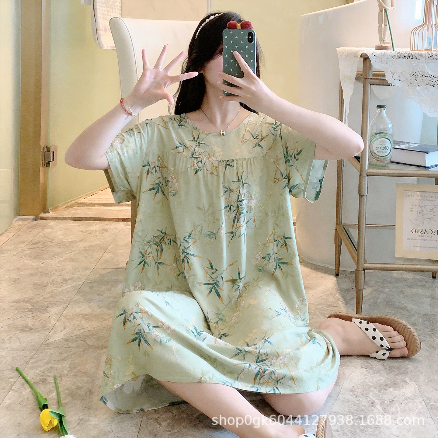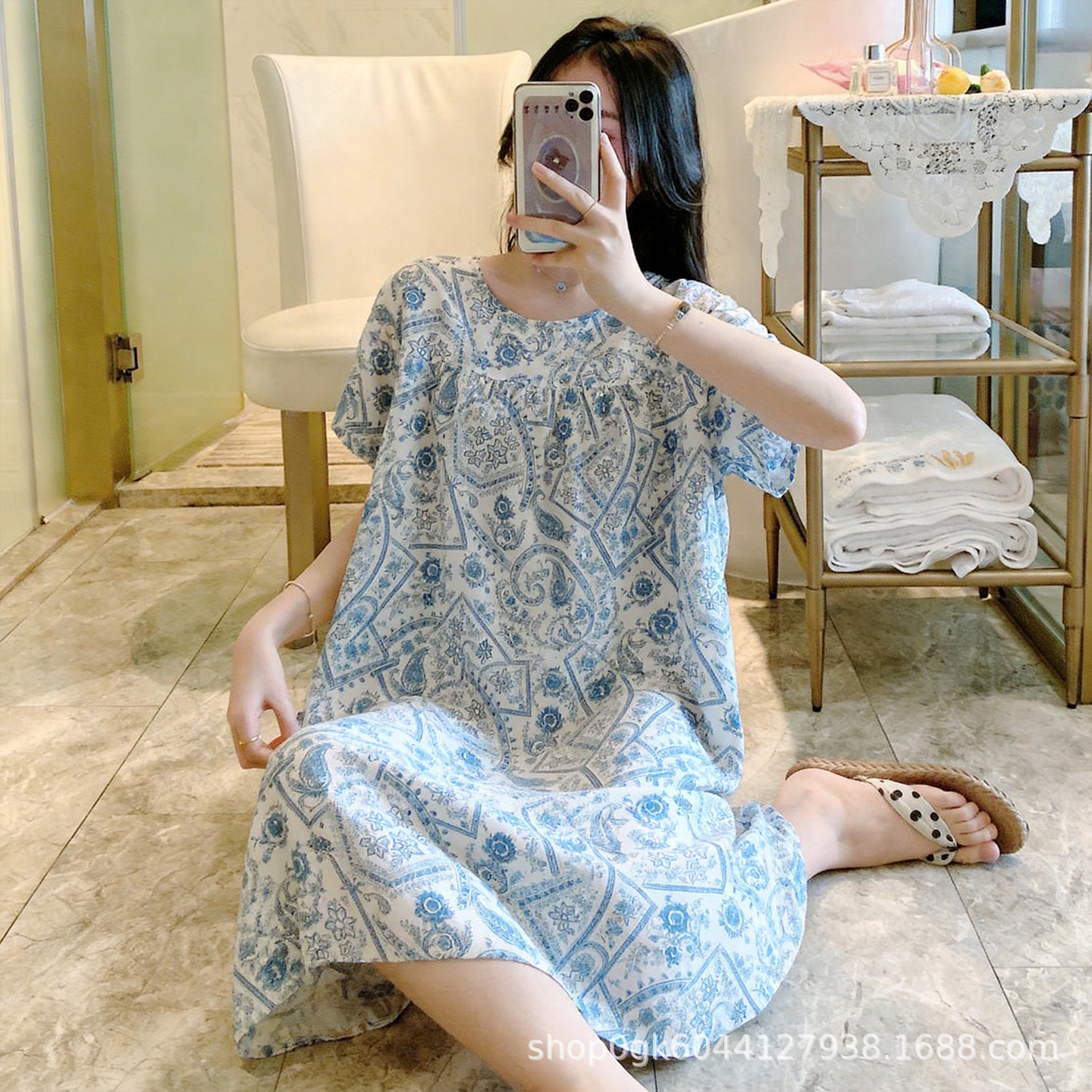 면 실크 나이트 드레스 여성의 여름 얇은 잠옷 홈 하이 엔드 센스 인쇄 인공 면 반소매 면 실크 원피스 플러스 사이즈스토어 가기