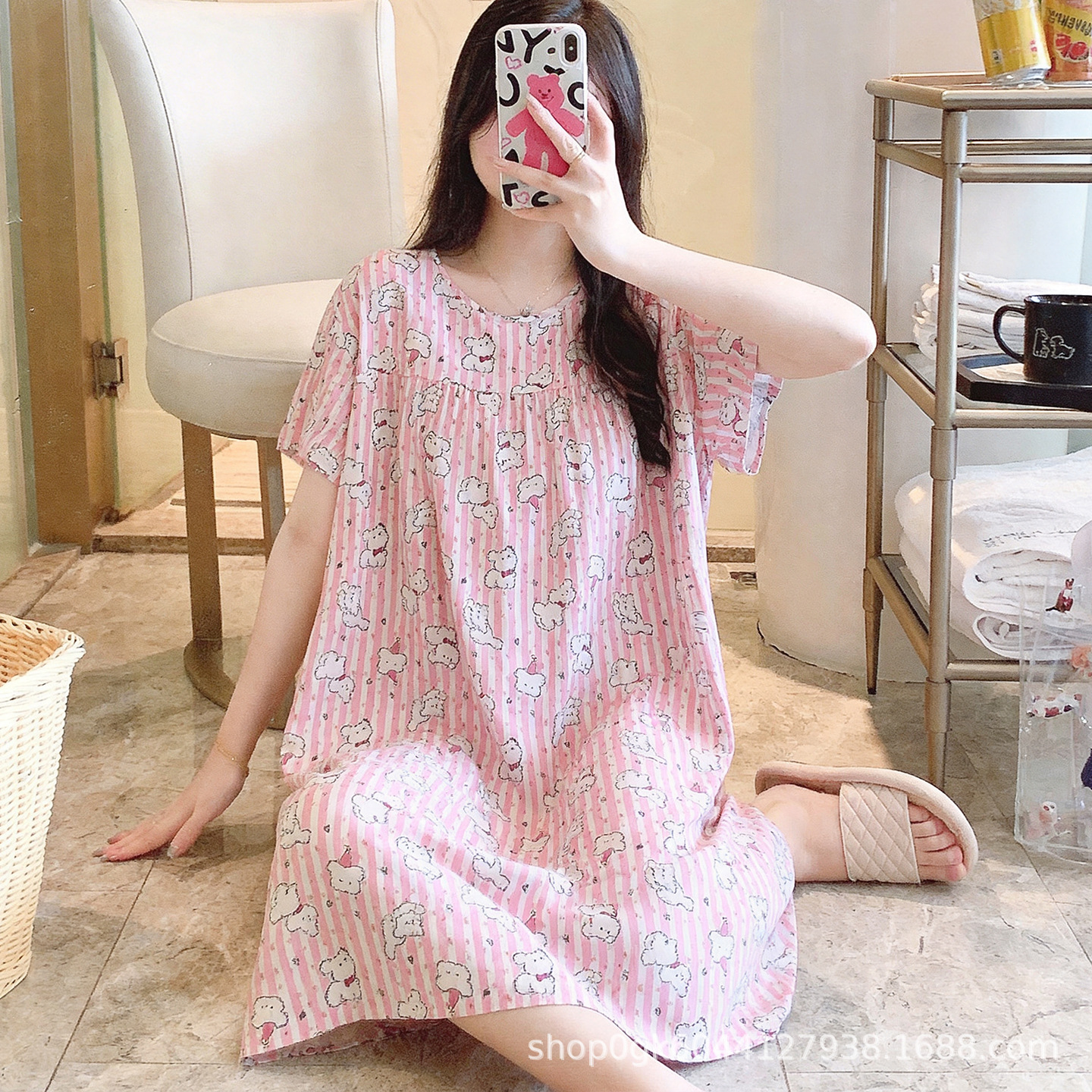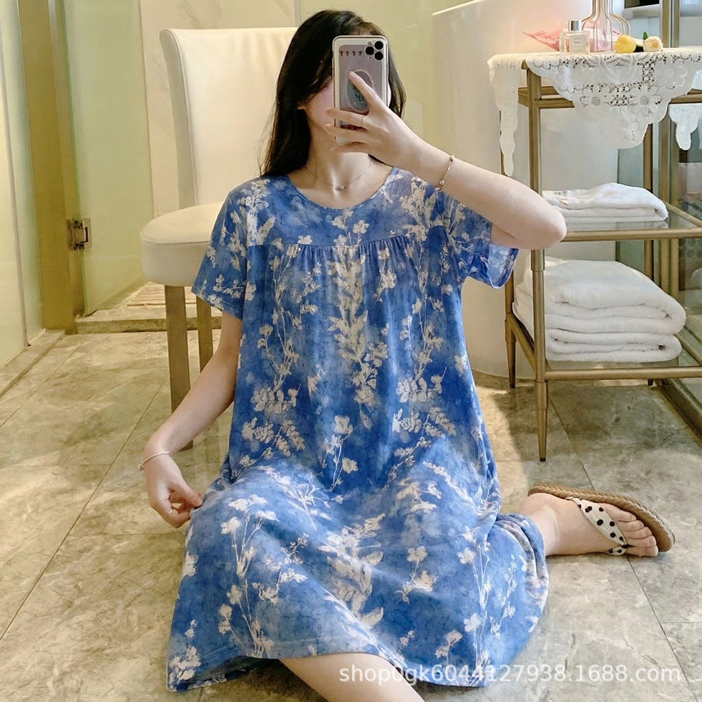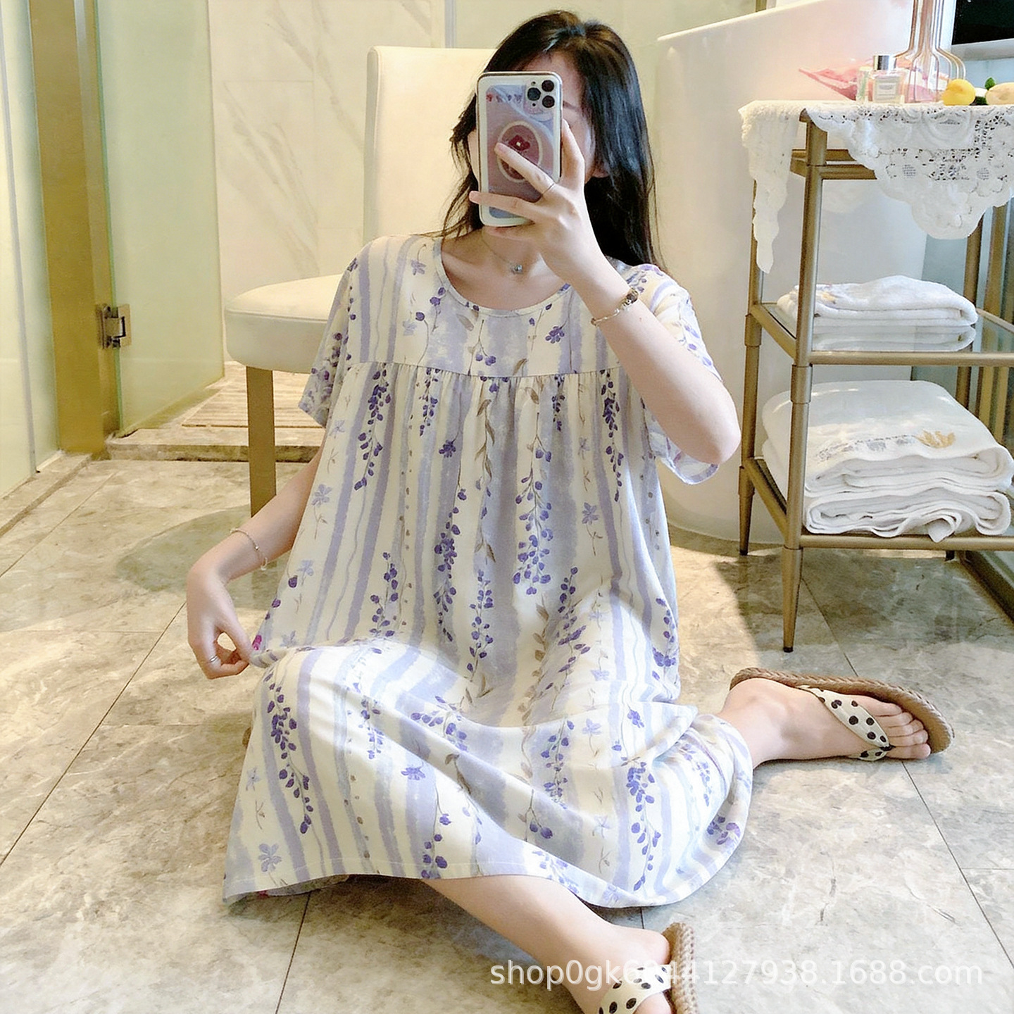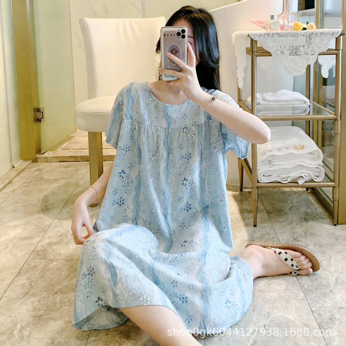 면 실크 나이트 드레스 여성의 여름 얇은 잠옷 홈 하이 엔드 센스 인쇄 인공 면 반소매 면 실크 원피스 플러스 사이즈스토어 가기