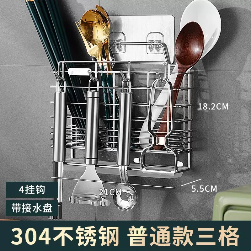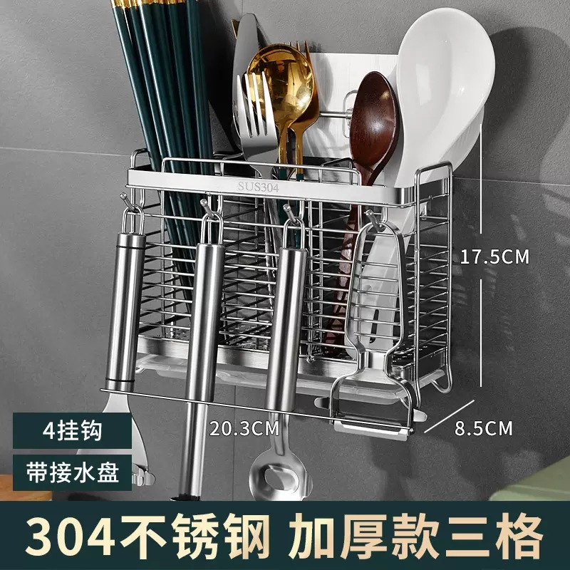 엄선된 304 스테인리스 스틸 젓가락통, 벽걸이형 무타공 젓가락 바구니, 물빠짐 방지 수납함, 젓가락 보관함