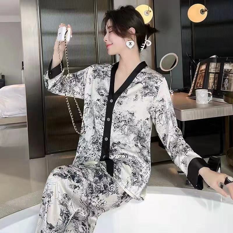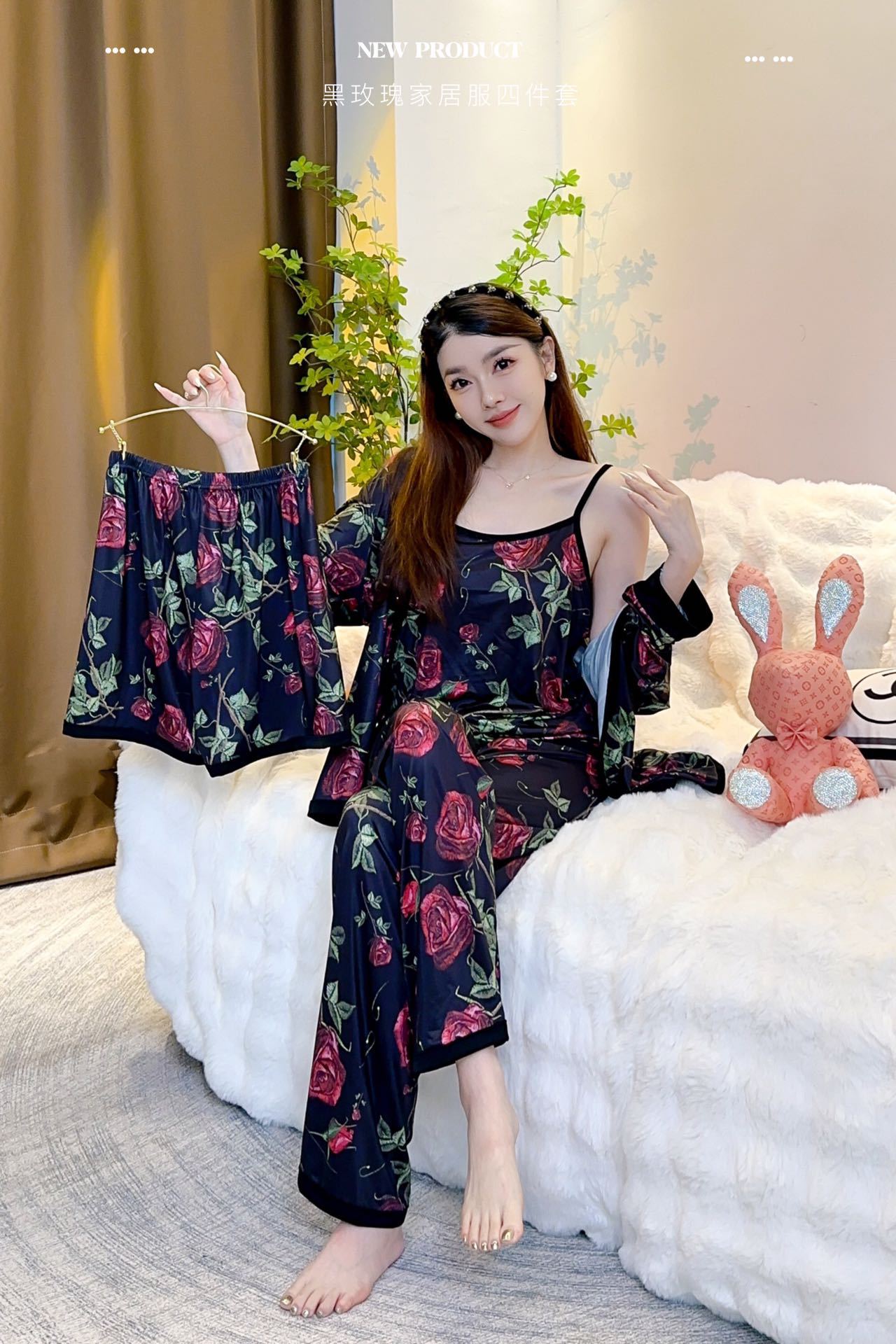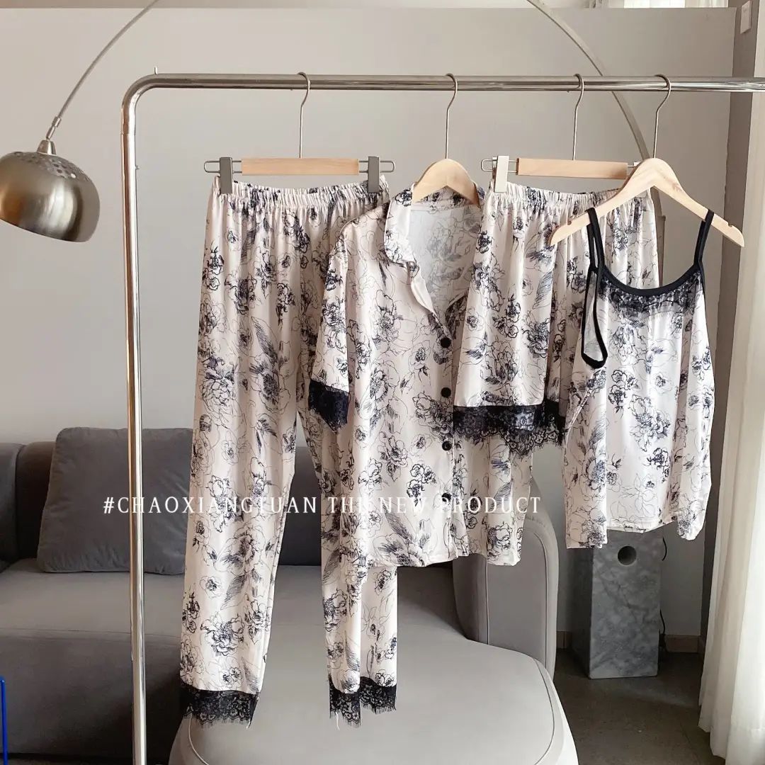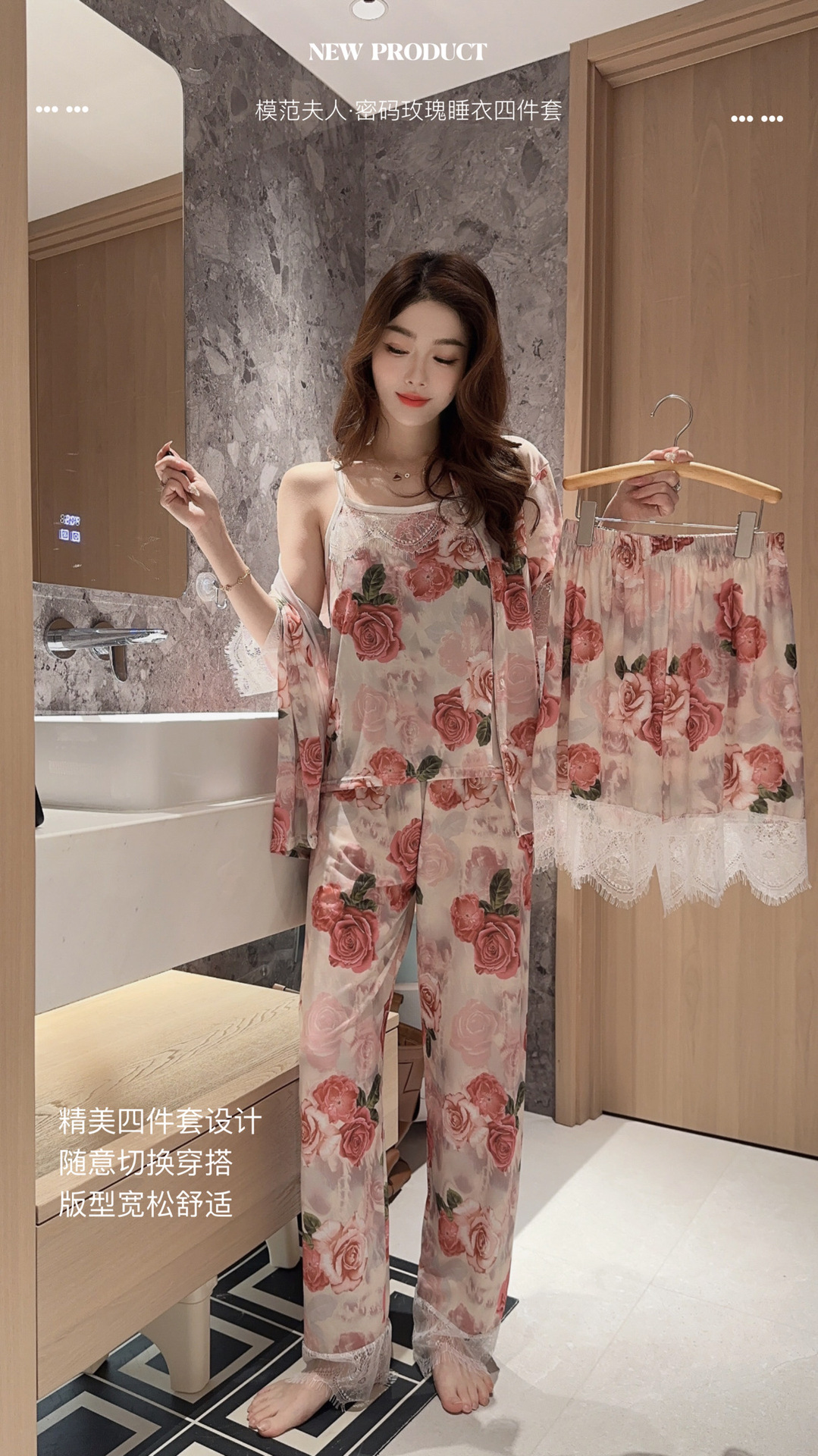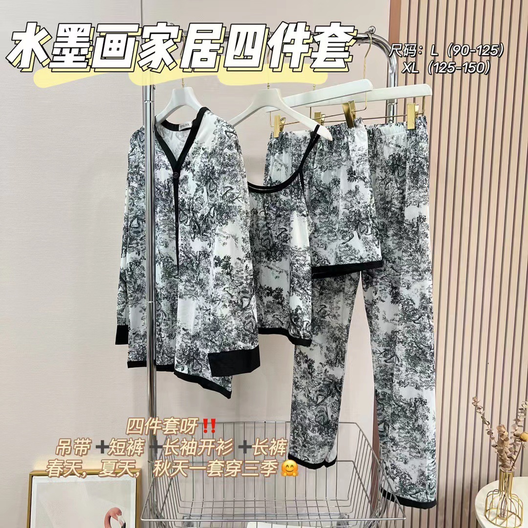 장미꽃 잠옷 4종 세트, 새로운 아이스 실크 수묵화 스타일, 편안하고 루즈하며 외출복으로도 착용 가능한 여성 홈웨어, 여름용스토어 가기