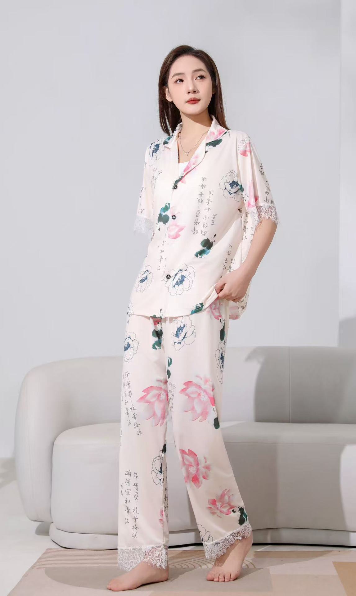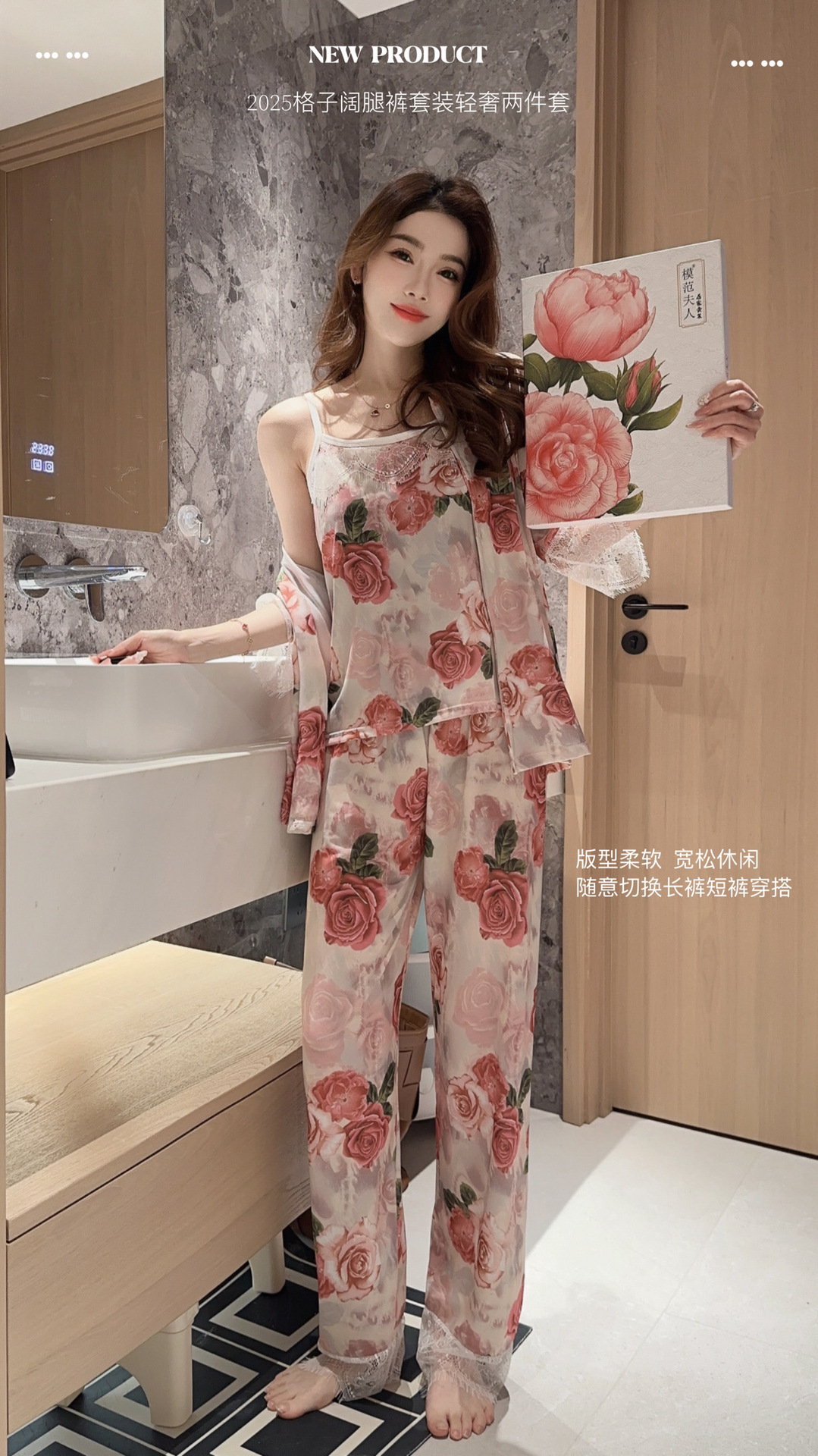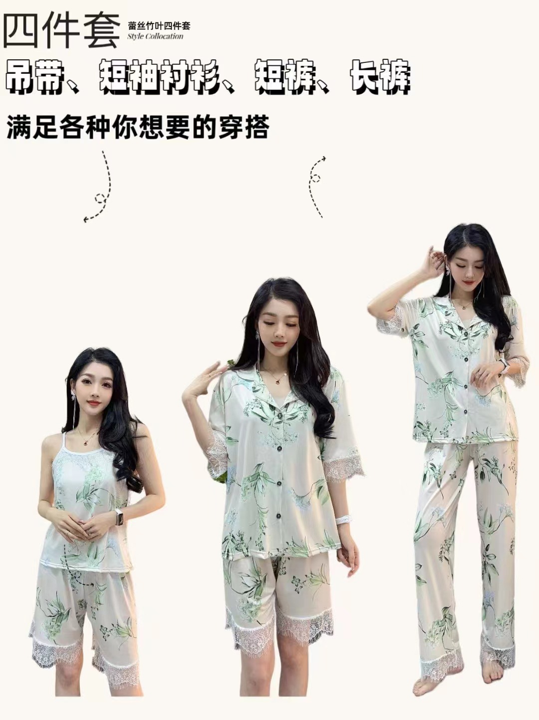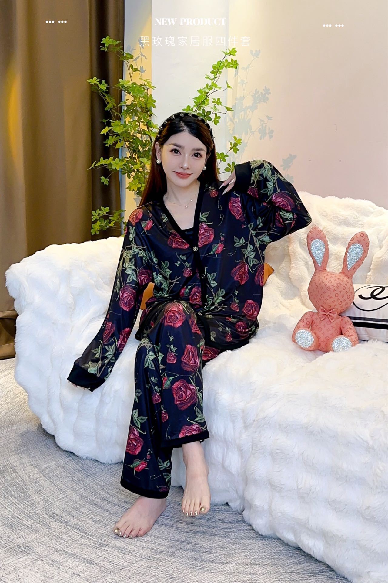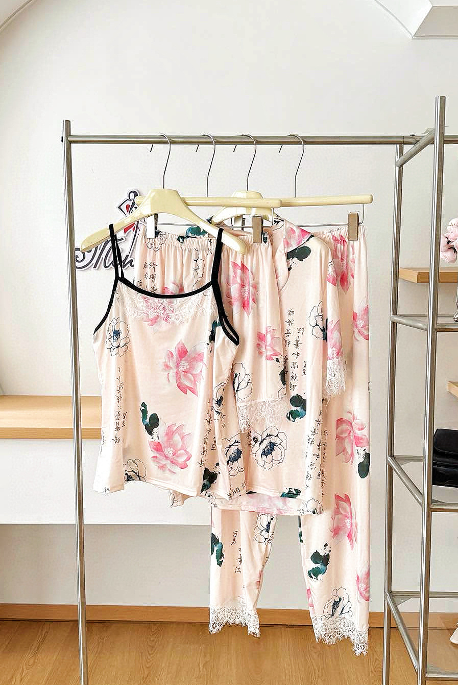 장미꽃 잠옷 4종 세트, 새로운 아이스 실크 수묵화 스타일, 편안하고 루즈하며 외출복으로도 착용 가능한 여성 홈웨어, 여름용스토어 가기