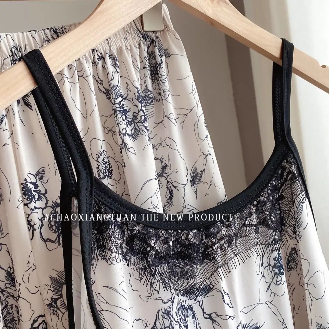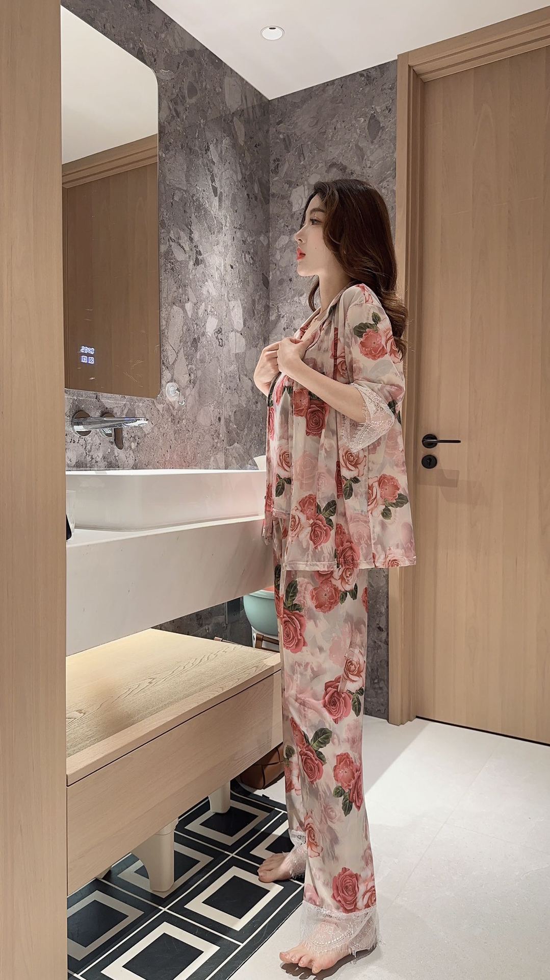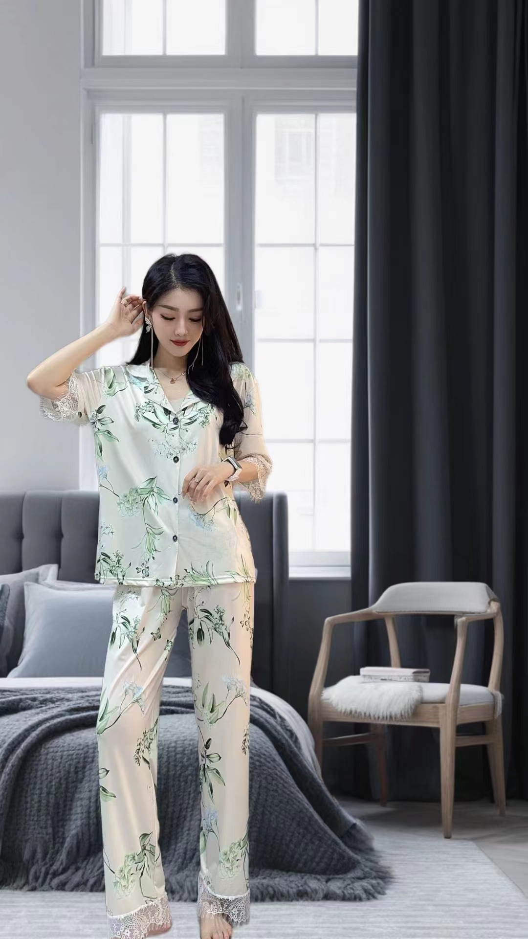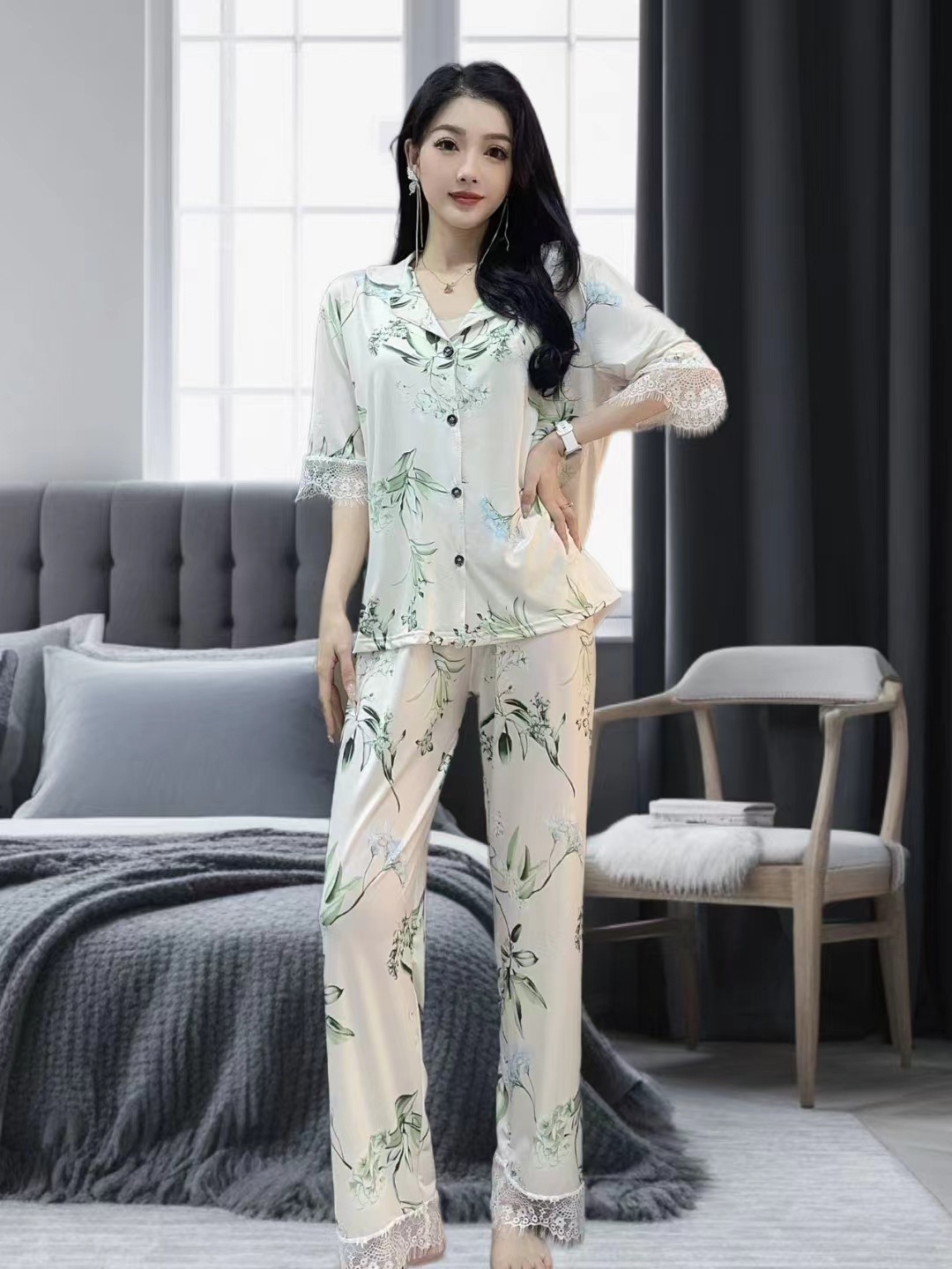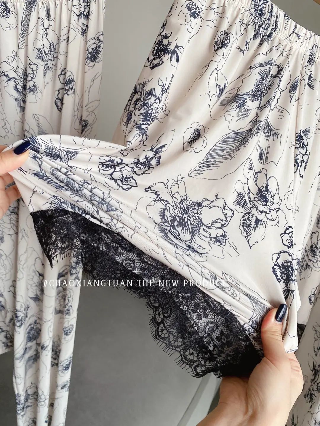 장미꽃 잠옷 4종 세트, 새로운 아이스 실크 수묵화 스타일, 편안하고 루즈하며 외출복으로도 착용 가능한 여성 홈웨어, 여름용스토어 가기