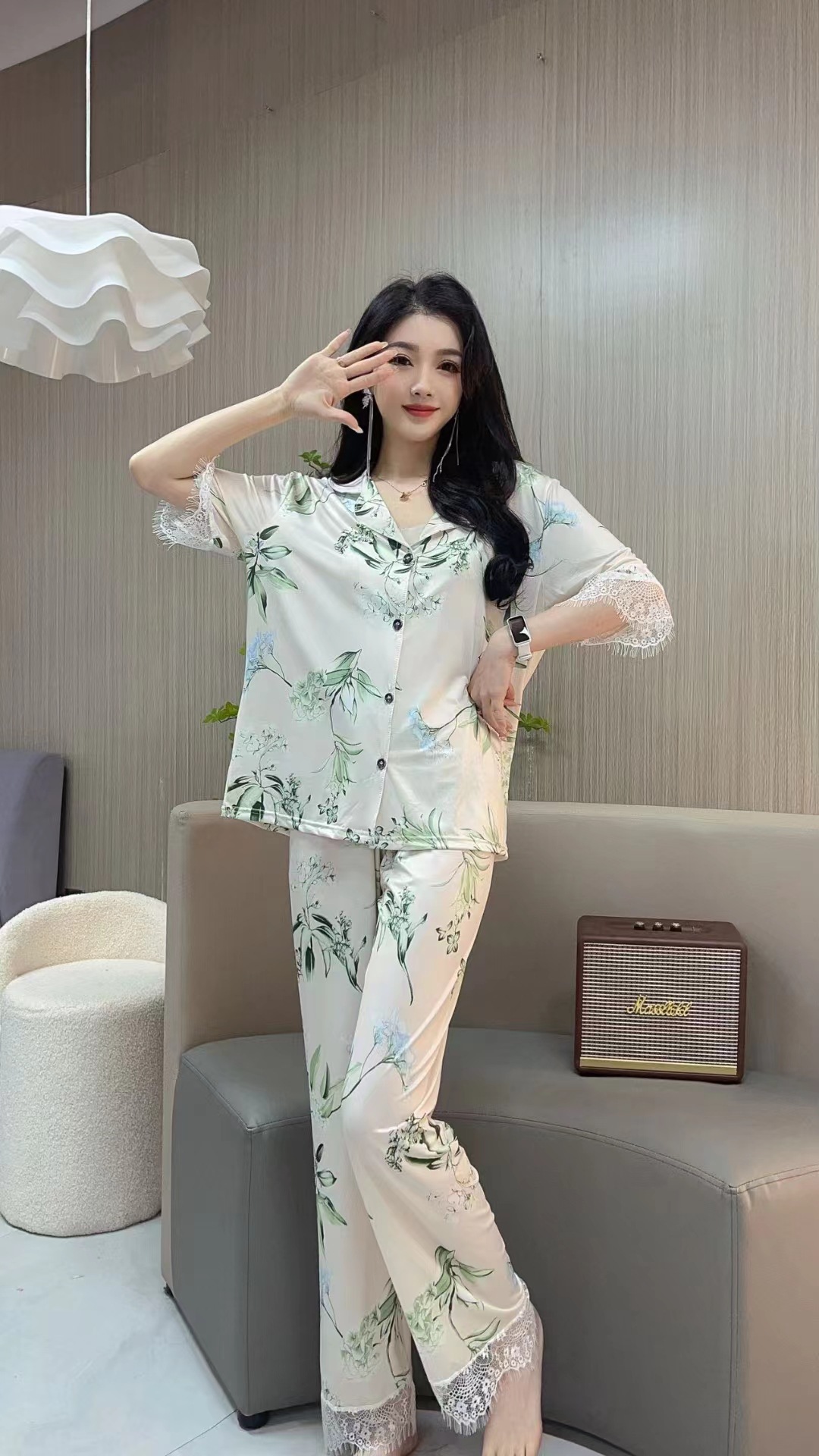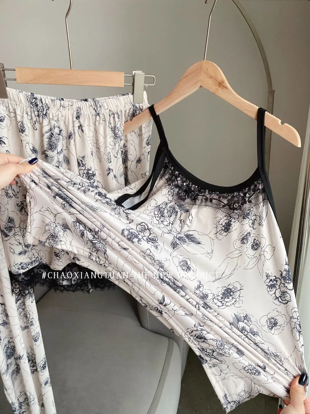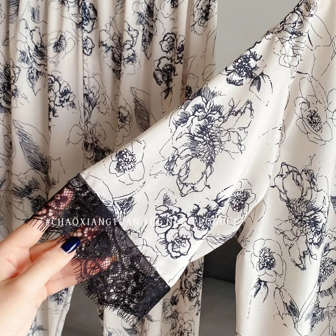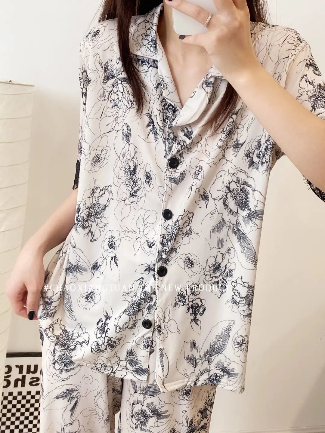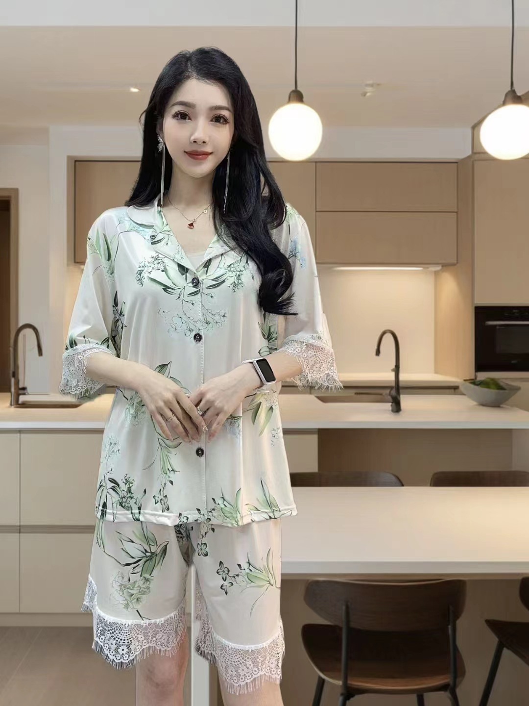 장미꽃 잠옷 4종 세트, 새로운 아이스 실크 수묵화 스타일, 편안하고 루즈하며 외출복으로도 착용 가능한 여성 홈웨어, 여름용스토어 가기