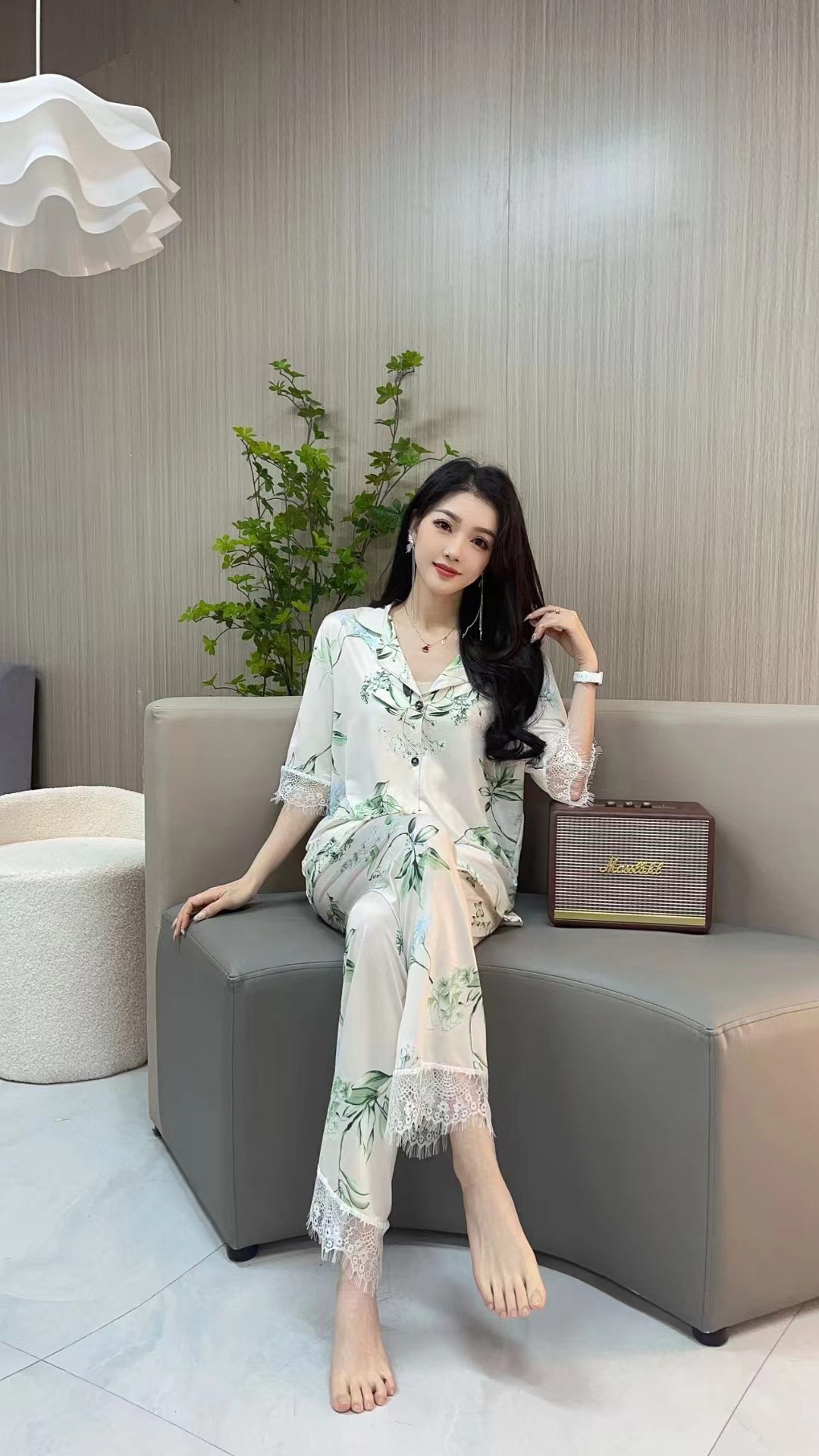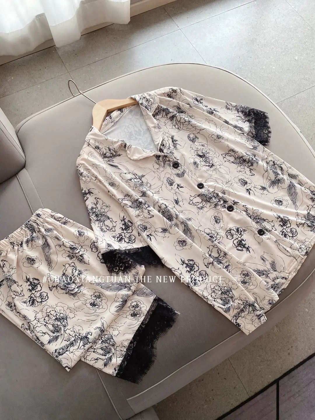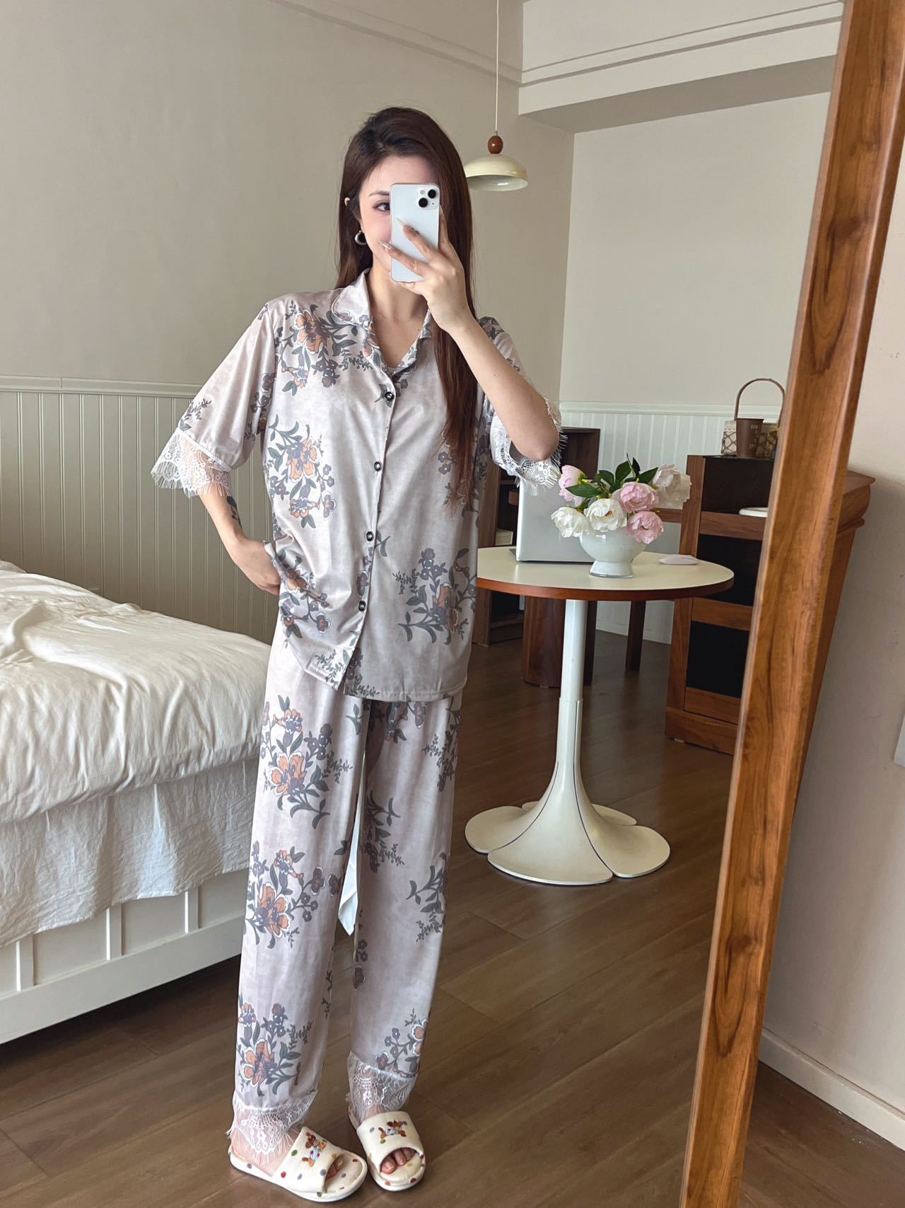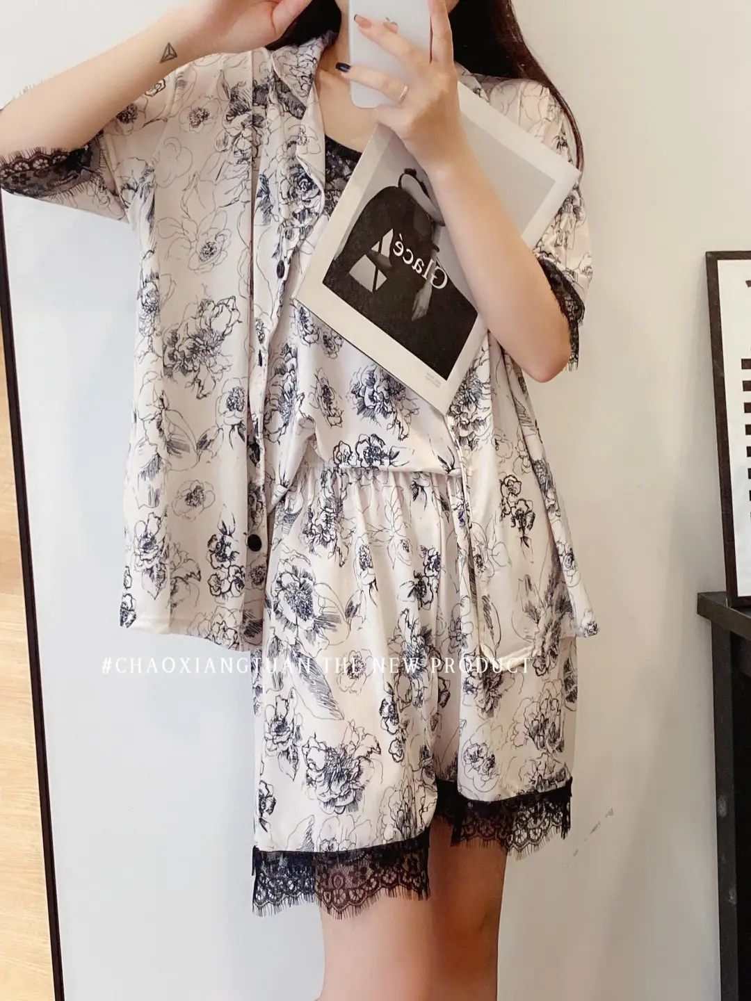 장미꽃 잠옷 4종 세트, 새로운 아이스 실크 수묵화 스타일, 편안하고 루즈하며 외출복으로도 착용 가능한 여성 홈웨어, 여름용스토어 가기