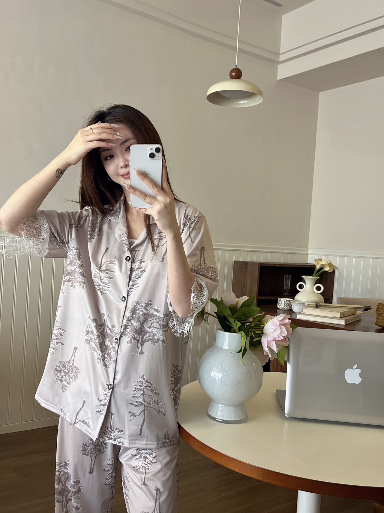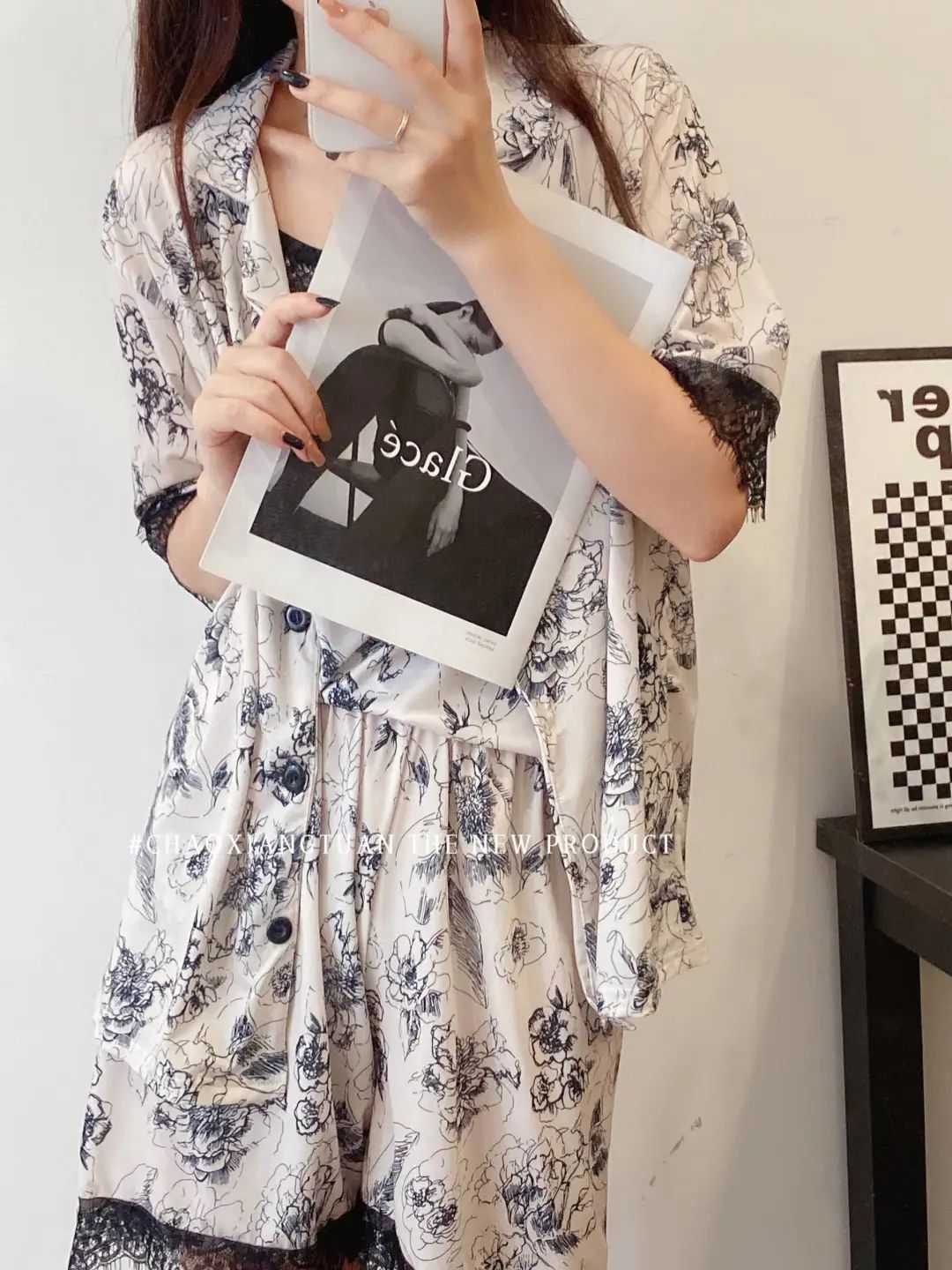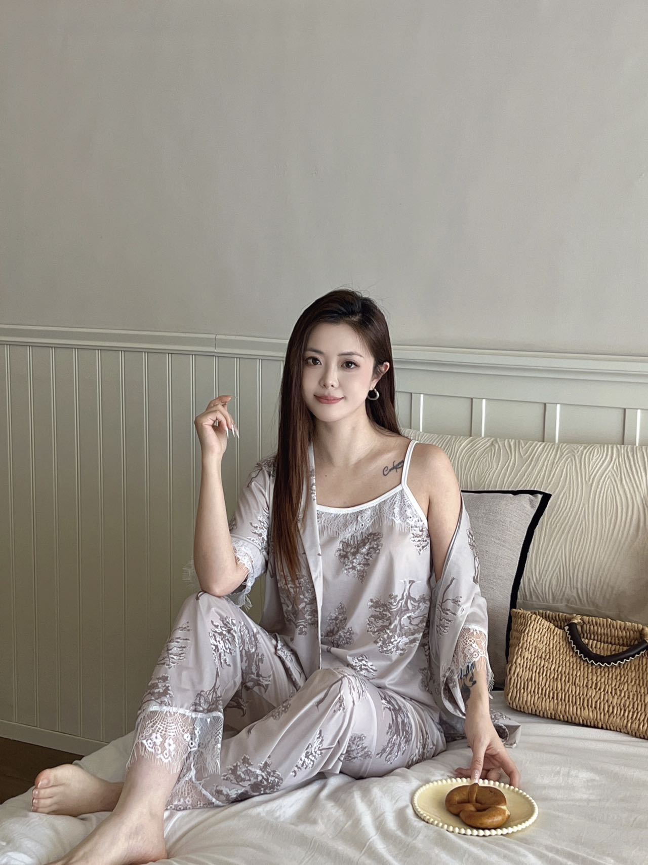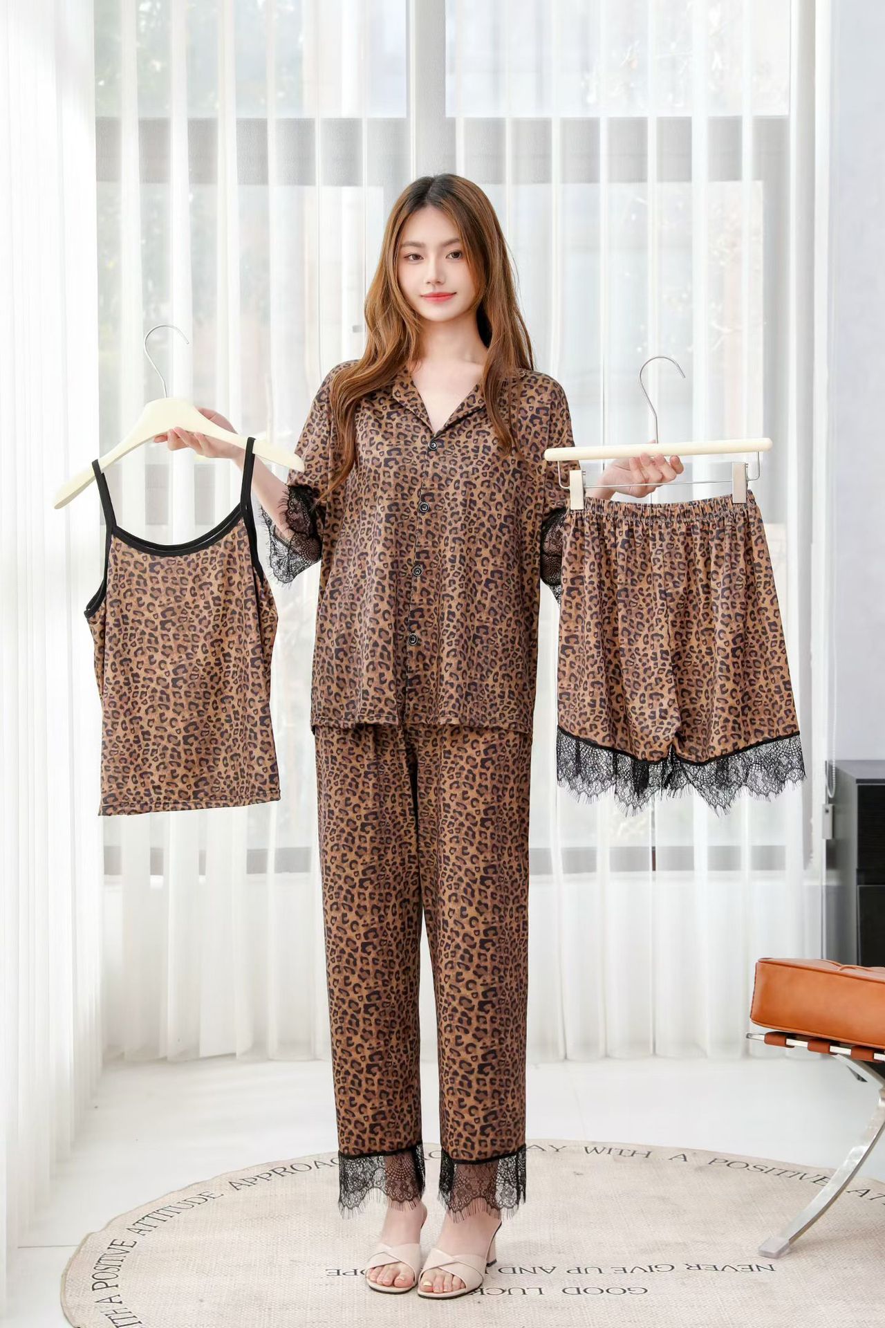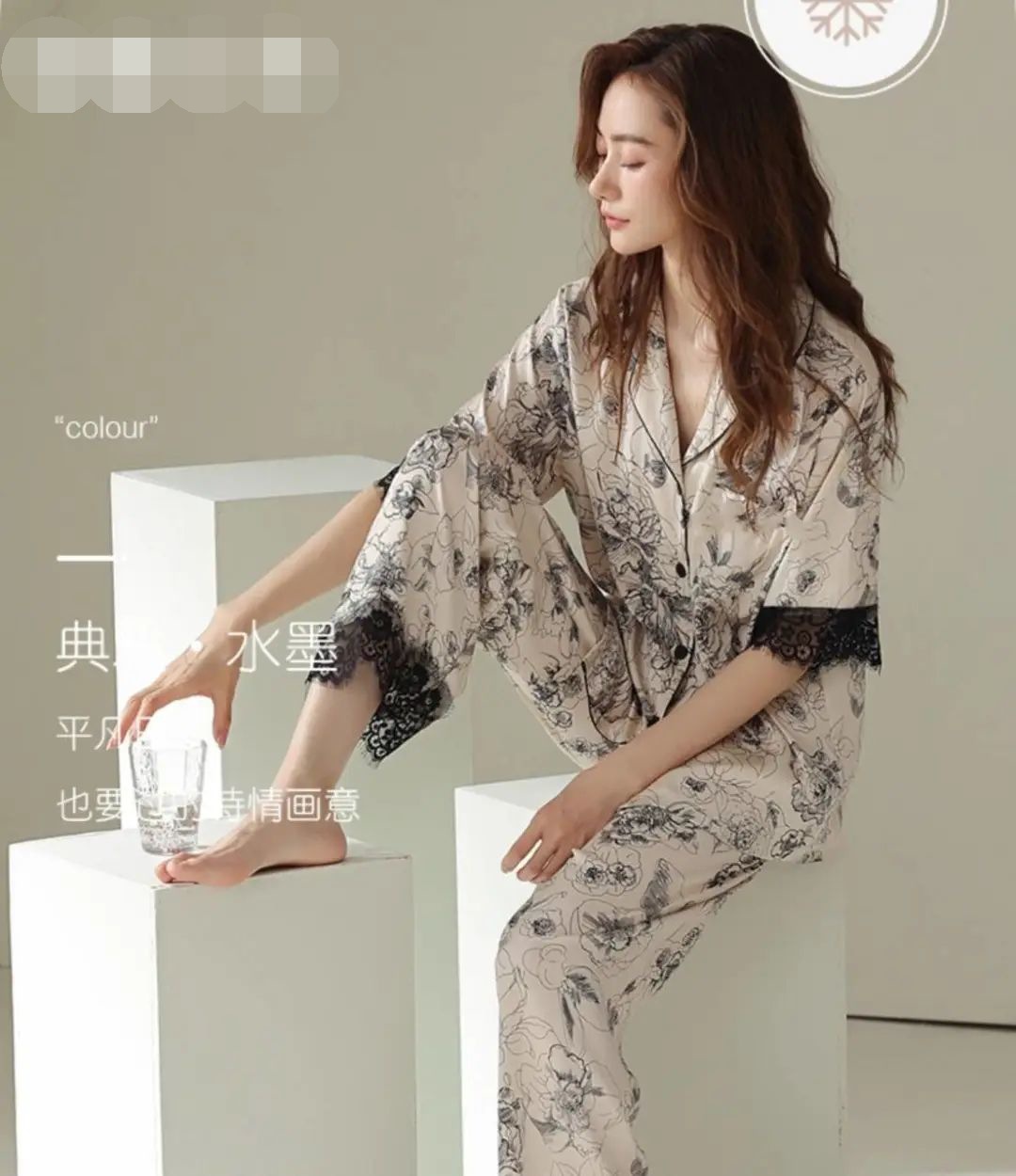 장미꽃 잠옷 4종 세트, 새로운 아이스 실크 수묵화 스타일, 편안하고 루즈하며 외출복으로도 착용 가능한 여성 홈웨어, 여름용스토어 가기