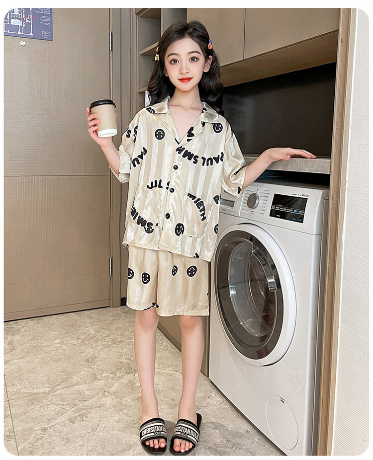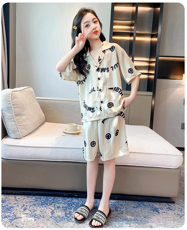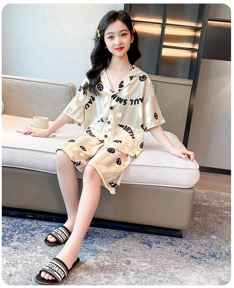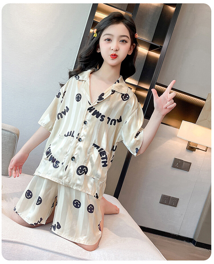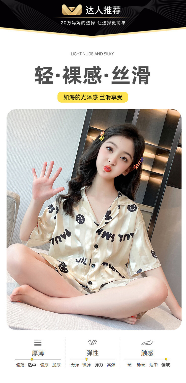 2023 세트 여아 반팔 가정복 아이스 실크 얇은 잠옷 아동 캐주얼 에어컨 셔츠 투피스 세트