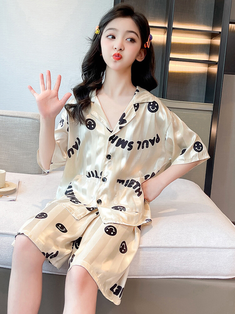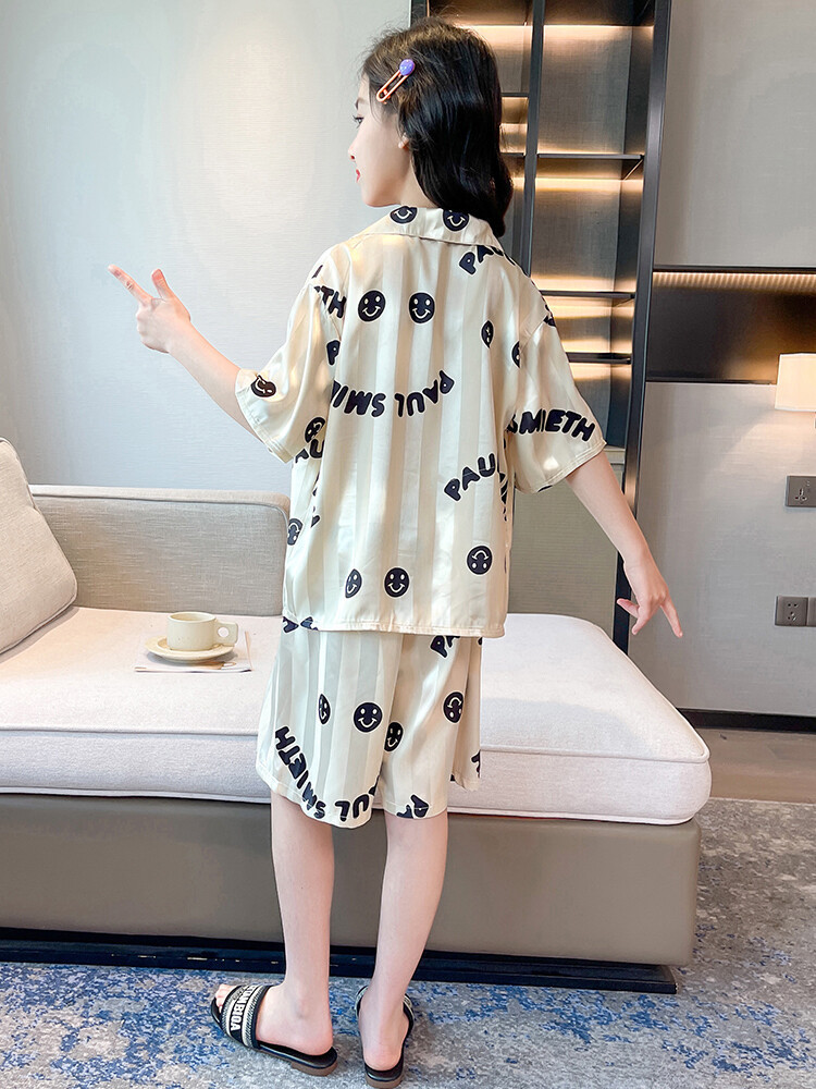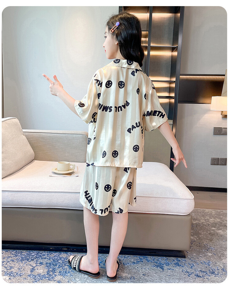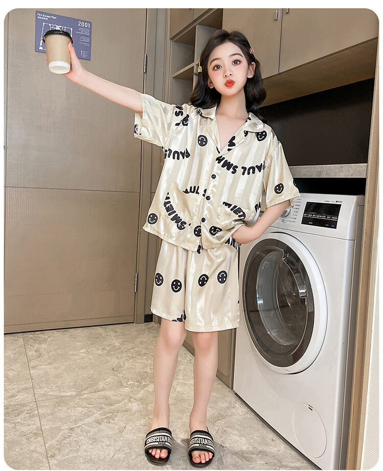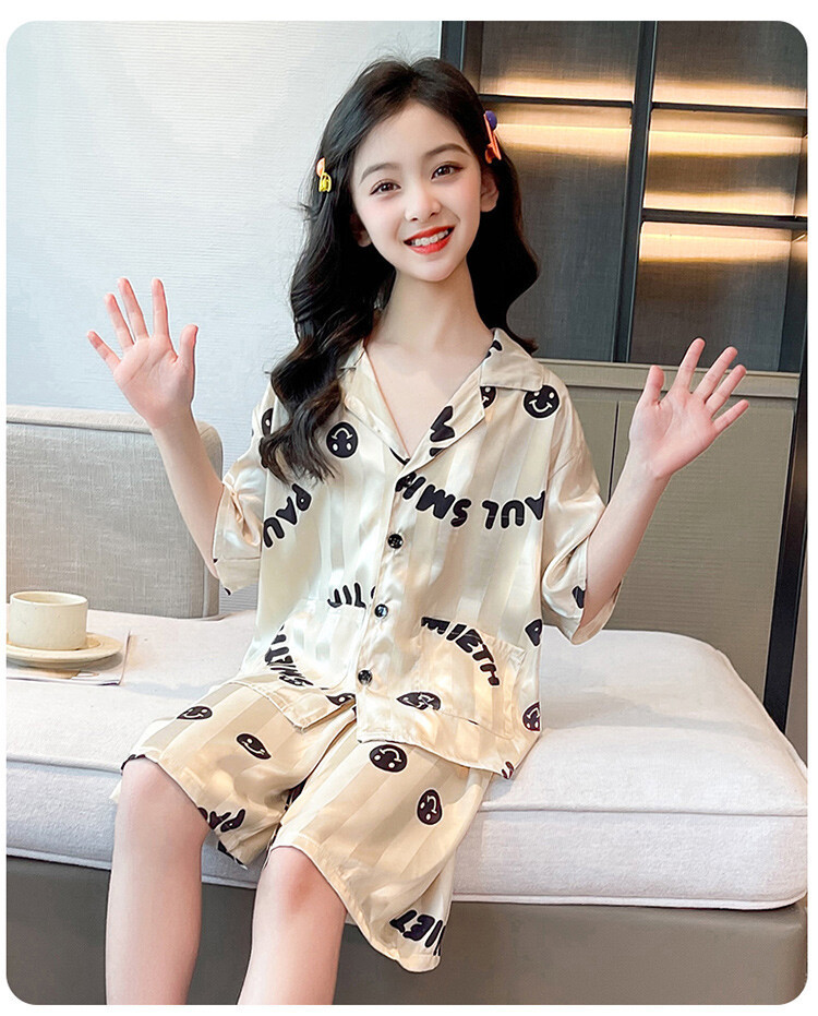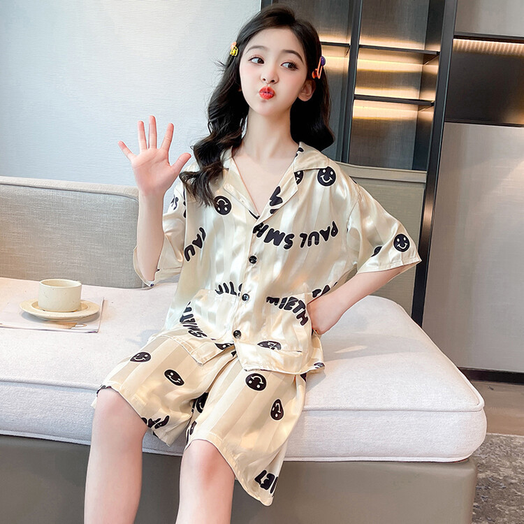 2023 세트 여아 반팔 가정복 아이스 실크 얇은 잠옷 아동 캐주얼 에어컨 셔츠 투피스 세트