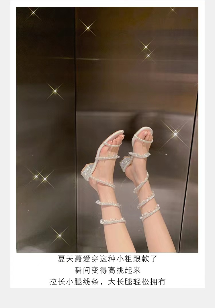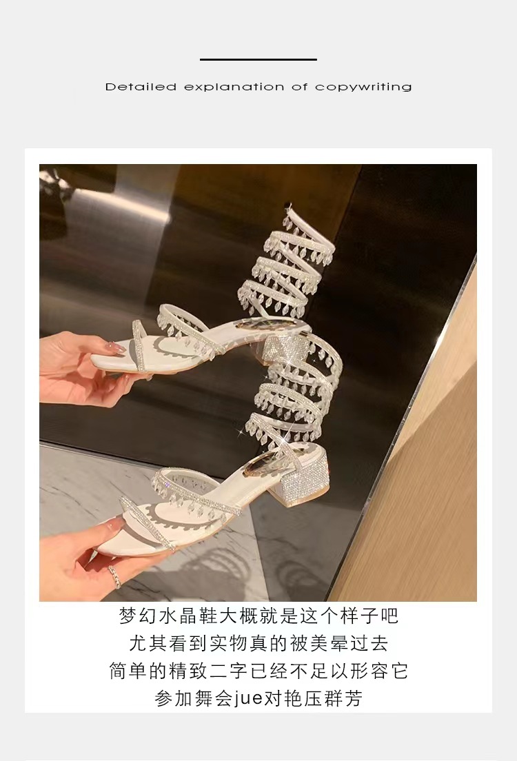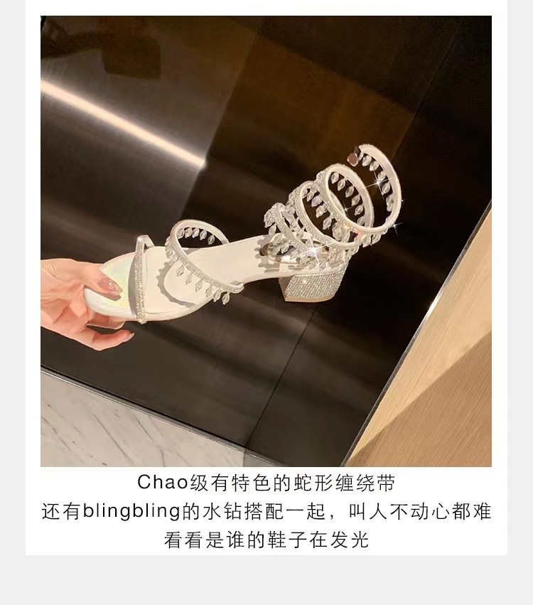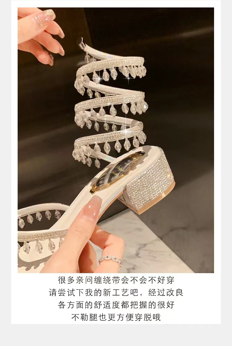 포도 엄마 같은 스타일 프랑스 얕은 입 아름다운 크리스탈 펜던트 뱀 모양의 라인 석 청키 힐 여성용 여름 샌들스토어 가기