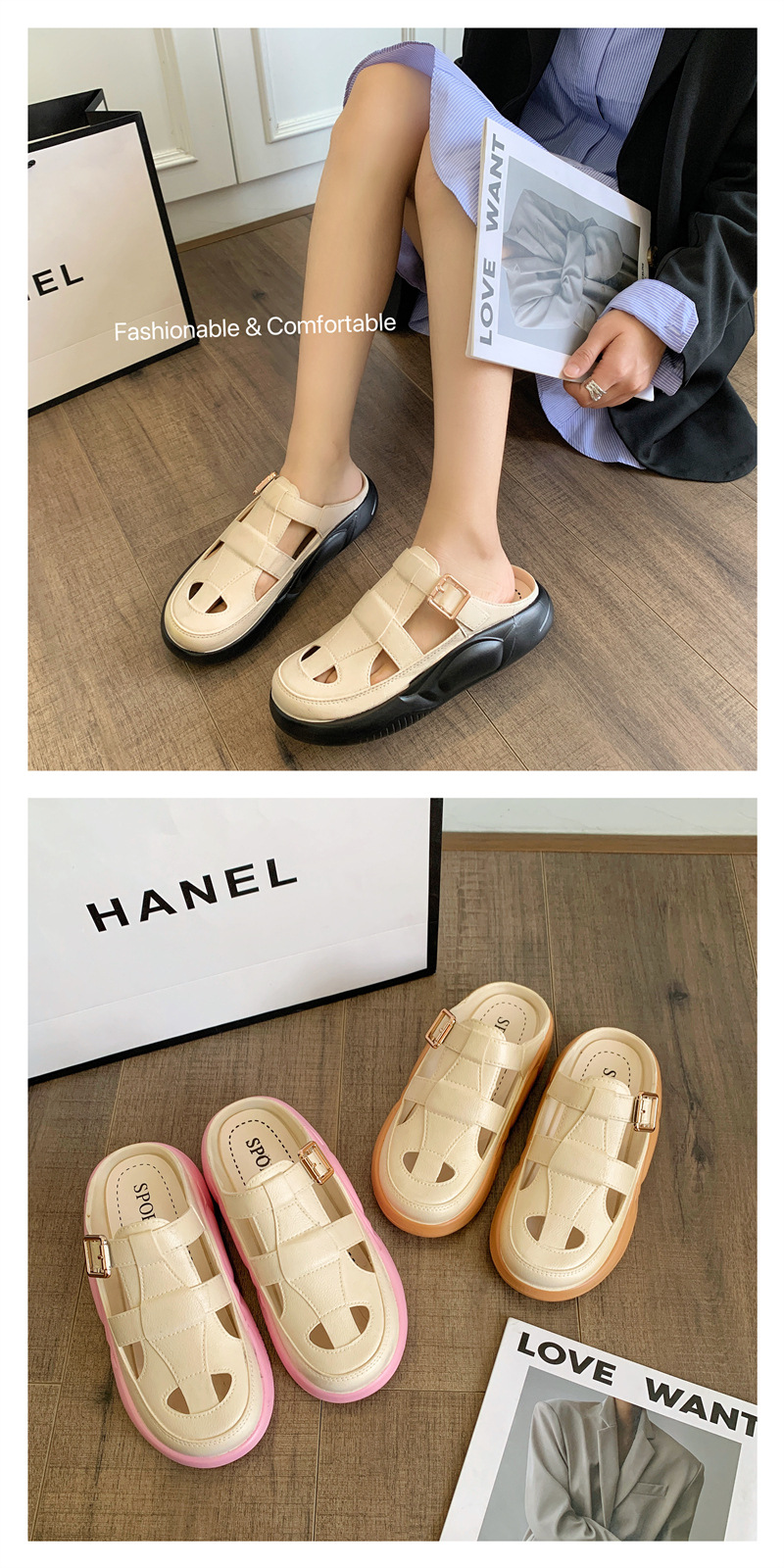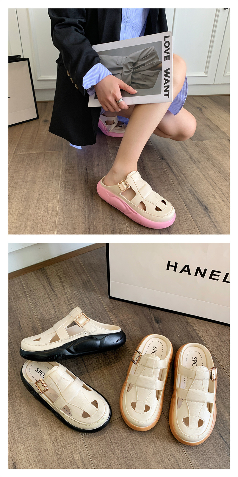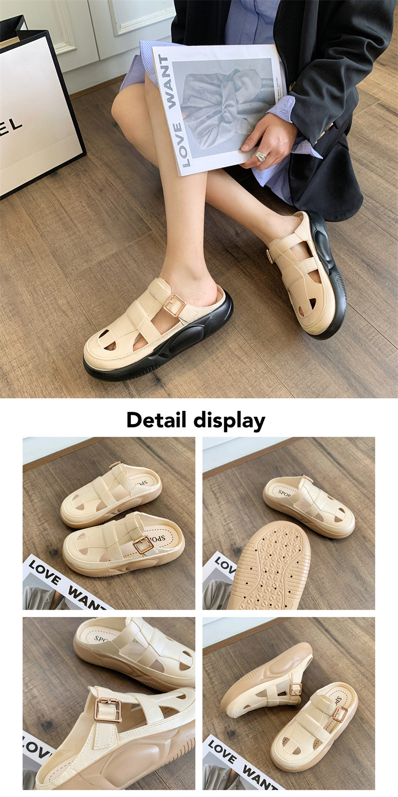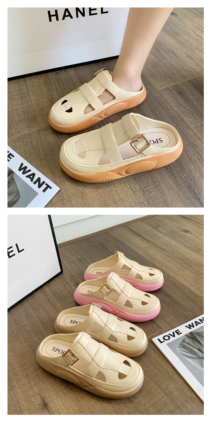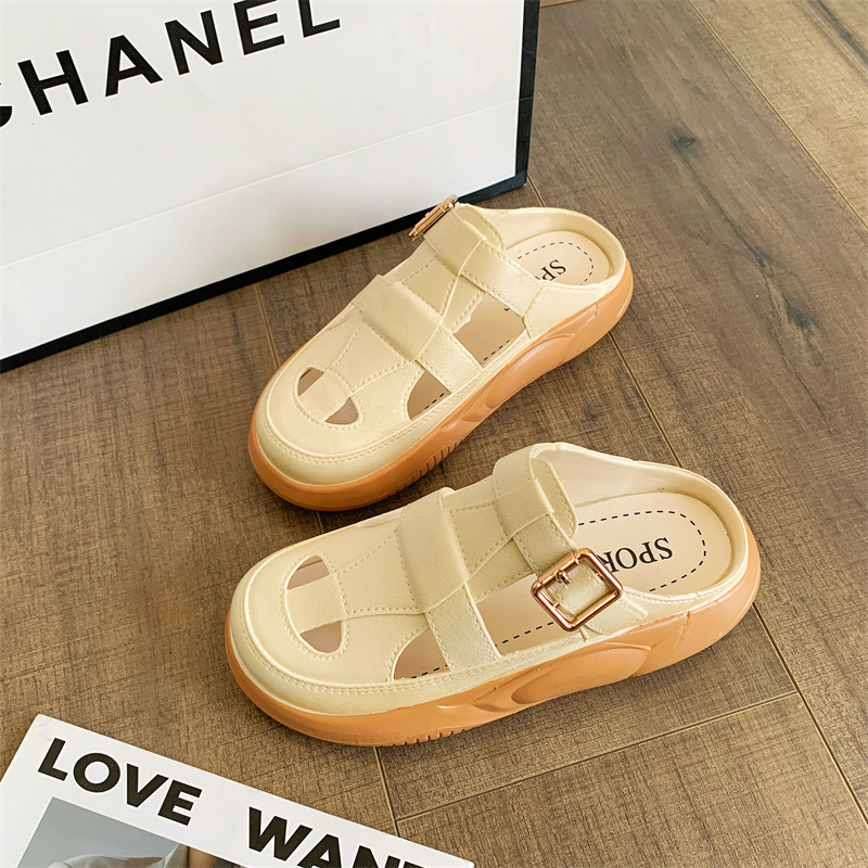 Hori Shark 새로운 두꺼운 슬리퍼 여성용 패션 중공 색상 매칭 비치 샌들 여름 겉옷 캐주얼 하프 슬리퍼