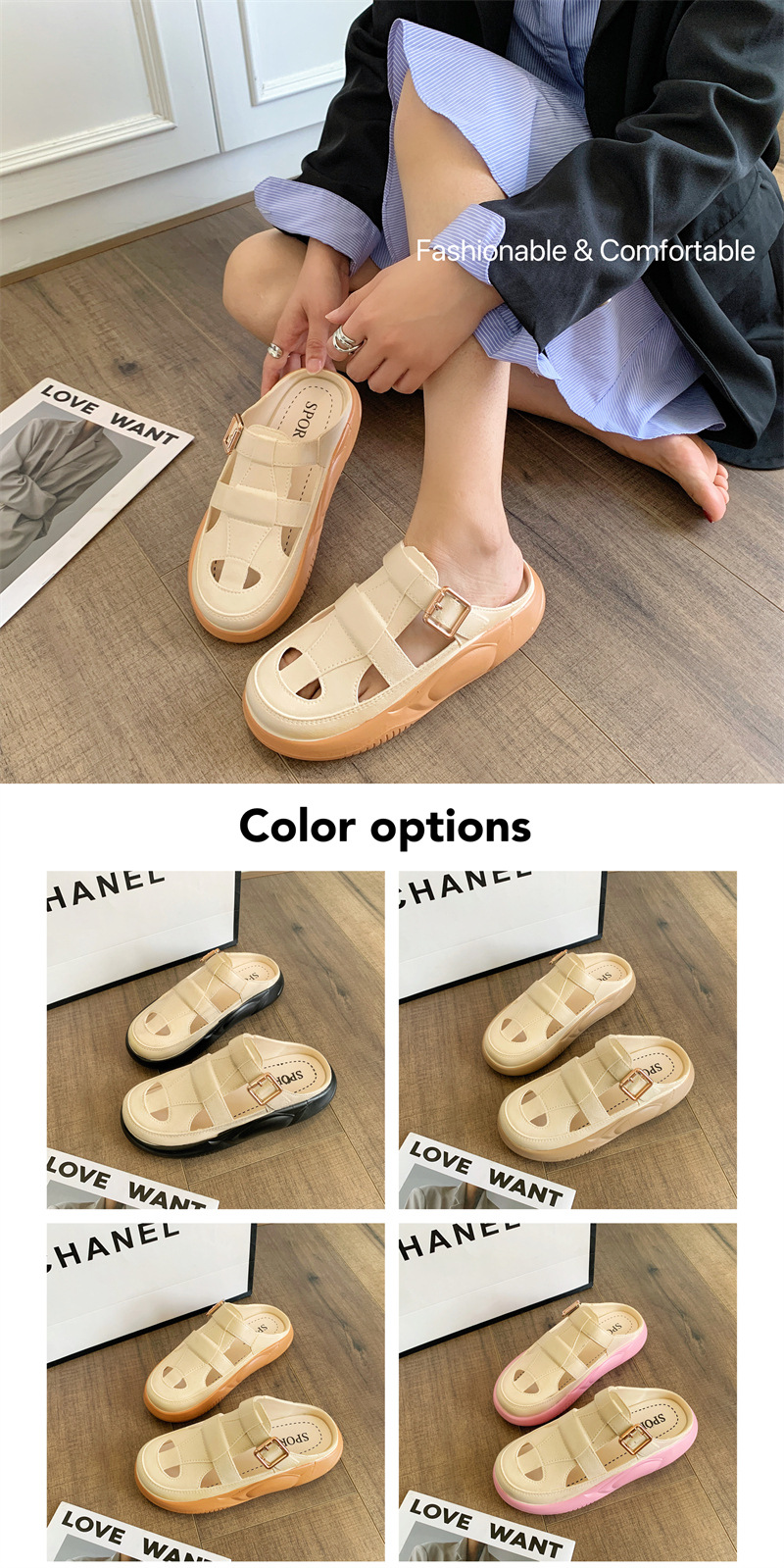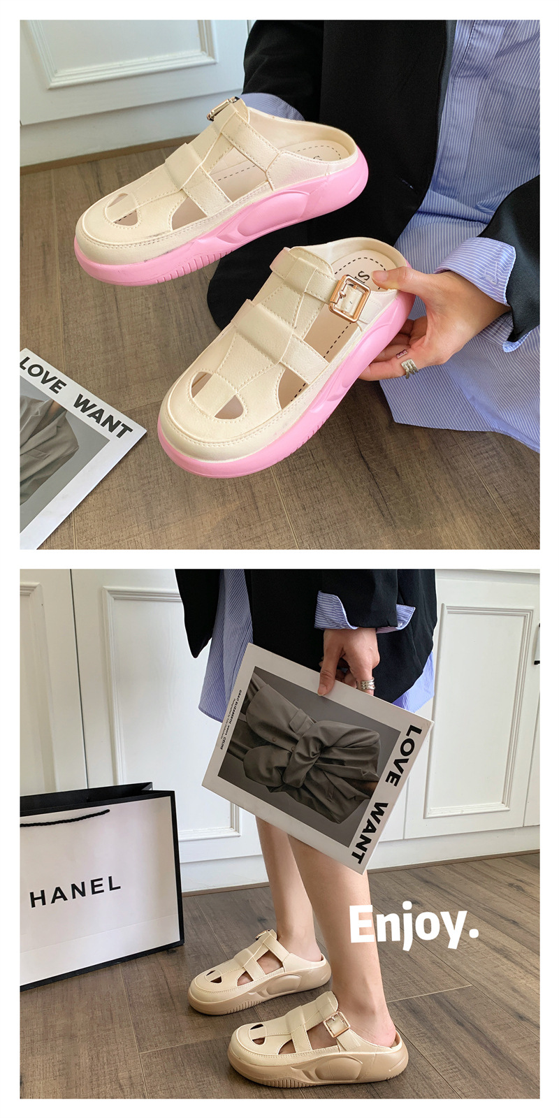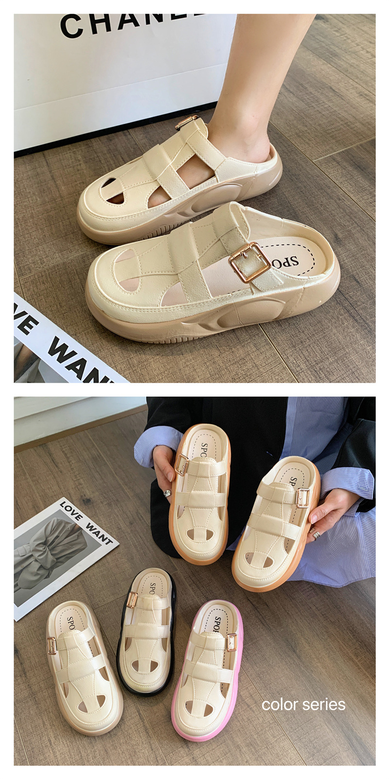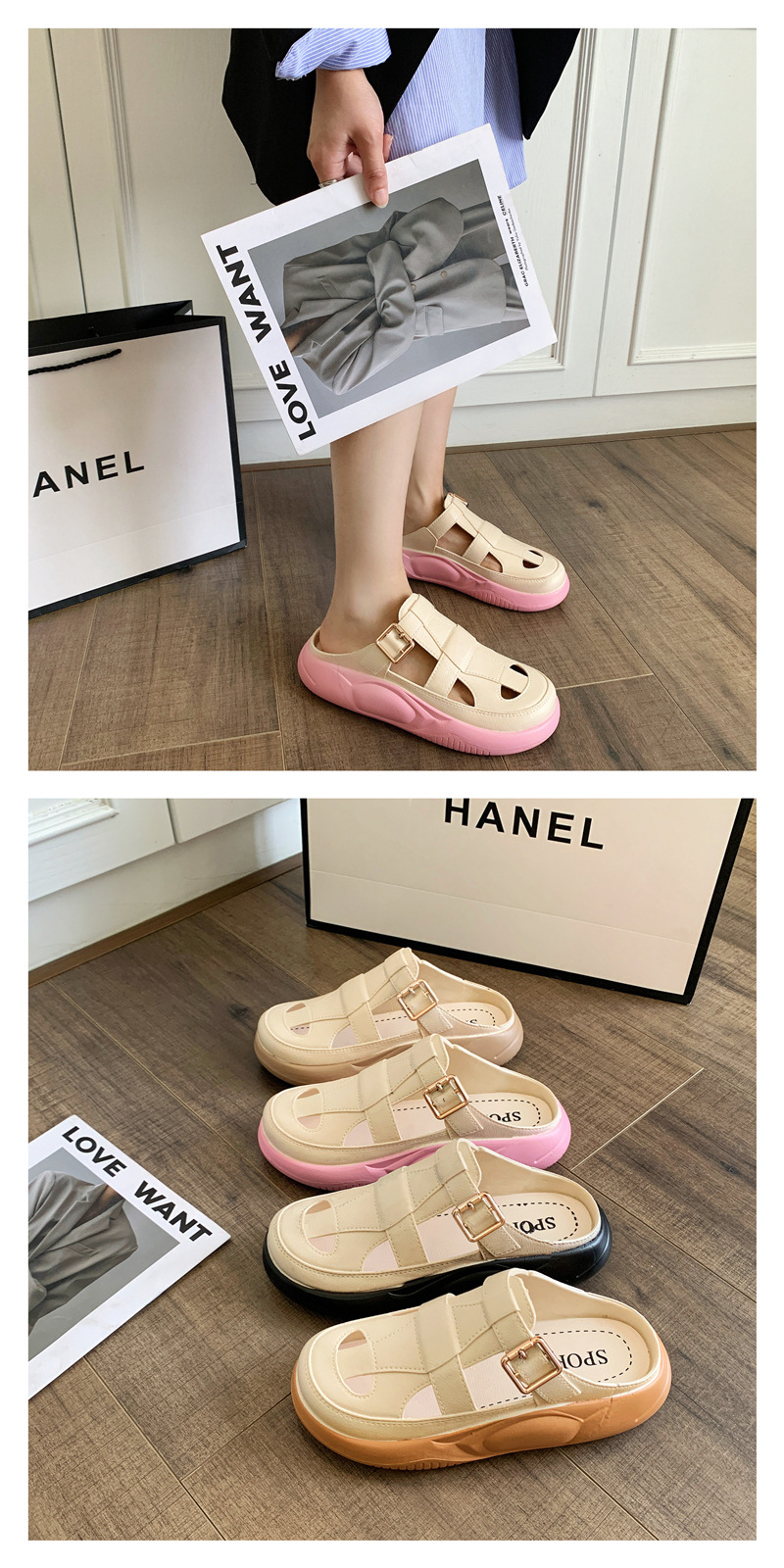 Hori Shark 새로운 두꺼운 슬리퍼 여성용 패션 중공 색상 매칭 비치 샌들 여름 겉옷 캐주얼 하프 슬리퍼