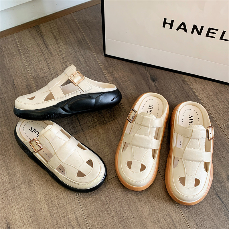 Hori Shark 새로운 두꺼운 슬리퍼 여성용 패션 중공 색상 매칭 비치 샌들 여름 겉옷 캐주얼 하프 슬리퍼스토어 가기
